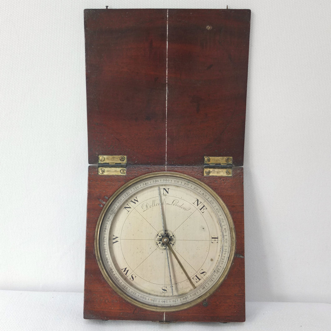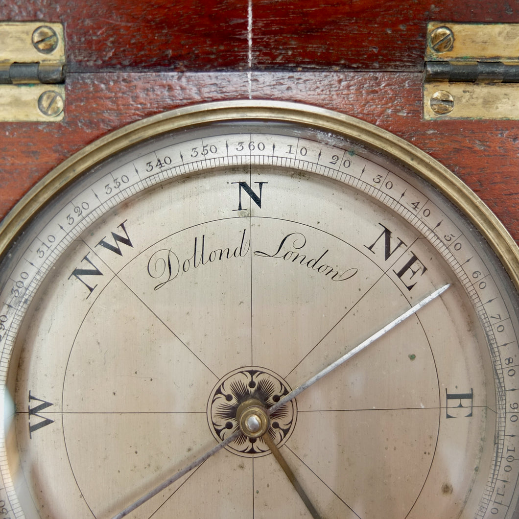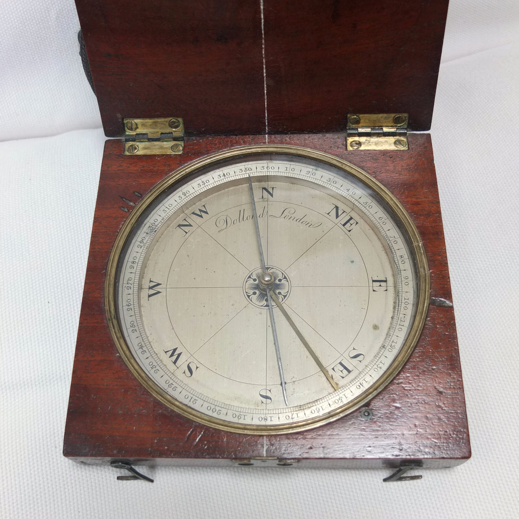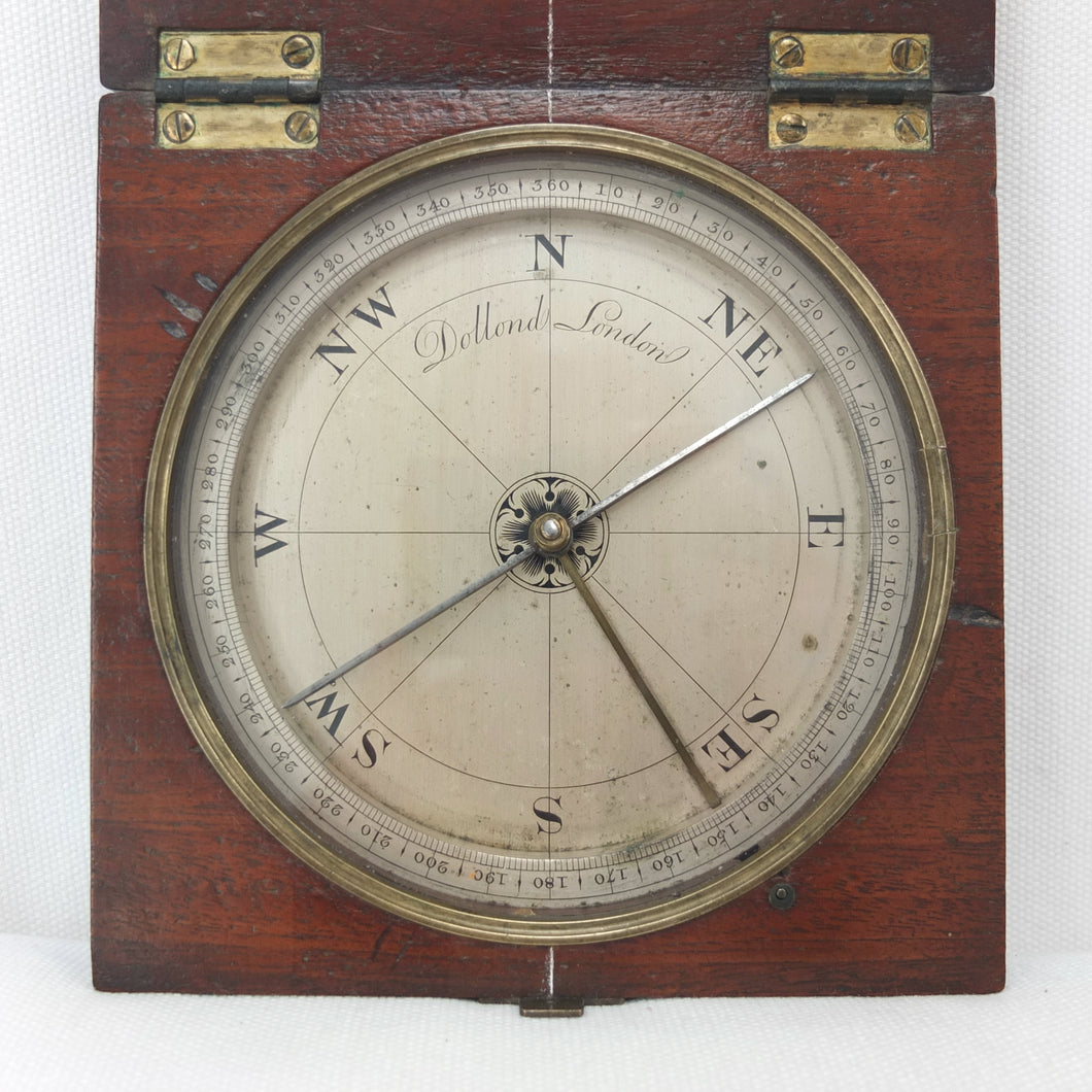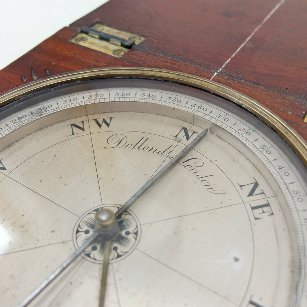 A rare Georgian mahogany cased compass, made in London by Dollond c.1790. The compass is signed by 'Dollond, London'. This type of wooden cased compass was produced from the middle of the 18th century to the early 19th century. This is a well made and substantial compass, with a large sized mahogany case (145mm x 150mm), silvered and engraved compass card, and English bar needle. There is transit lock, operated by a small pin and lever, which locks the needle when the lid is closed. The compass is in full working order and finds North well.