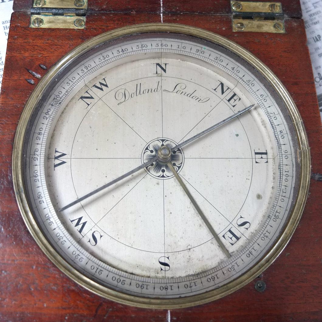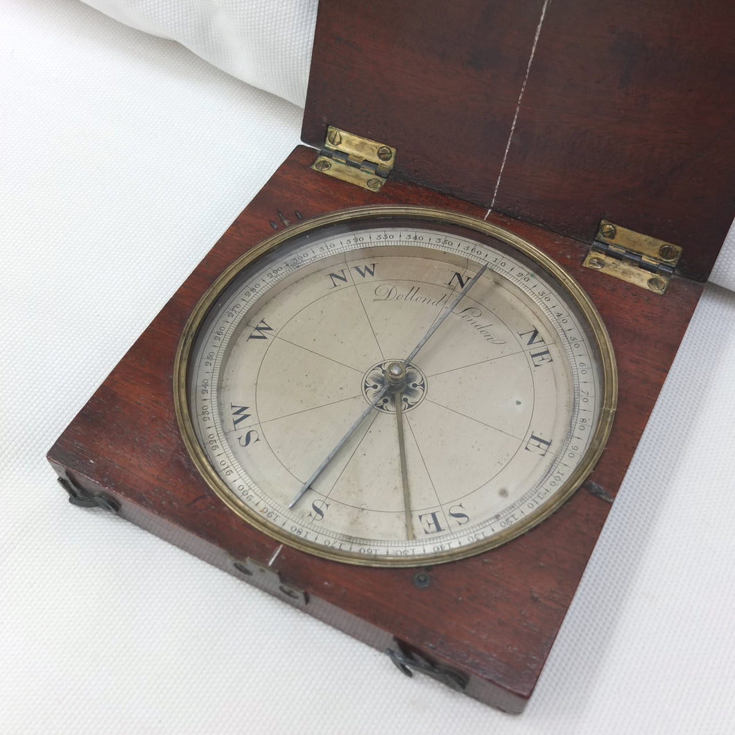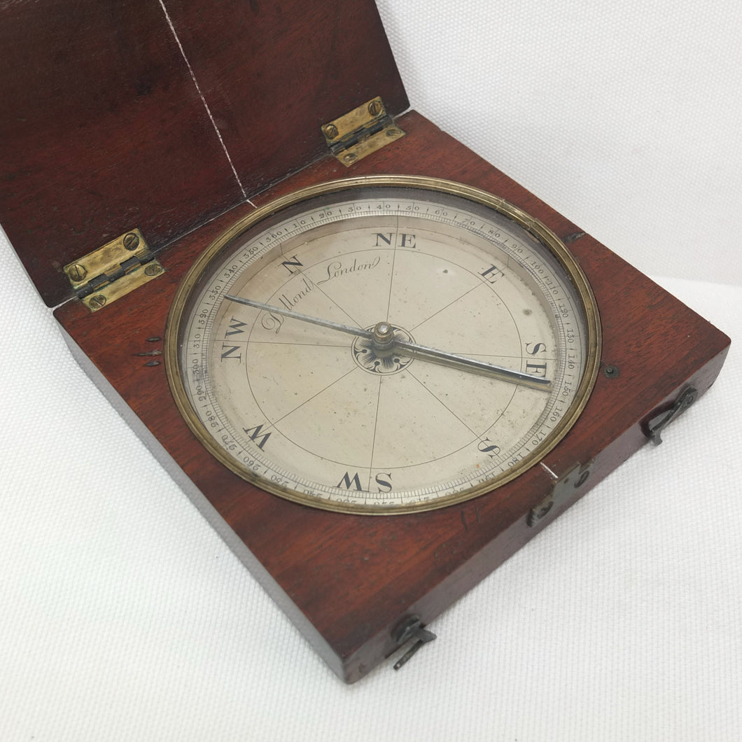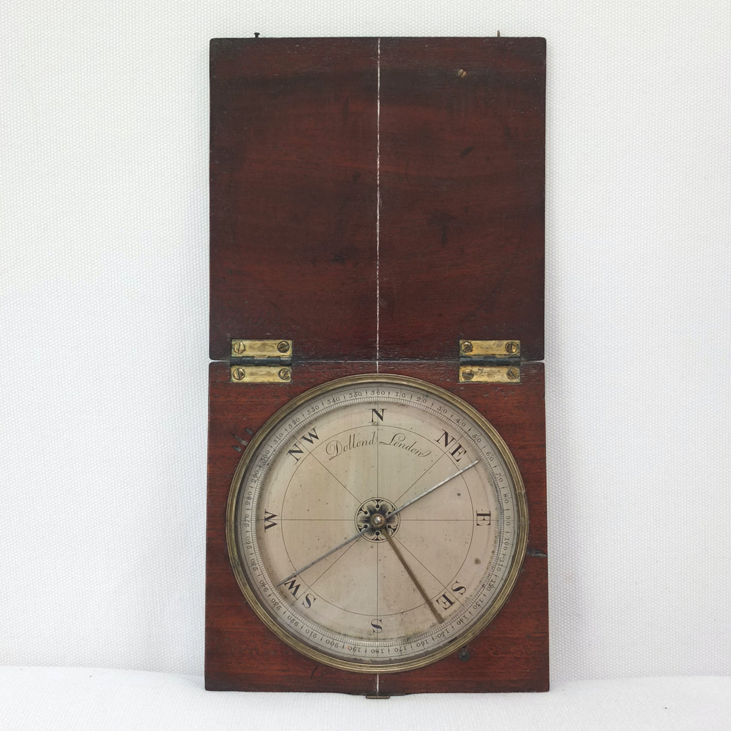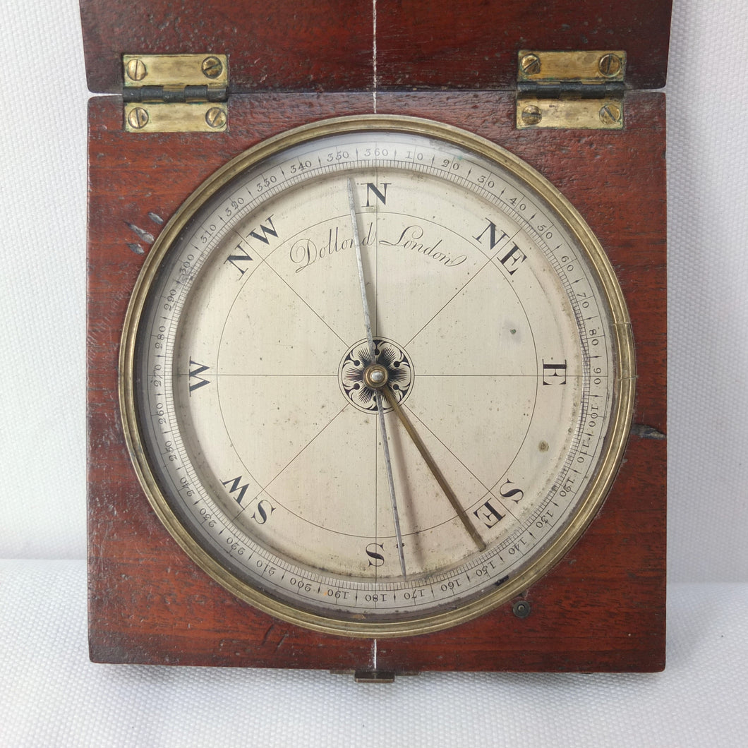A rare Georgian mahogany cased compass, made in London by Dollond c.1790. The compass is signed by 'Dollond, London'. This type of wooden cased compass was produced from the middle of the 18th century to the early 19th century. This is a well made and substantial compass, with a large sized mahogany case (145mm x 150mm), silvered and engraved compass card, and English bar needle. There is transit lock, operated by a small pin and lever, which locks the needle when the lid is closed. The compass is in full working order and finds North well.