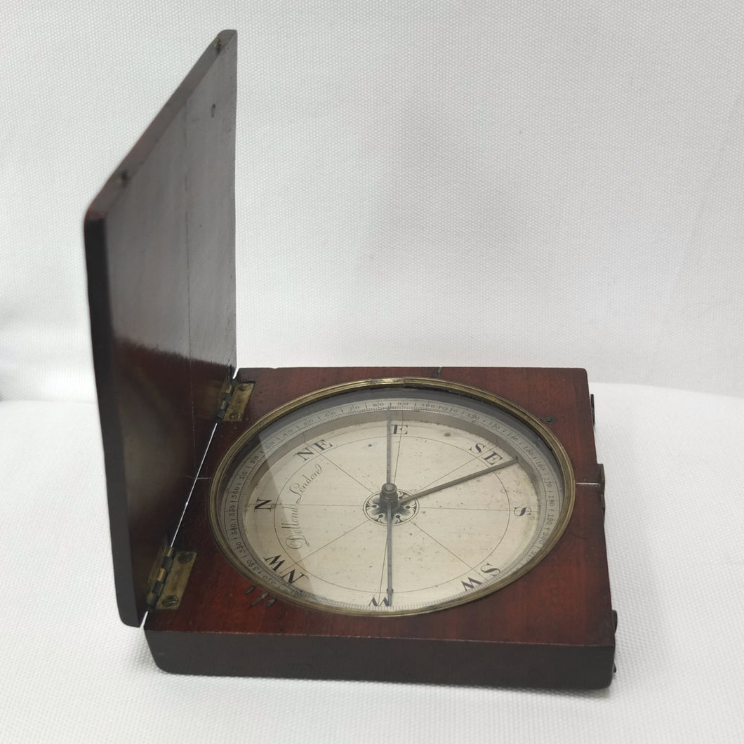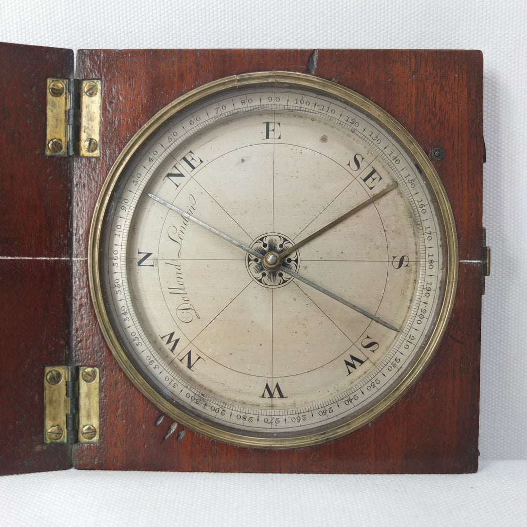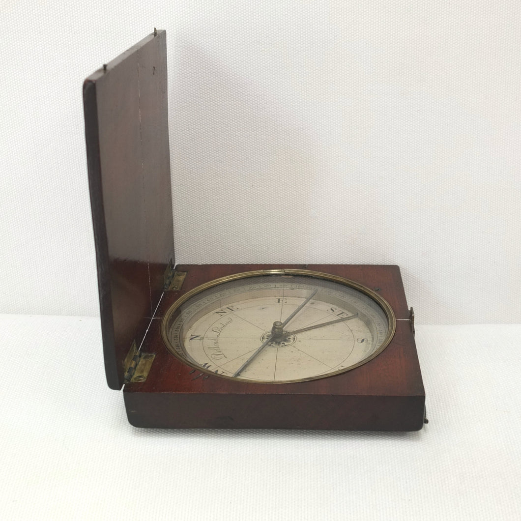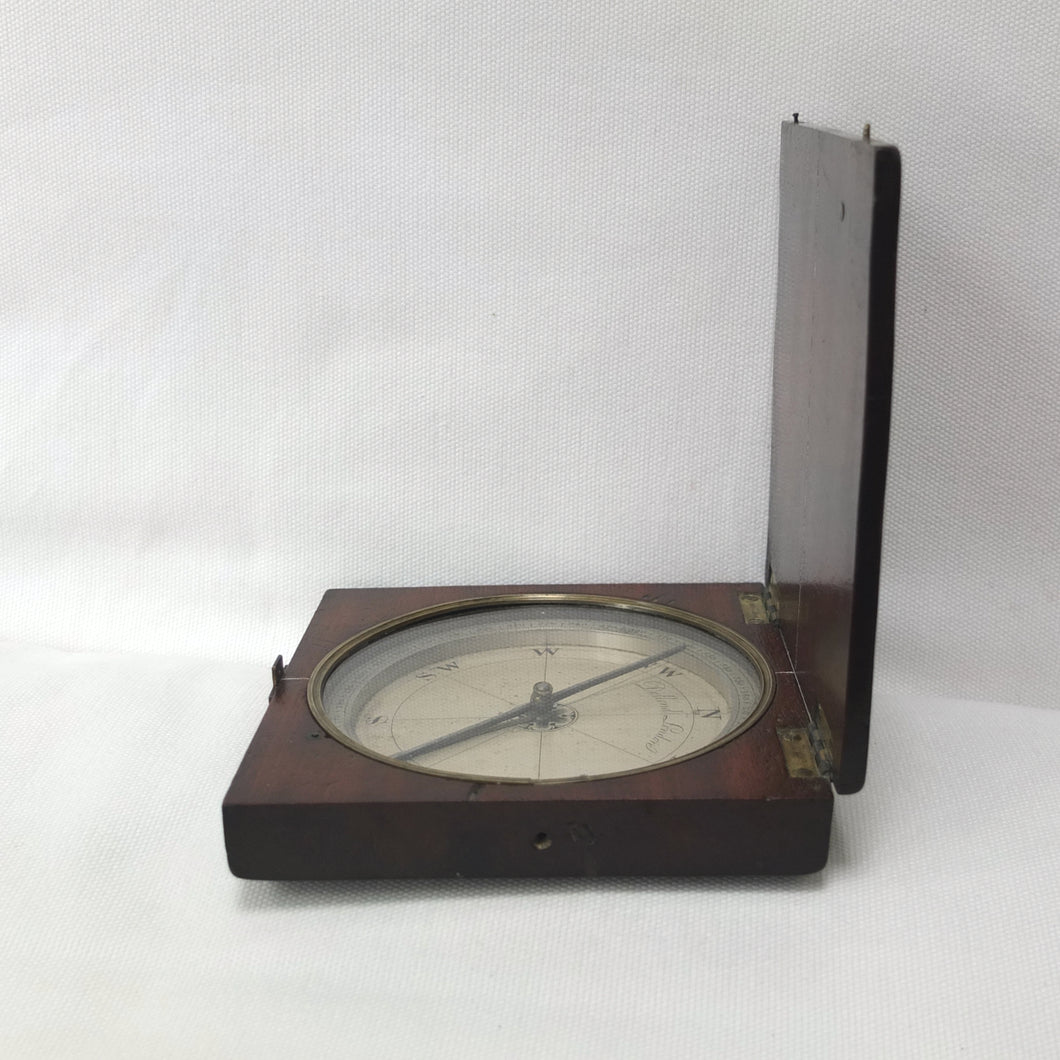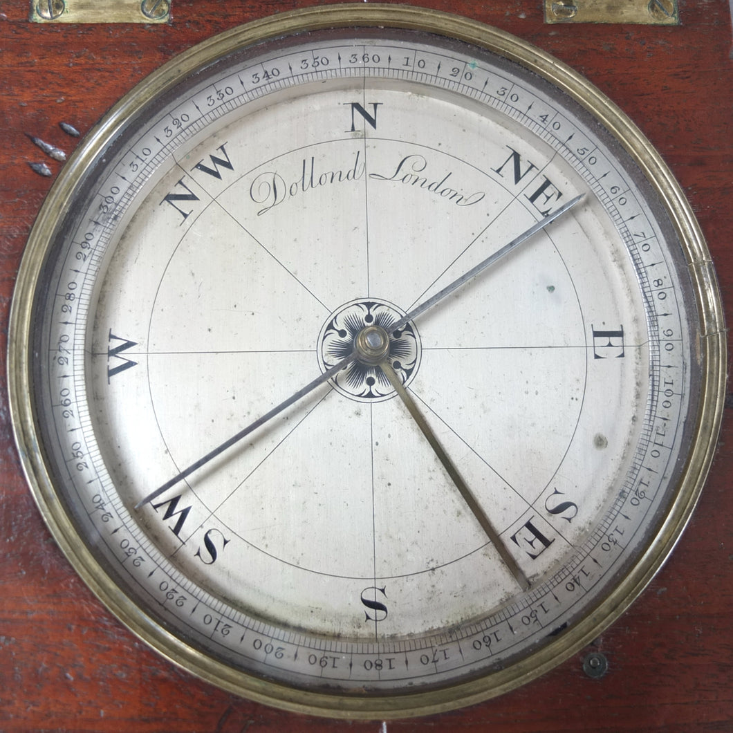 A rare Georgian mahogany cased compass, made in London by Dollond c.1790. The compass is signed by 'Dollond, London'. This type of wooden cased compass was produced from the middle of the 18th century to the early 19th century. This is a well made and substantial compass, with a large sized mahogany case (145mm x 150mm), silvered and engraved compass card, and English bar needle. There is transit lock, operated by a small pin and lever, which locks the needle when the lid is closed. The compass is in full working order and finds North well.