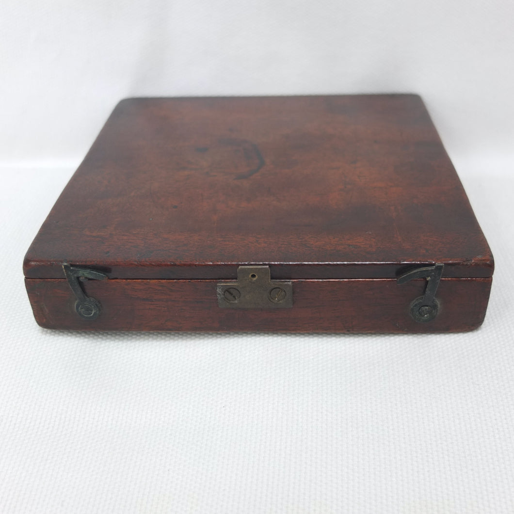 In very good condition, and full working order. The compass points strongly to North. The wooden case is in very good condition, with a few marks and general signs of use. The glass, compass card, and bar needle are all in very good condition, with a few marks to the compass card. There is a small repair to a break in the brass ring above the glass. The transit lock is working well, locking the needle when the lid is closed. The lid closes well with strong hinges and is secured by twin '7' shaped clasps.