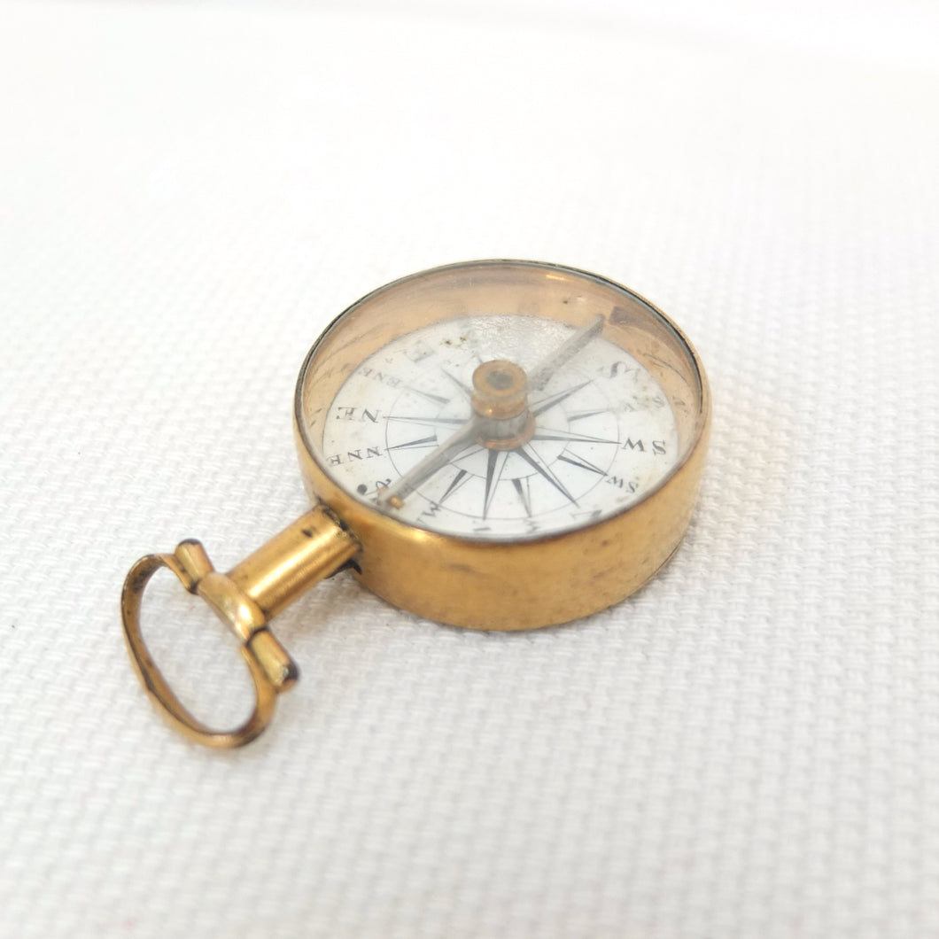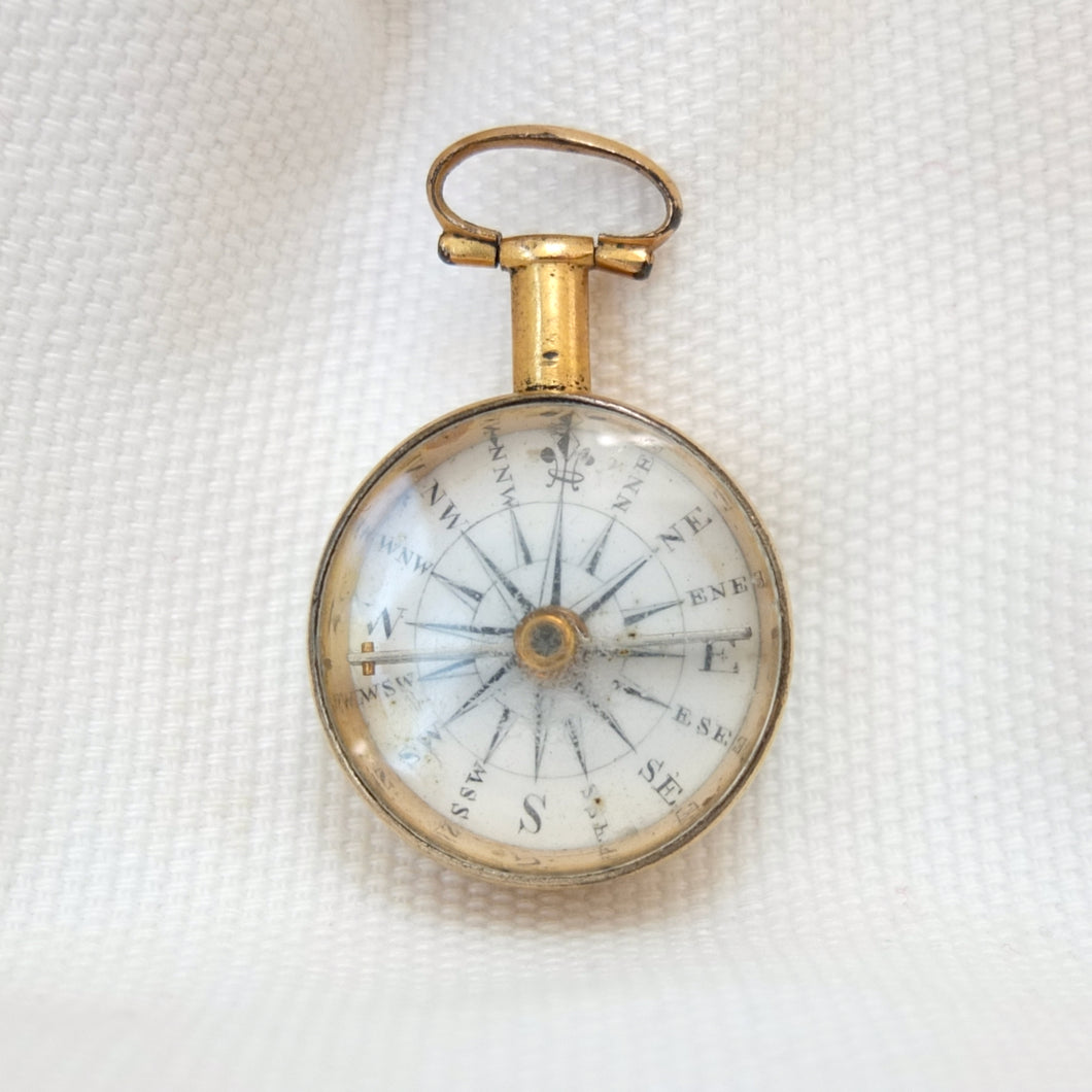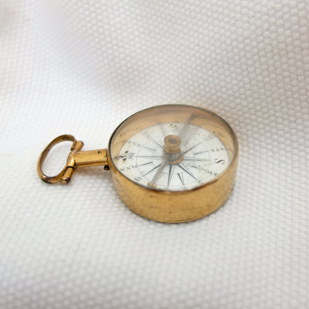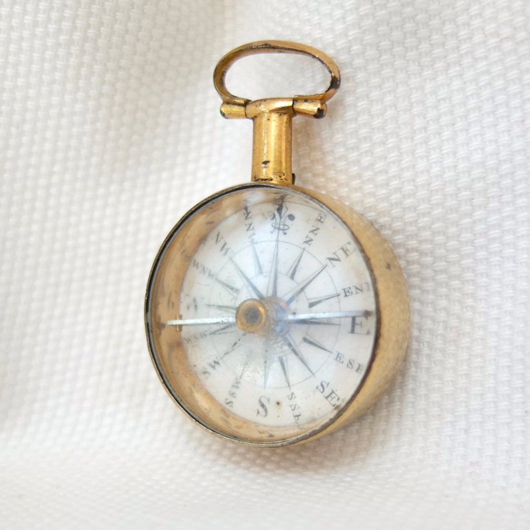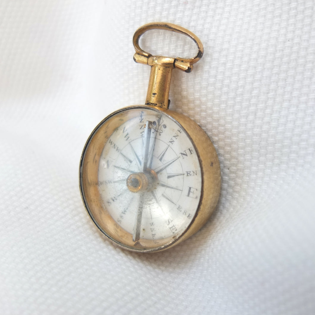 A Georgian Gilt pocket or fob compass, made in England, dating from c.1815. Quite small in size at 27mm diameter, with a hand-painted enamel compass card in the classic Georgian style. Although unsigned, this is a high quality compass, from one of the finest London makers. It has a Gilt brass case, English bar needle and jewelled pivot. There is a fully functional transit lock operated by a tiny lever behind the bow. The compass is in full working order.
