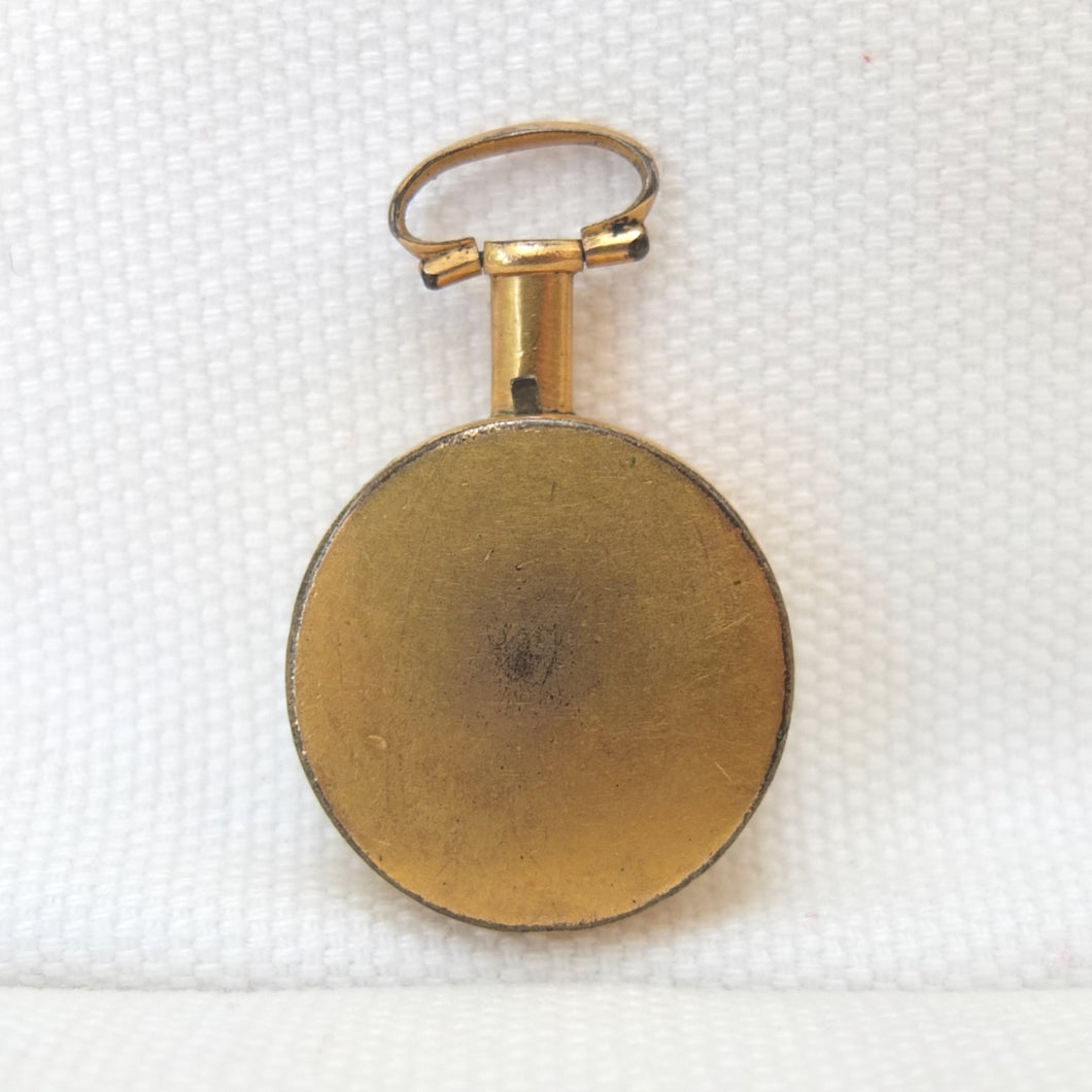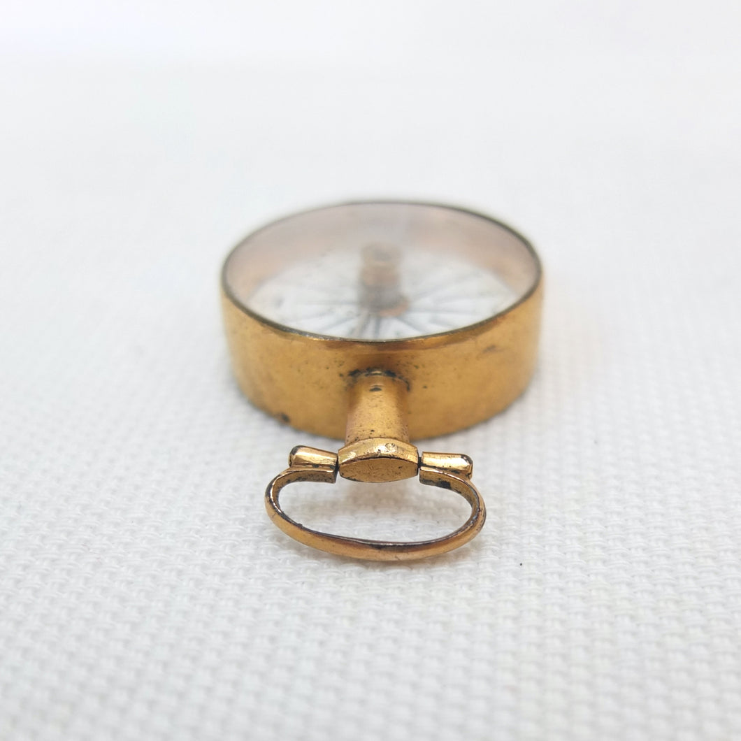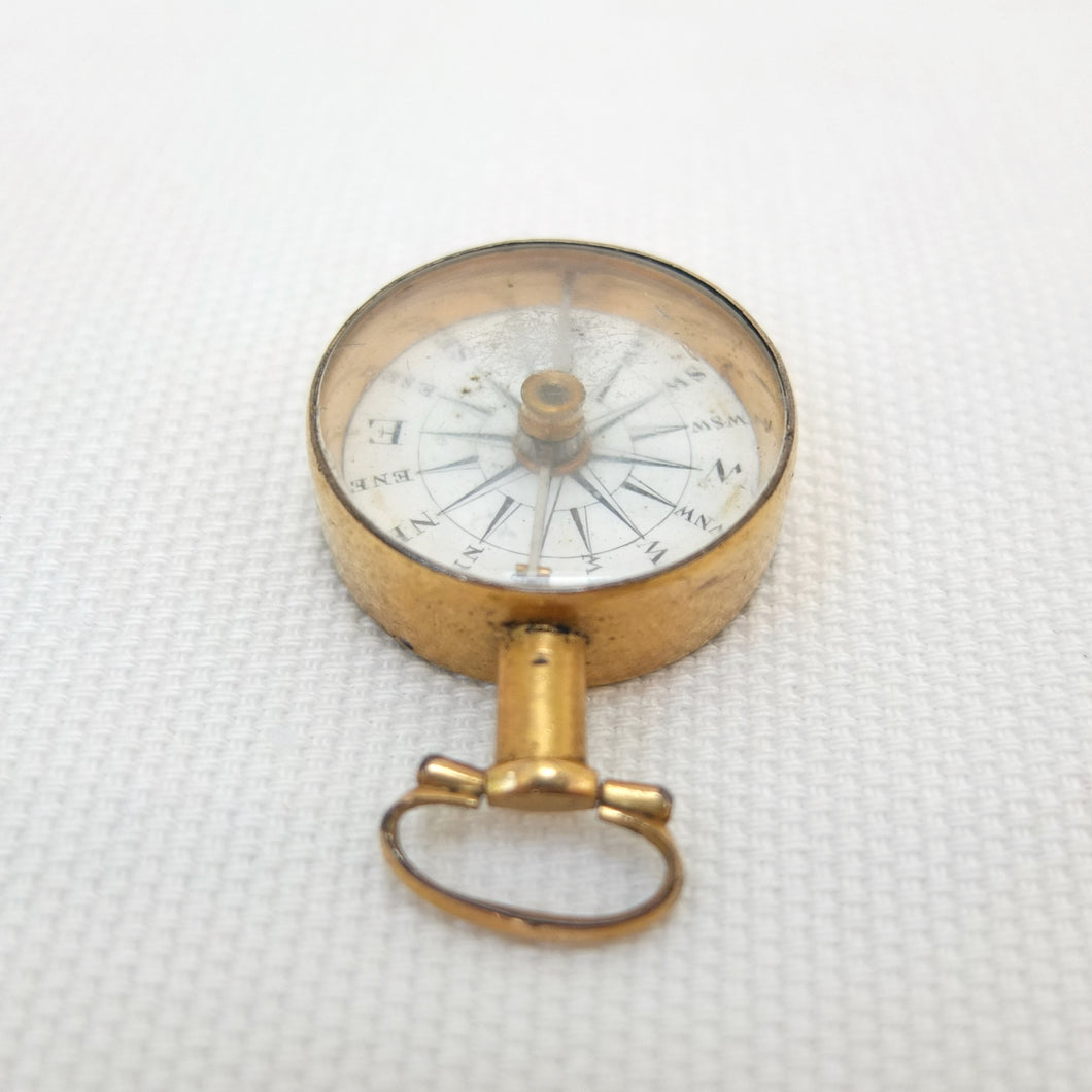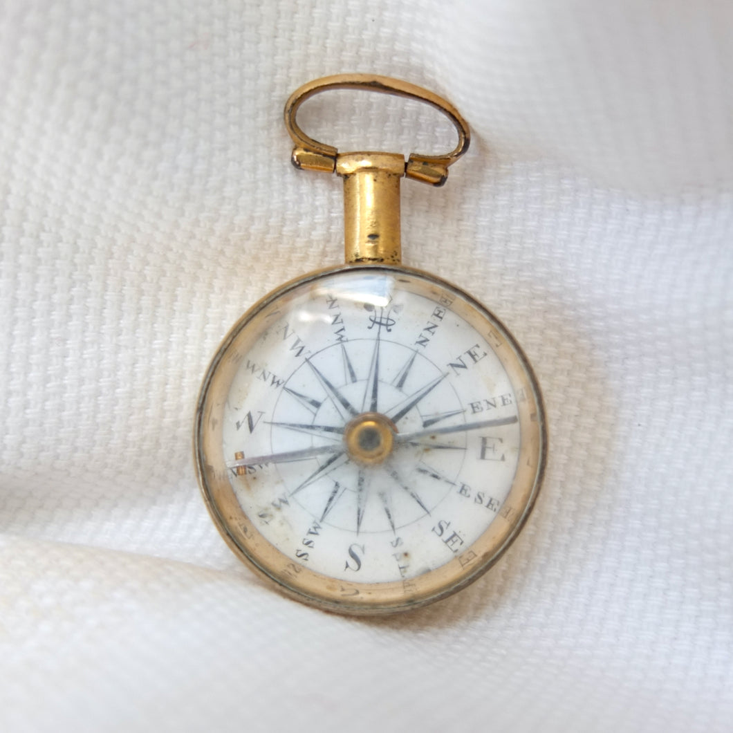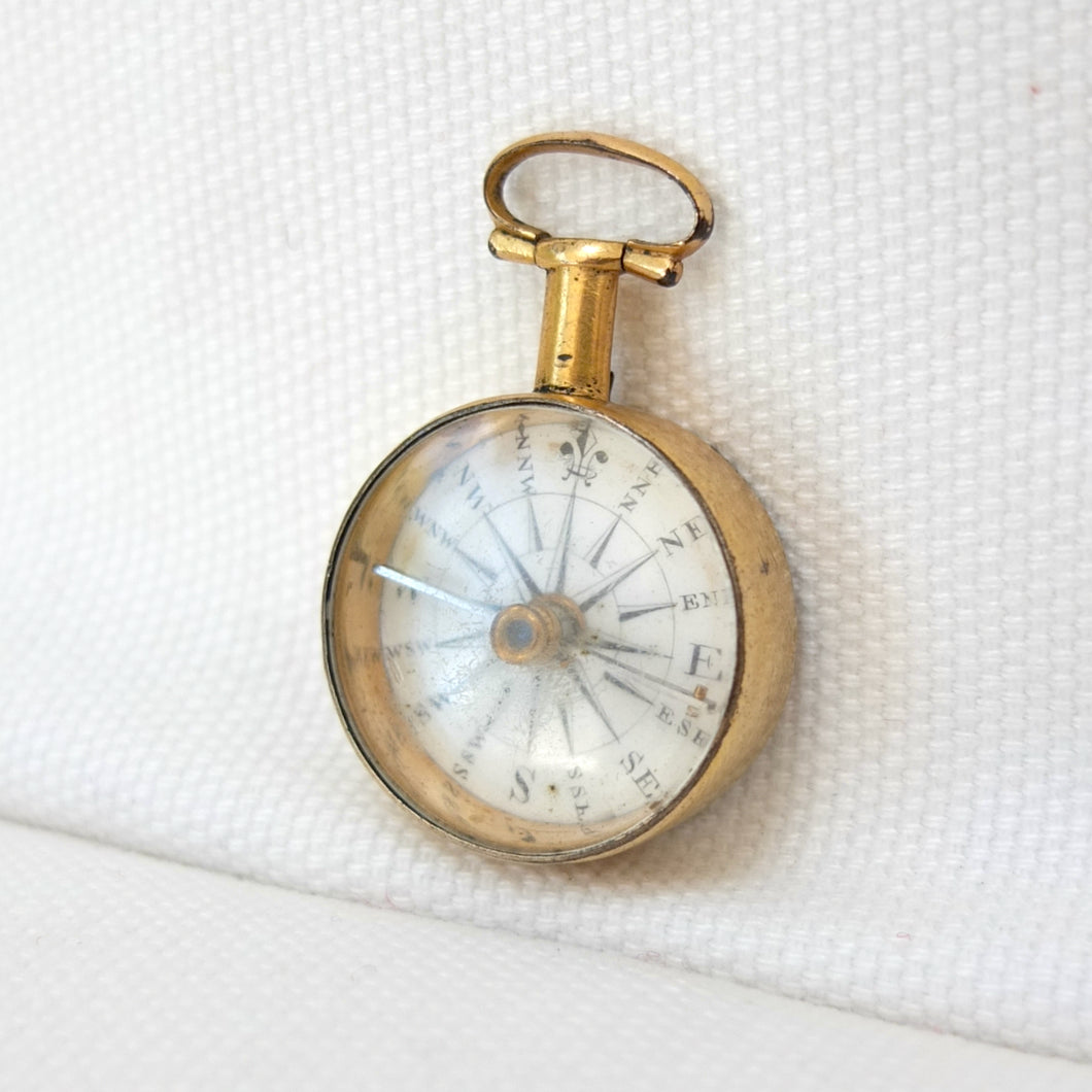 A Georgian Gilt pocket or fob compass, made in England, dating from c.1815. Quite small in size at 27mm diameter, with a hand-painted enamel compass card in the classic Georgian style. Although unsigned, this is a high quality compass, from one of the finest London makers. It has a Gilt brass case, English bar needle and jewelled pivot. There is a fully functional transit lock operated by a tiny lever behind the bow. The compass is in full working order.