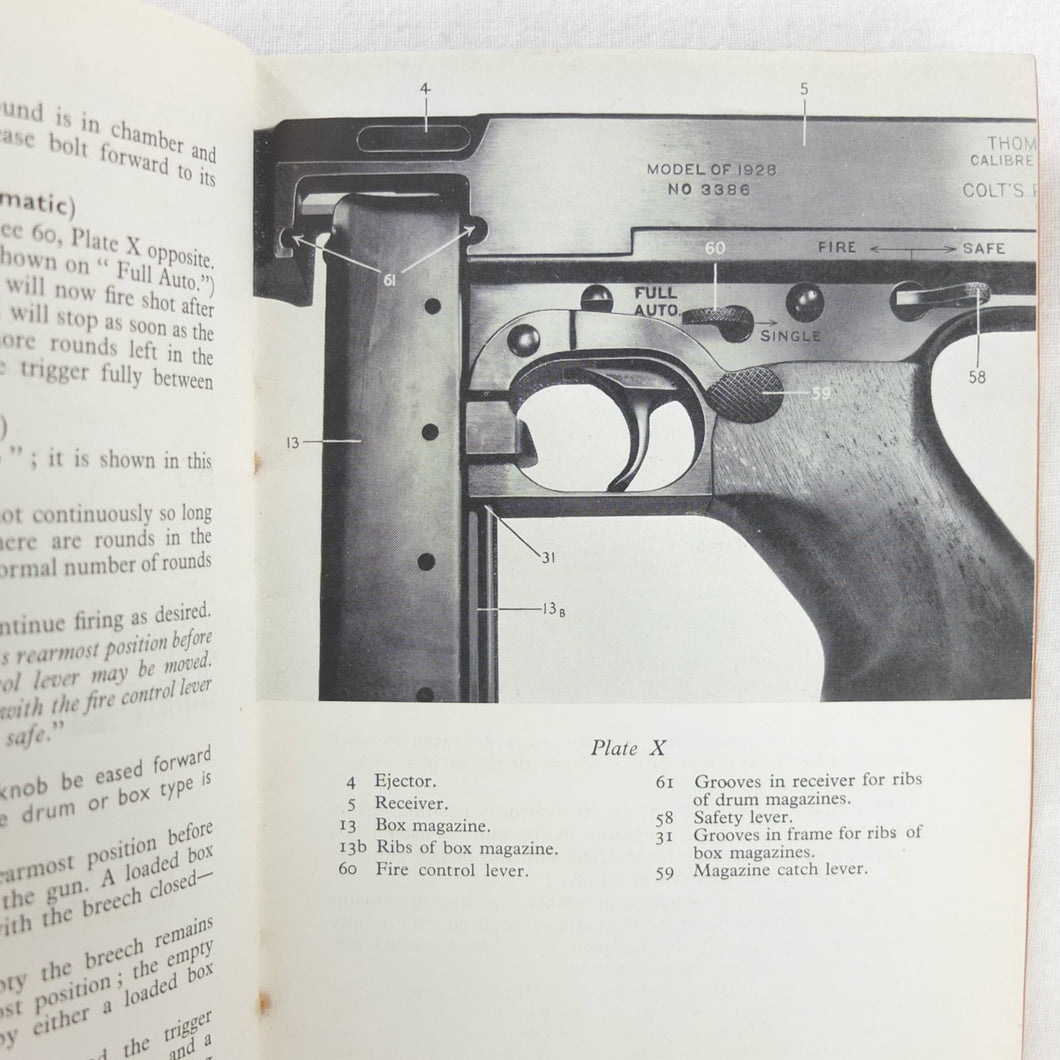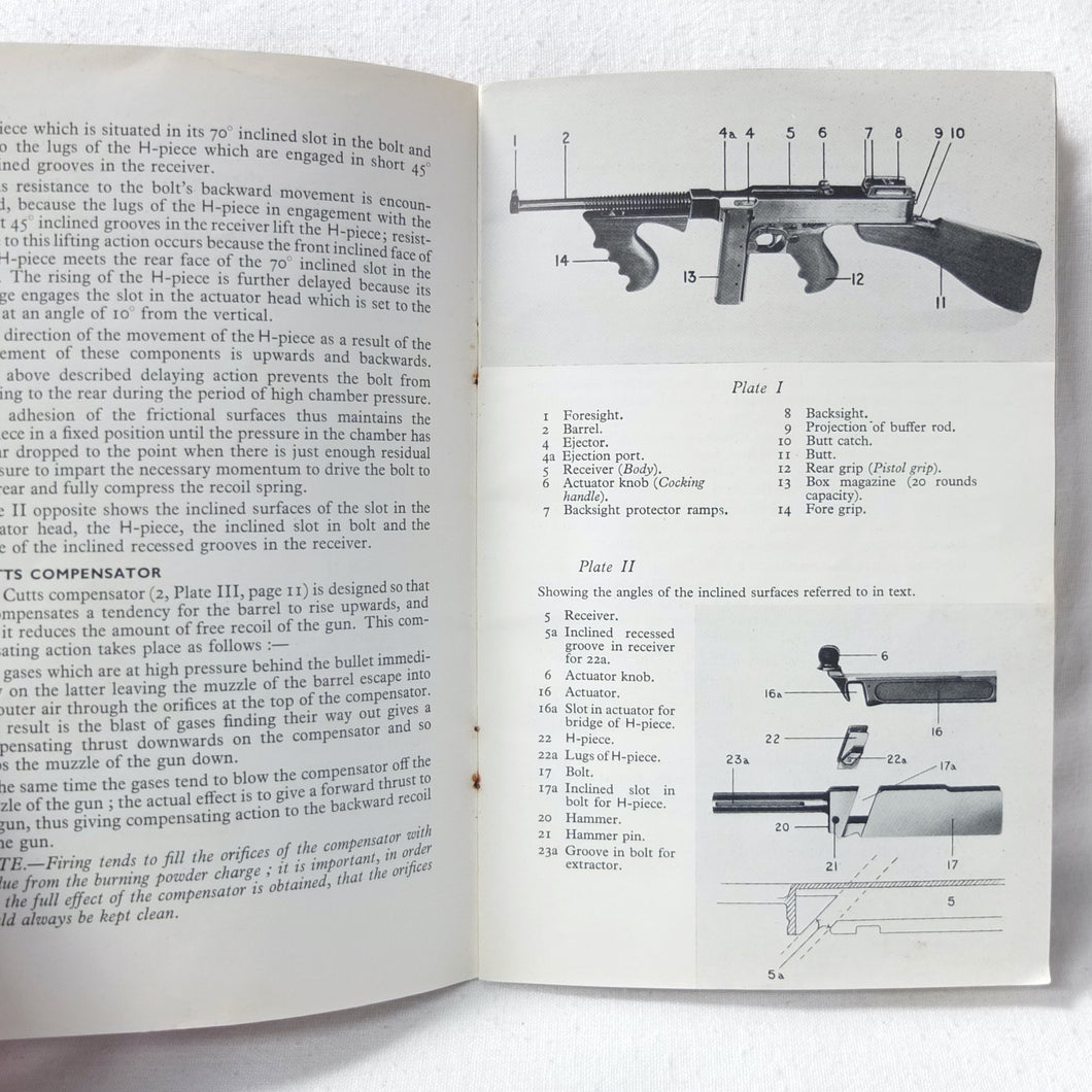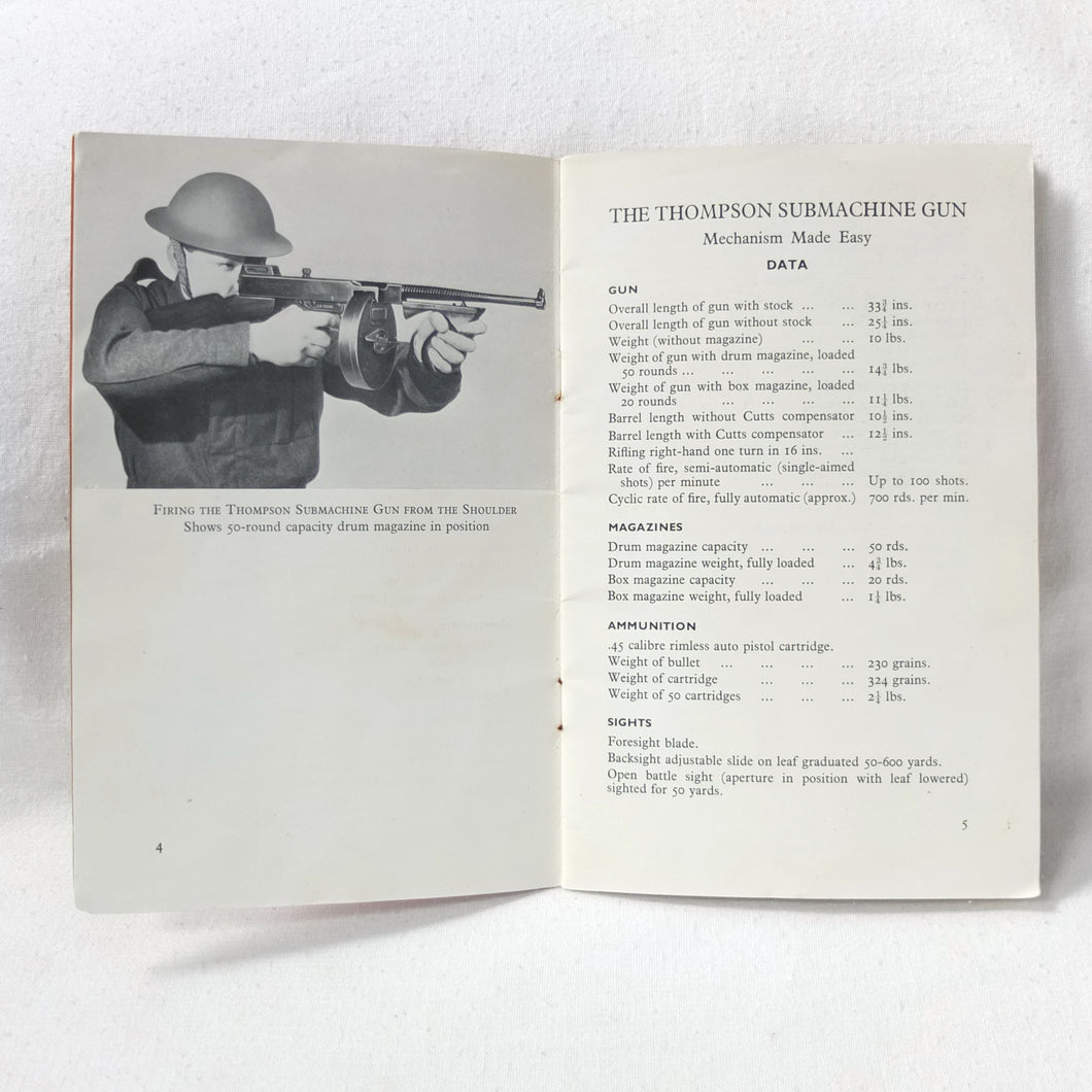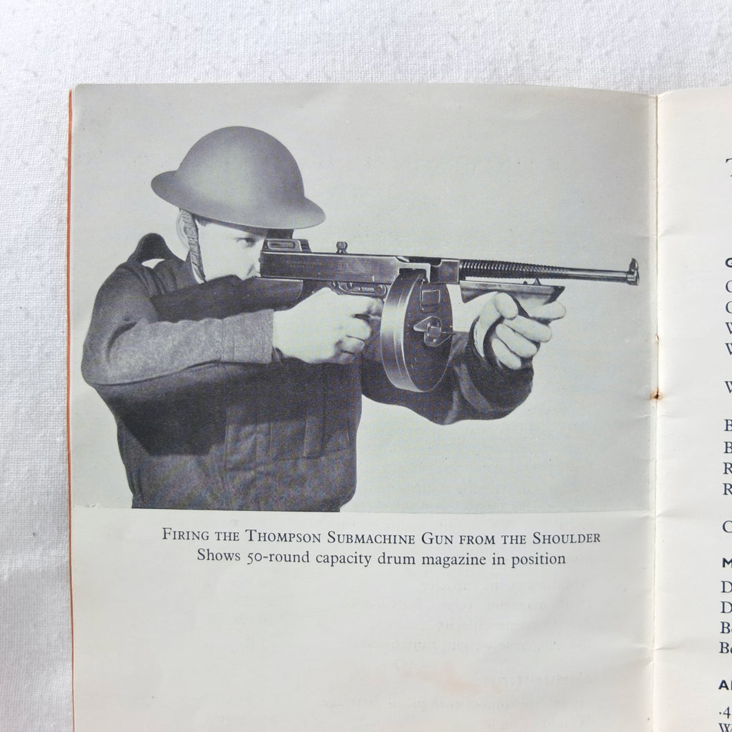 An original WW2 Thompson Submachine Gun handbook, published c.1940. Although undated, it was published during WW2, before the revised edition of 1942 which had slightly different photographs. The book is a detailed guide to the handling and maintenance of the 'Tommy Gun' as used by the allied armies during WW2. Full of fascinating information and fully illustrated with photographs of the Thompson and its mechanism, this book is an excellent introduction to the workings and use of the Thompson Submachine gun.