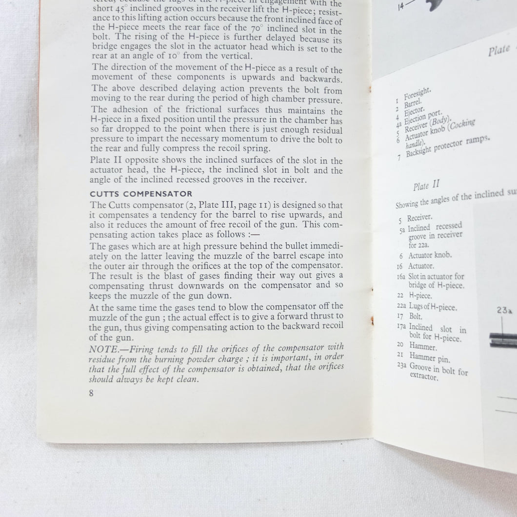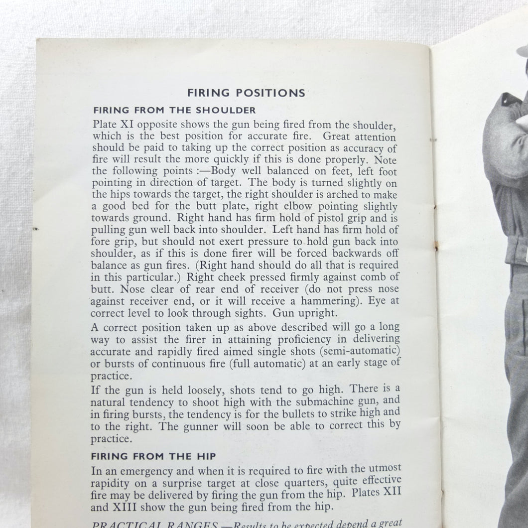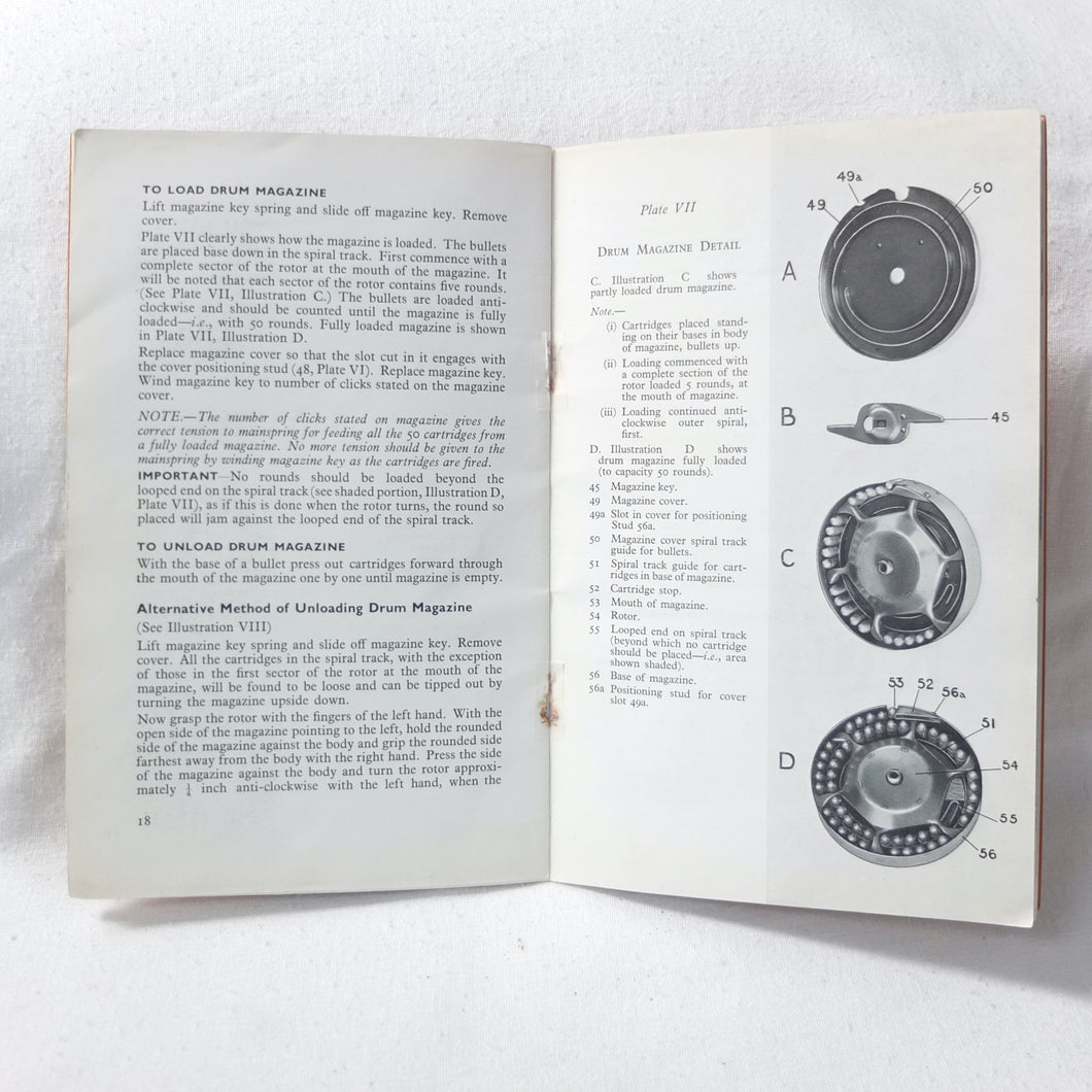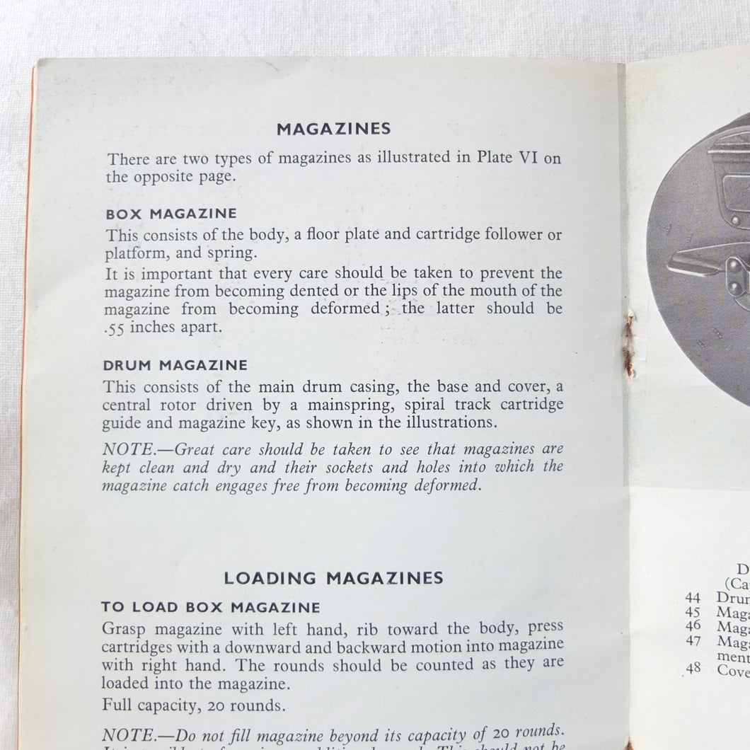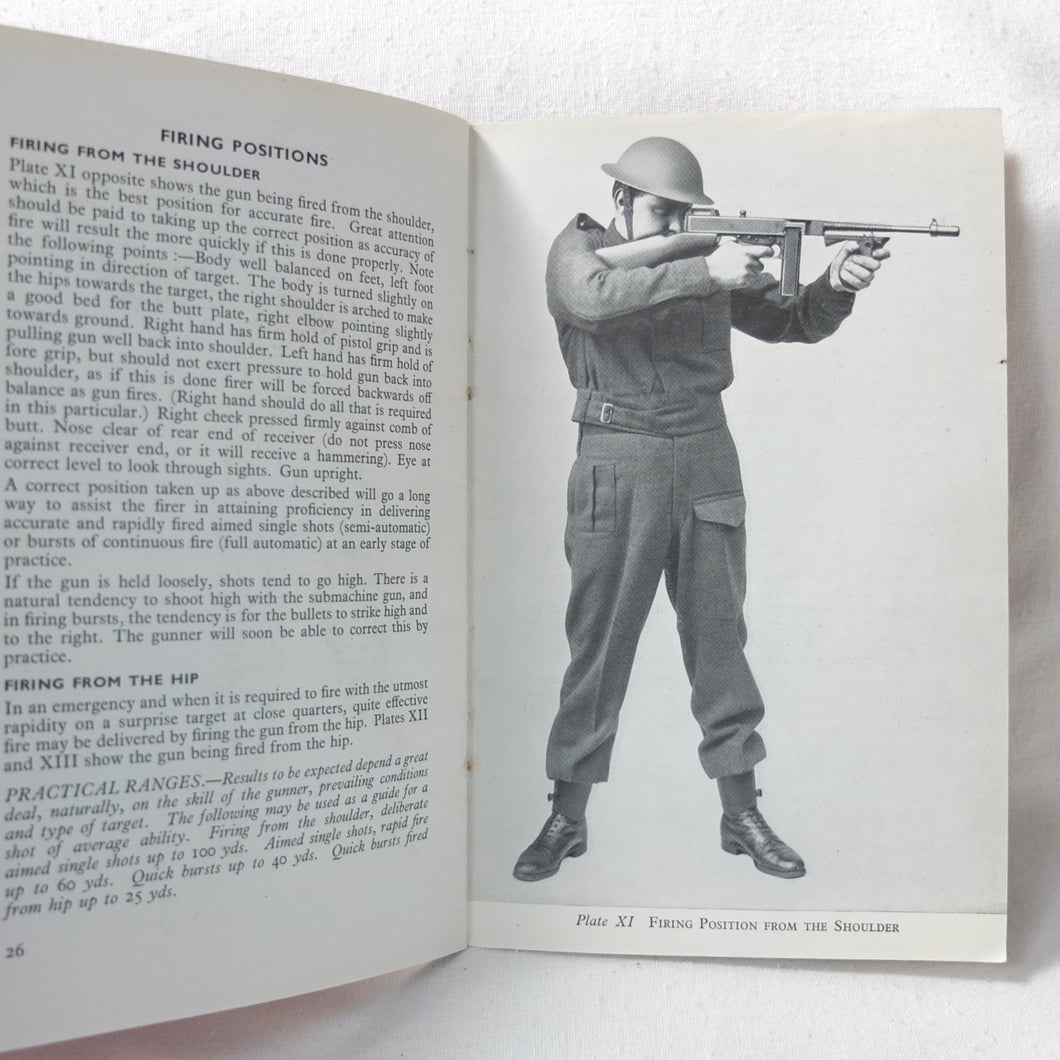 An original WW2 Thompson Submachine Gun handbook, published c.1940. Although undated, it was published during WW2, before the revised edition of 1942 which had slightly different photographs. The book is a detailed guide to the handling and maintenance of the 'Tommy Gun' as used by the allied armies during WW2. Full of fascinating information and fully illustrated with photographs of the Thompson and its mechanism, this book is an excellent introduction to the workings and use of the Thompson Submachine gun.