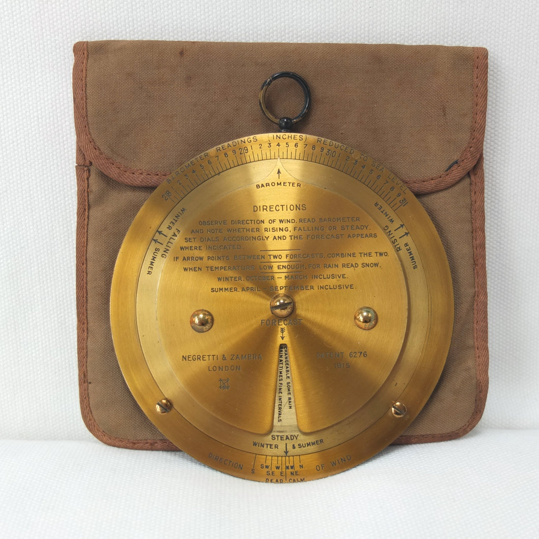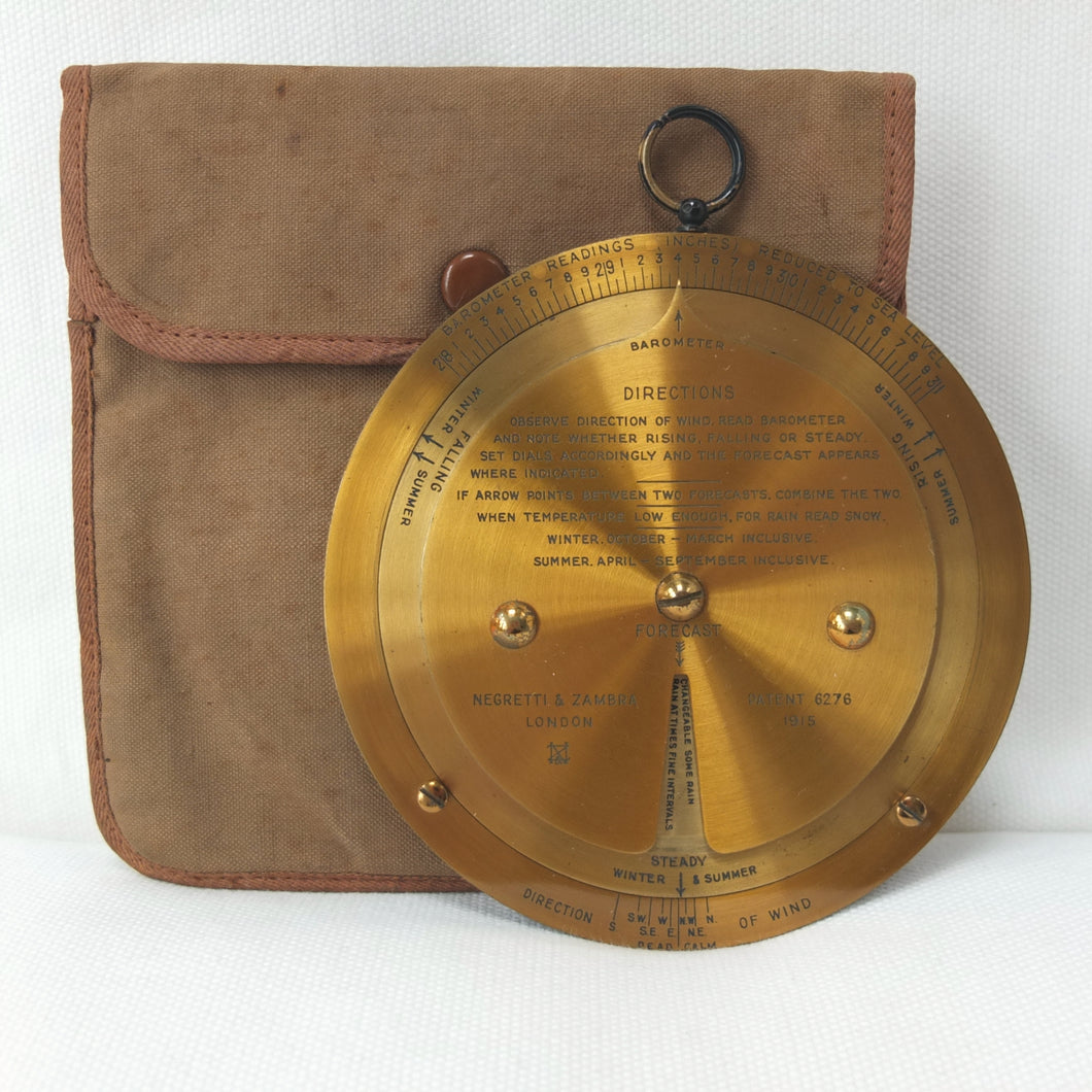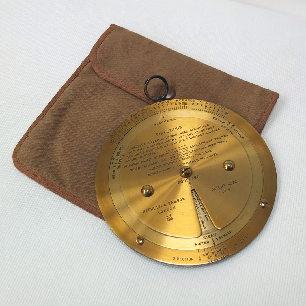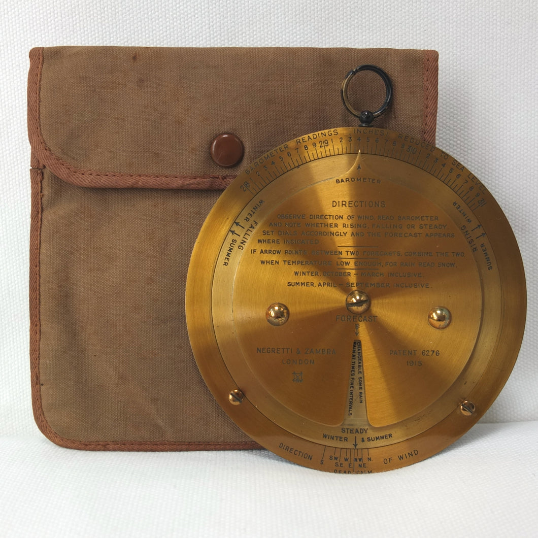 A brass Negretti & Zambra Desktop Forecaster, dating from c.1915. It comes complete with its original khaki canvas case. Patented by the firm in 1915 (Patent No: 6276/1915) it was intended to be used in conjunction with a barometer. Featuring three concentric engraved brass rings with instructions for use on the central plate, the N&Z weather forecaster provided a convenient way of accurately predicting the weather. The direction of the wind is first set on the outer ring, noting whether it is rising, falling, or steady and then the central pointer is aligned with the current barometer reading. The setting of these two positions will then reveal a weather reading in the cut-out section of the central plate. This simple and effective system meant that the weather could be forecast swiftly with a good deal of accuracy. These brass desktop versions were a larger, more expensive, and more accurate version of the celluloid pocket version. Several different versions of the Forecaster were produced, including simple celluloid discs, celluloid with a nickel-plated brass surround, and the larger, solid brass desk types.
