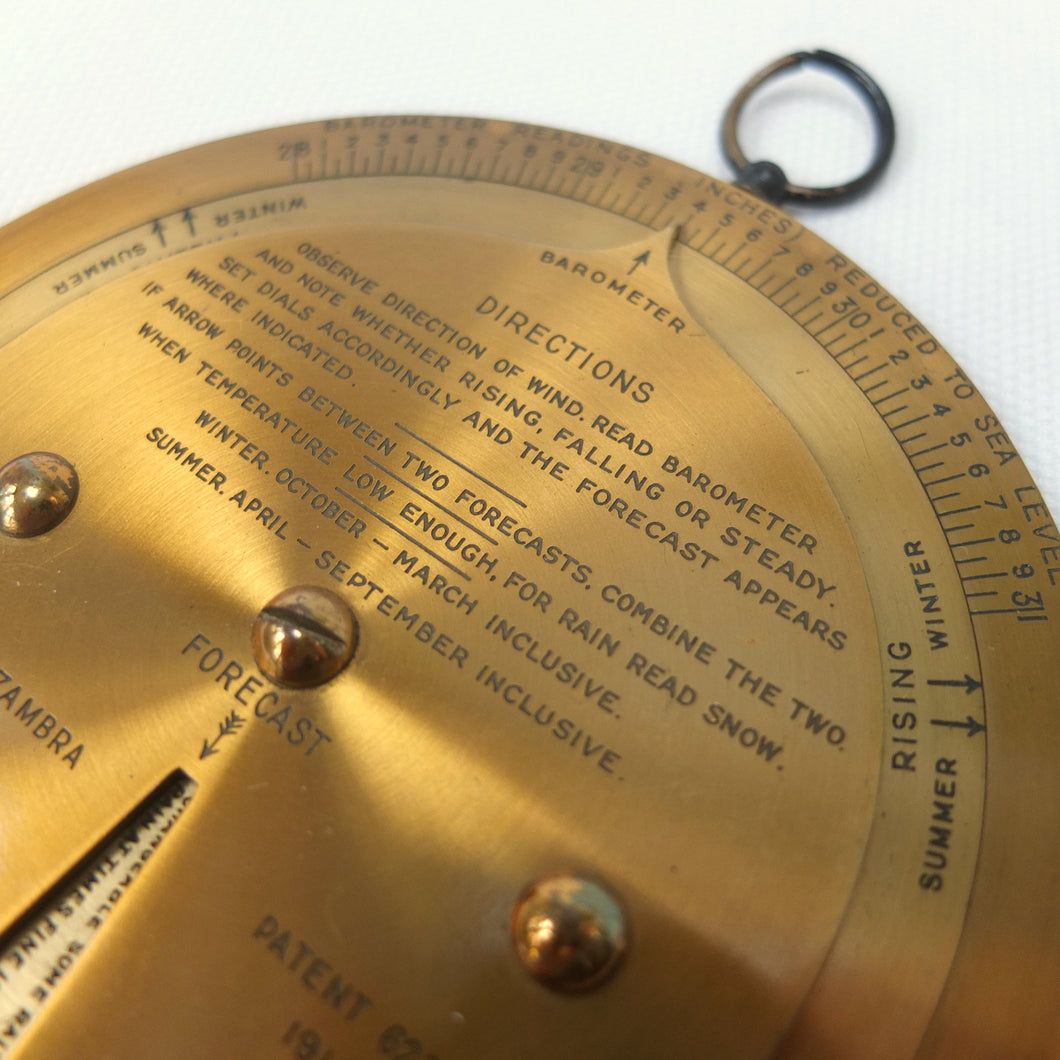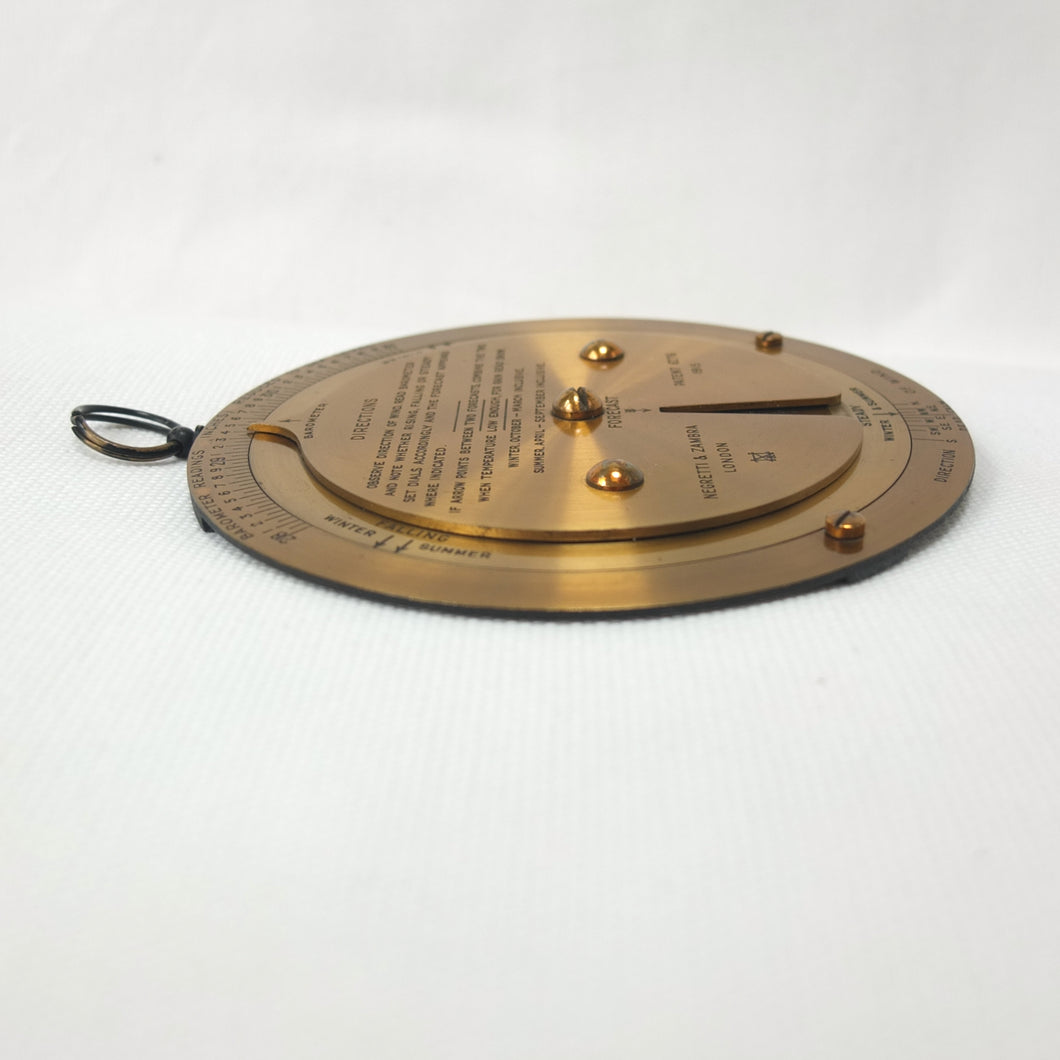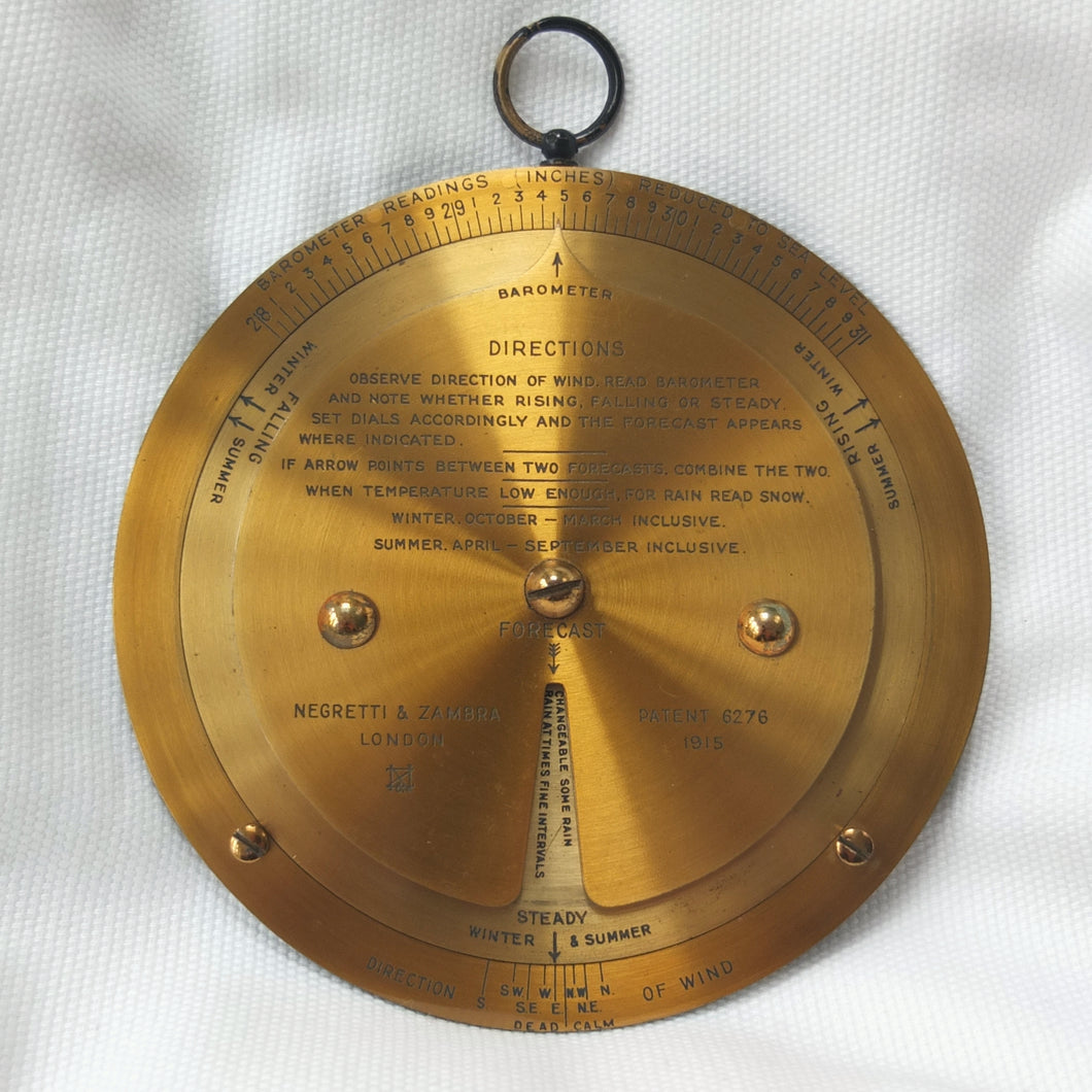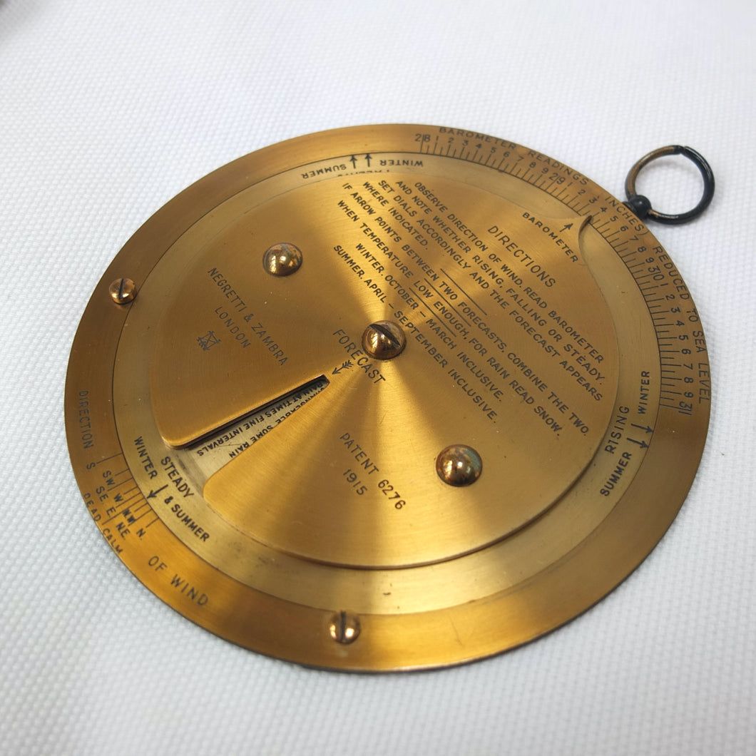 A brass Negretti & Zambra Desktop Forecaster, dating from c.1915. It comes complete with its original khaki canvas case. Patented by the firm in 1915 (Patent No: 6276/1915) it was intended to be used in conjunction with a barometer. Featuring three concentric engraved brass rings with instructions for use on the central plate, the N&Z weather forecaster provided a convenient way of accurately predicting the weather. The direction of the wind is first set on the outer ring, noting whether it is rising, falling, or steady and then the central pointer is aligned with the current barometer reading. The setting of these two positions will then reveal a weather reading in the cut-out section of the central plate. This simple and effective system meant that the weather could be forecast swiftly with a good deal of accuracy. These brass desktop versions were a larger, more expensive, and more accurate version of the celluloid pocket version. Several different versions of the Forecaster were produced, including simple celluloid discs, celluloid with a nickel-plated brass surround, and the larger, solid brass desk types.
