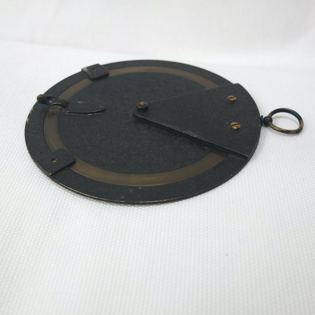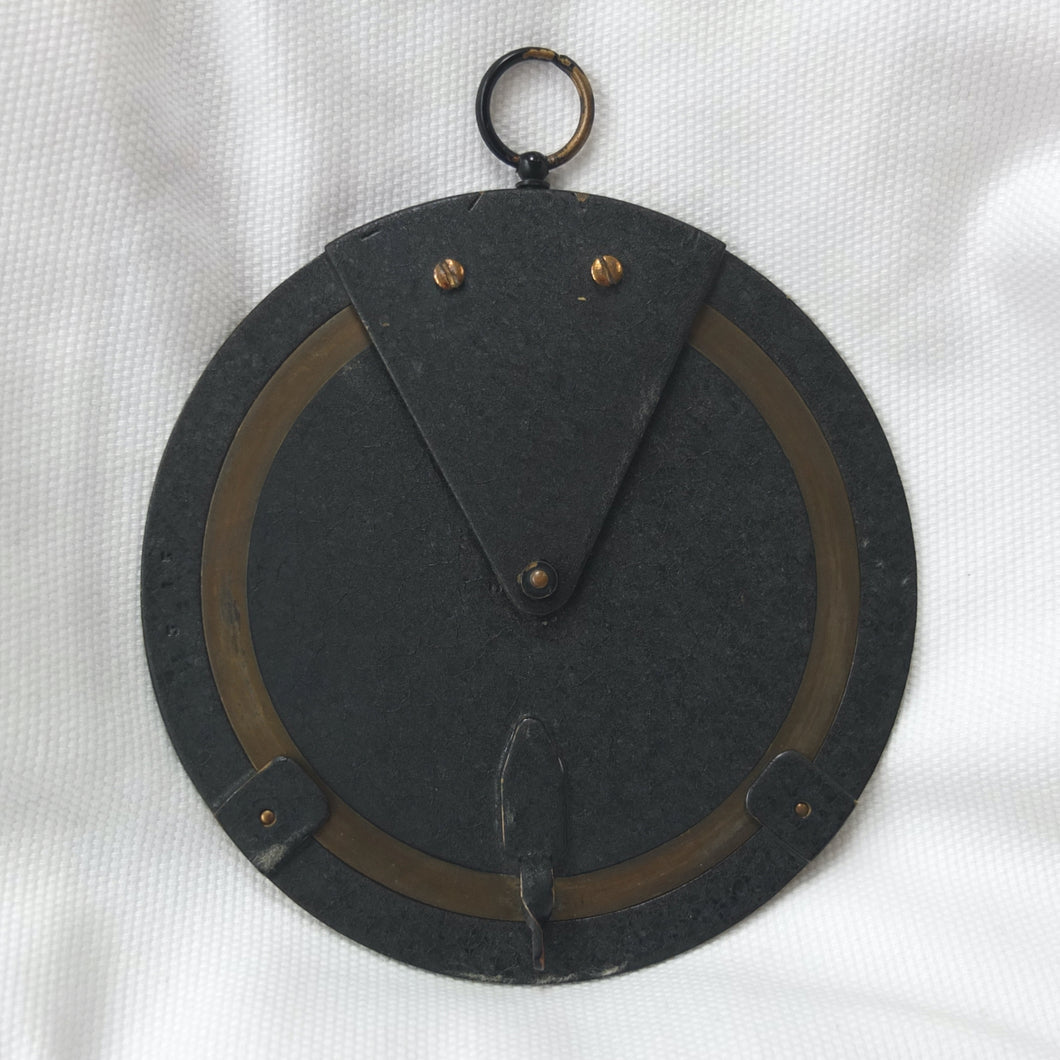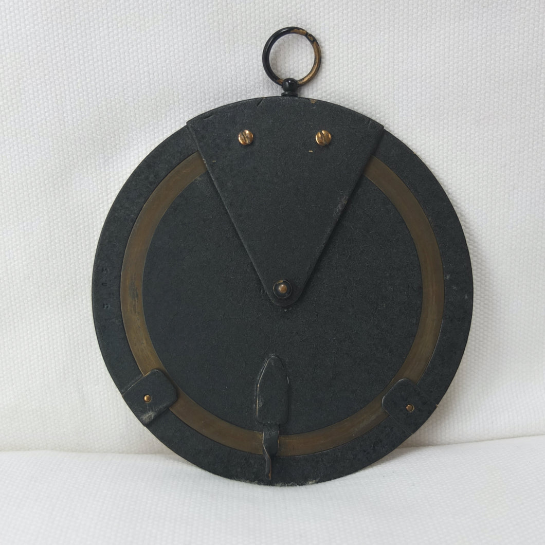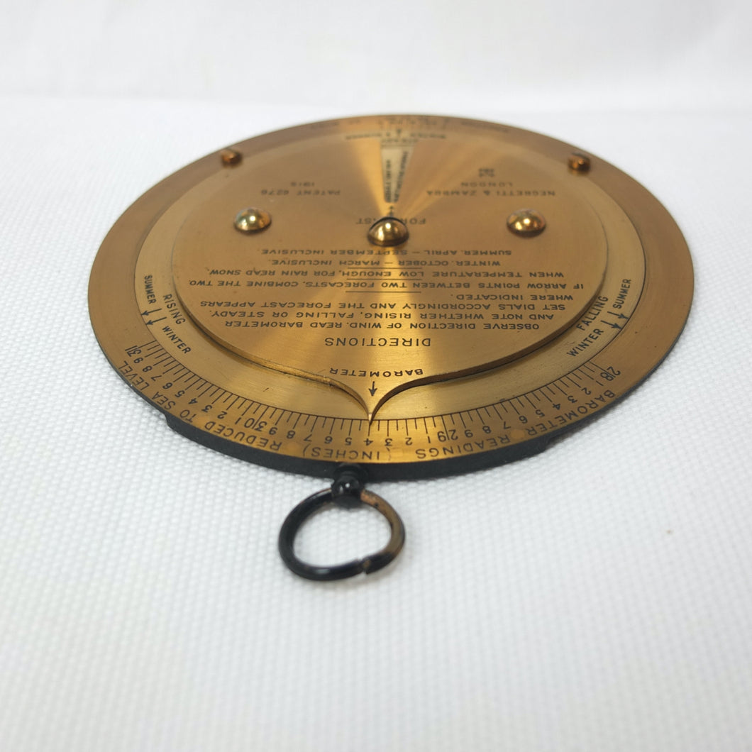 A brass Negretti & Zambra Desktop Forecaster, dating from c.1915. It comes complete with its original khaki canvas case. Patented by the firm in 1915 (Patent No: 6276/1915) it was intended to be used in conjunction with a barometer. Featuring three concentric engraved brass rings with instructions for use on the central plate, the N&Z weather forecaster provided a convenient way of accurately predicting the weather. The direction of the wind is first set on the outer ring, noting whether it is rising, falling, or steady and then the central pointer is aligned with the current barometer reading. The setting of these two positions will then reveal a weather reading in the cut-out section of the central plate. This simple and effective system meant that the weather could be forecast swiftly with a good deal of accuracy. These brass desktop versions were a larger, more expensive, and more accurate version of the celluloid pocket version. Several different versions of the Forecaster were produced, including simple celluloid discs, celluloid with a nickel-plated brass surround, and the larger, solid brass desk types.
