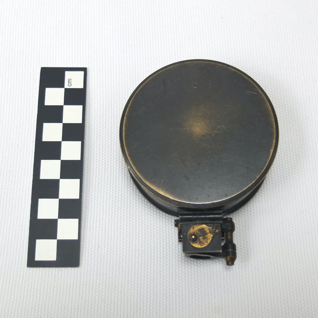 This type of compass design originated in the second half of the 19th century, and was a development of the Schmalcalder Patent types of the early 1800's. In 1861 W. F. Stanley patented a number of improvements in the use of aluminium in the manufacture of mathematical and scientific instruments, and he was one of the first to use the cutaway aluminium ring dial. Stanley's Surveying and Levelling Instruments (1895) included a description of this type of compass, and it was listed in many scientific instrument catalogues, including the J. H. Steward Military Instruments Catalogue (1901), the W. F. Stanley Catalogue (1912), and the Francis Barker catalogues of 1909 and 1926. The Barker catalogues described this type of compass as a 'Brass bronzed prismatic compass, with aluminium ring and card dial, Agate cap and stop'. The red and green filters or 'Azimuth Glasses' were optional extras.