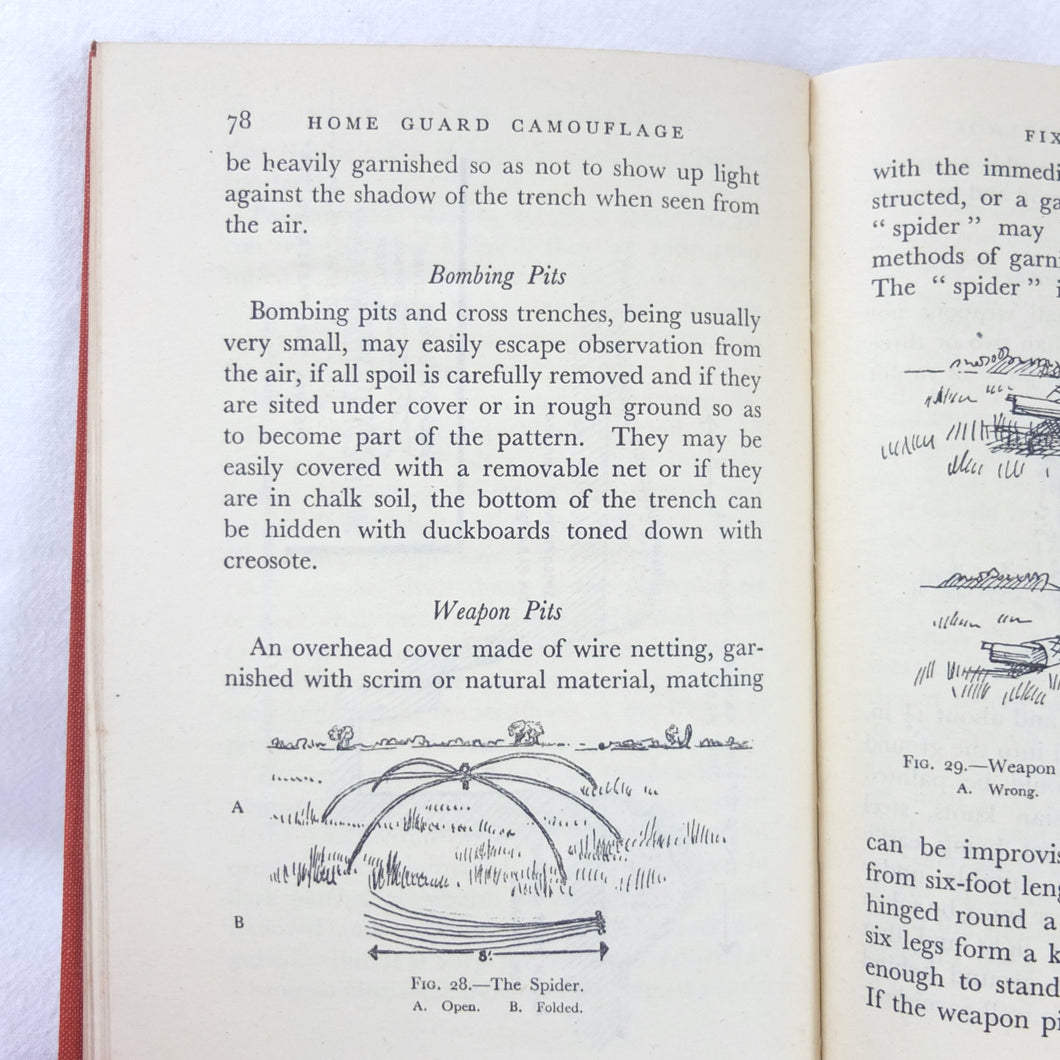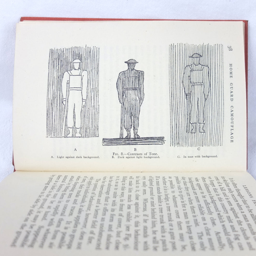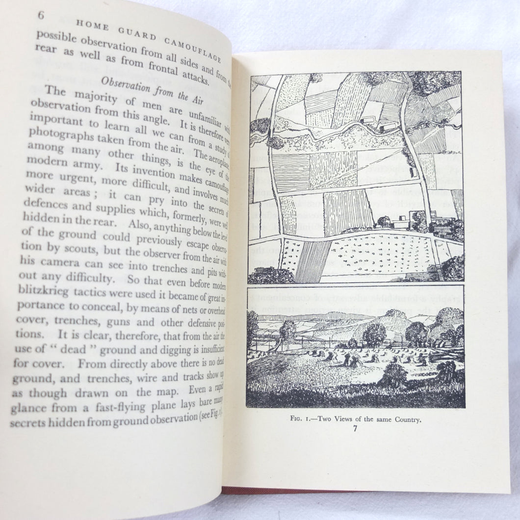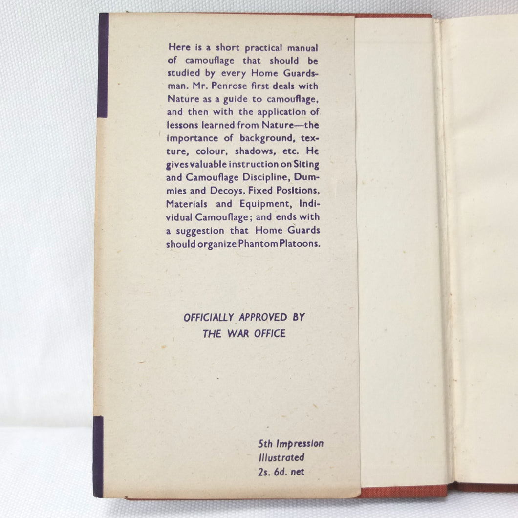 Home Guard Manual of Camouflage is a rare WW2 camouflage handbook written by the English surrealist Roland Penrose. Published in October 1941 and reprinted four times by April 1942, when this Fifth Impression was printed. Very well illustrated with line drawings, diagrams and photographs, it was intended to train the Home Guard in the crucial art of camouflage and concealment. The book provided accurate guidance on the use of texture and colour, especially for protection from aerial photography. Initially, this new concept of using deception was not universally accepted, being anathema to many of the old soldiers who were now serving in the Home Guard: