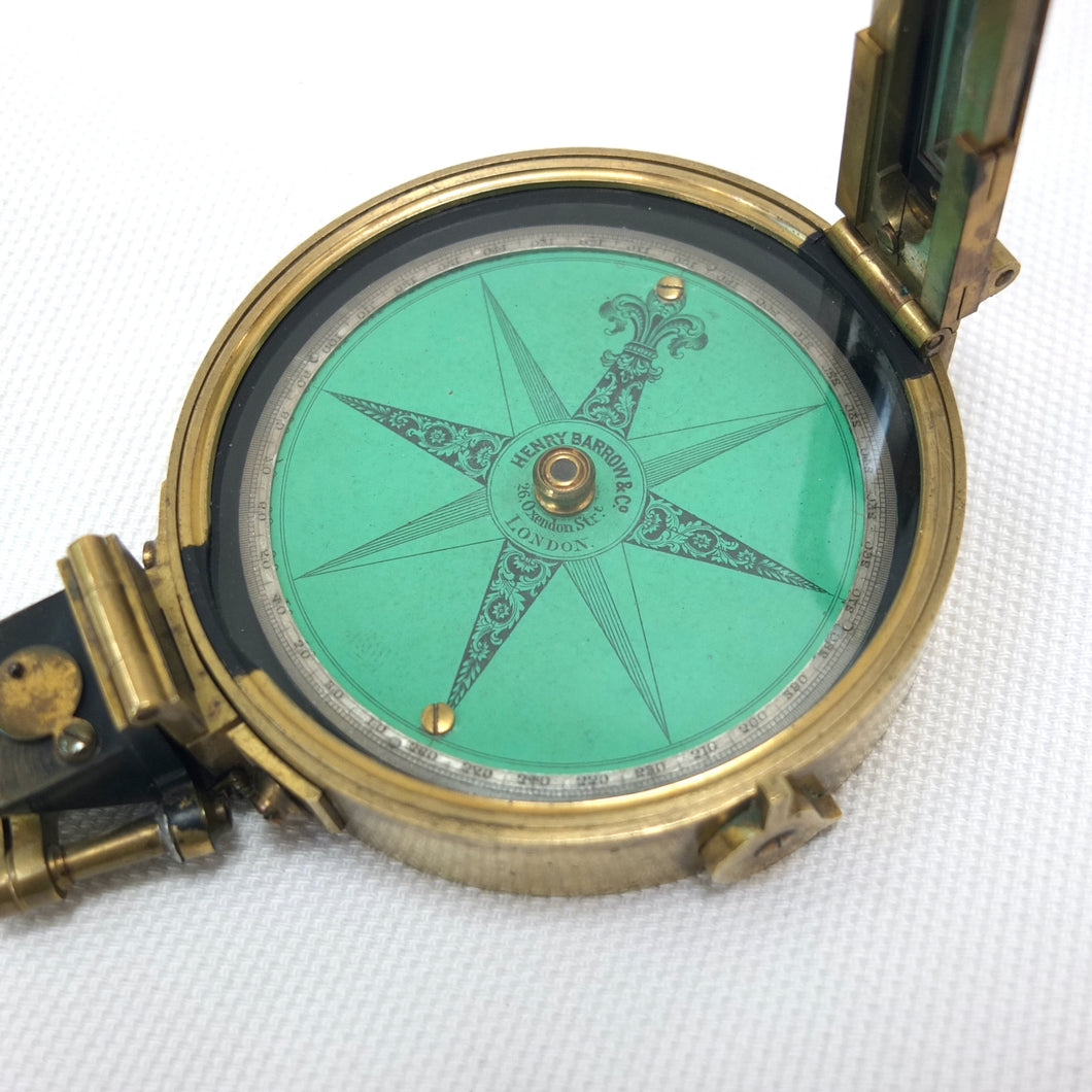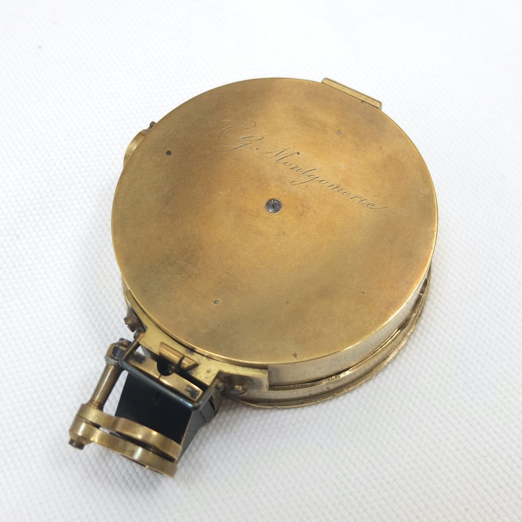 A very rare Schmalcalder-type prismatic compass, made by Henry Barrow in London c.1845. The compass card is signed 'Henry Barrow & Co, 26 Oxendon Street, London'. The brass case has the name 'T. G. Montgomerie' engraved on the base.