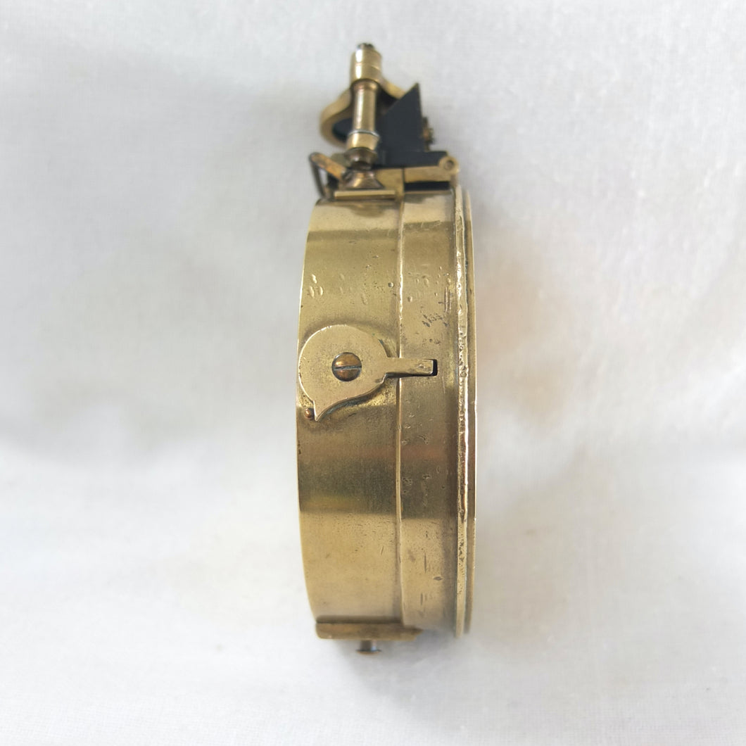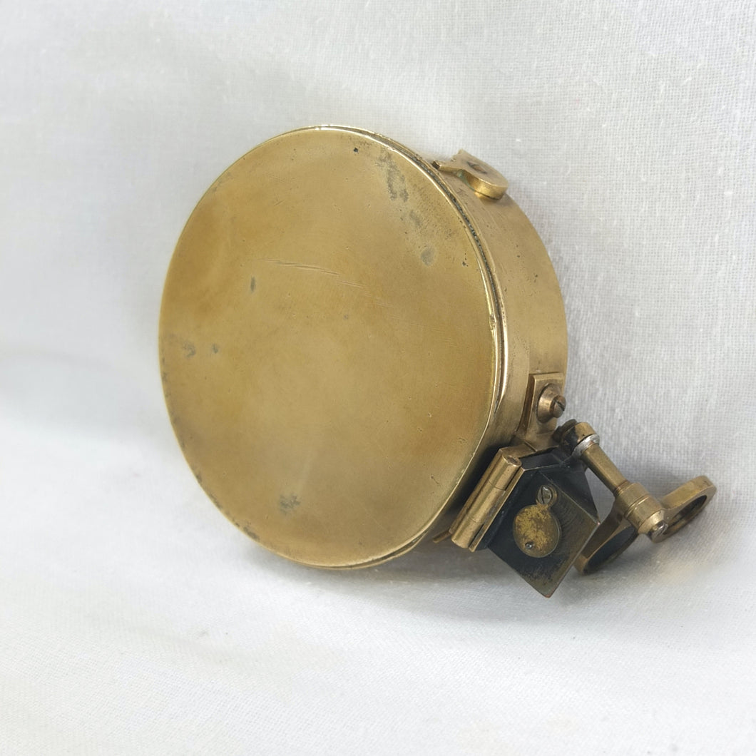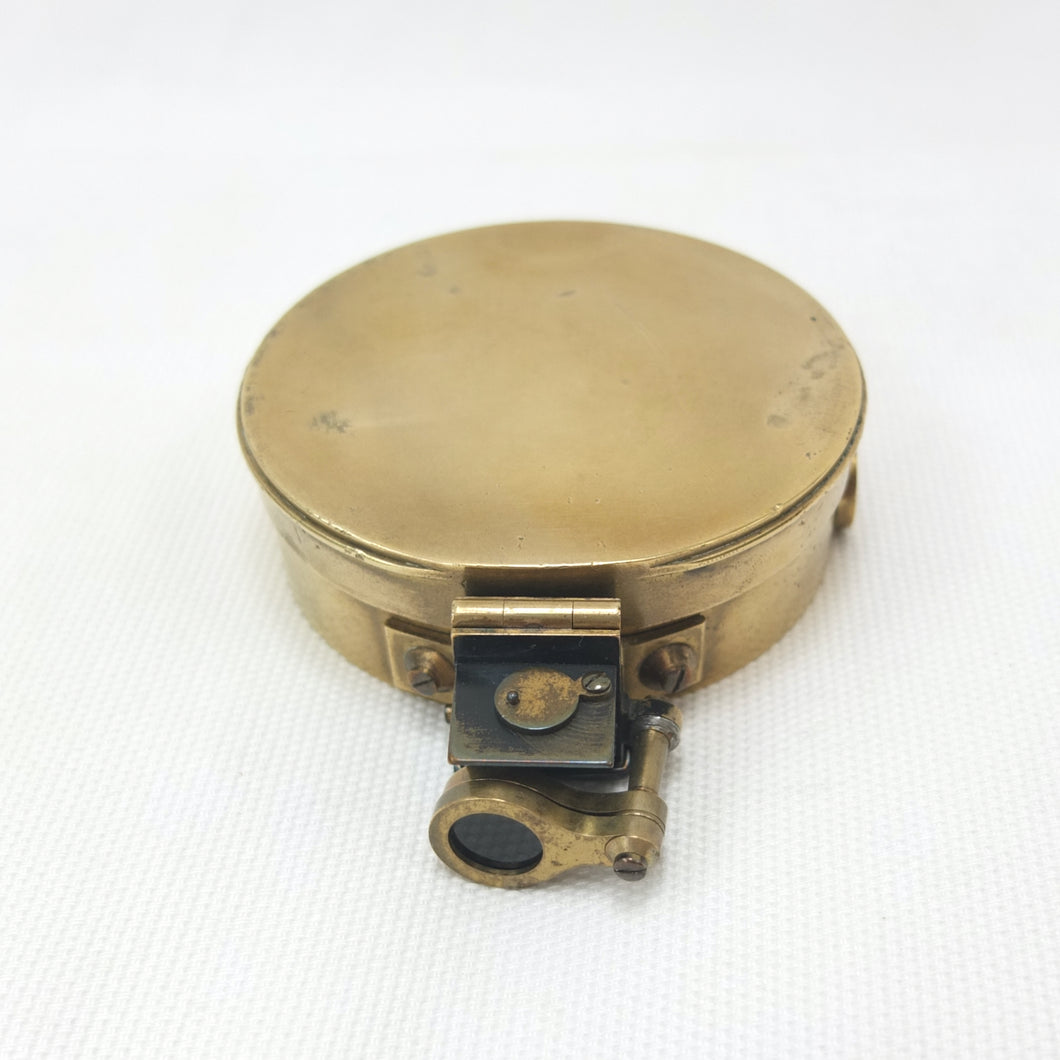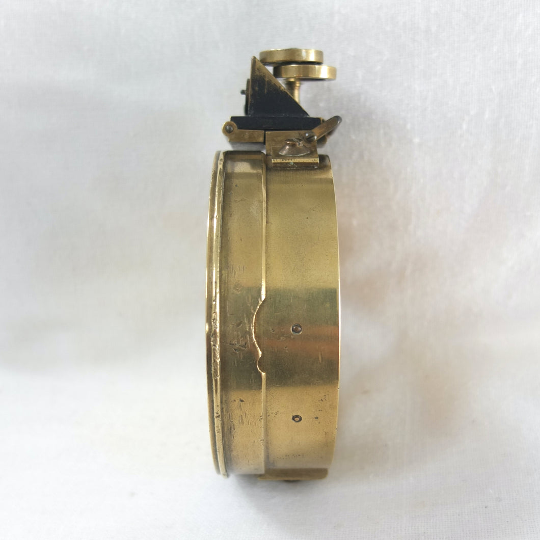 The compass is a fine example of the work of one of the best maker's of the period. With a hand-drawn green compass card and silvered index ring, jewelled pivot, brass case and lid, prism and vane sights, transit lock, and manual brake. The transit lock mechanism is operated by a rotating lever on the side of the case, and the manual card brake is operated by a push-button below the sights. There is a folding prism (with red and green coloured filters) on one side of the case and a folding sighting vane complete with adjustable mirror on the opposite side. The compass comes complete with its original fitted leather case.
