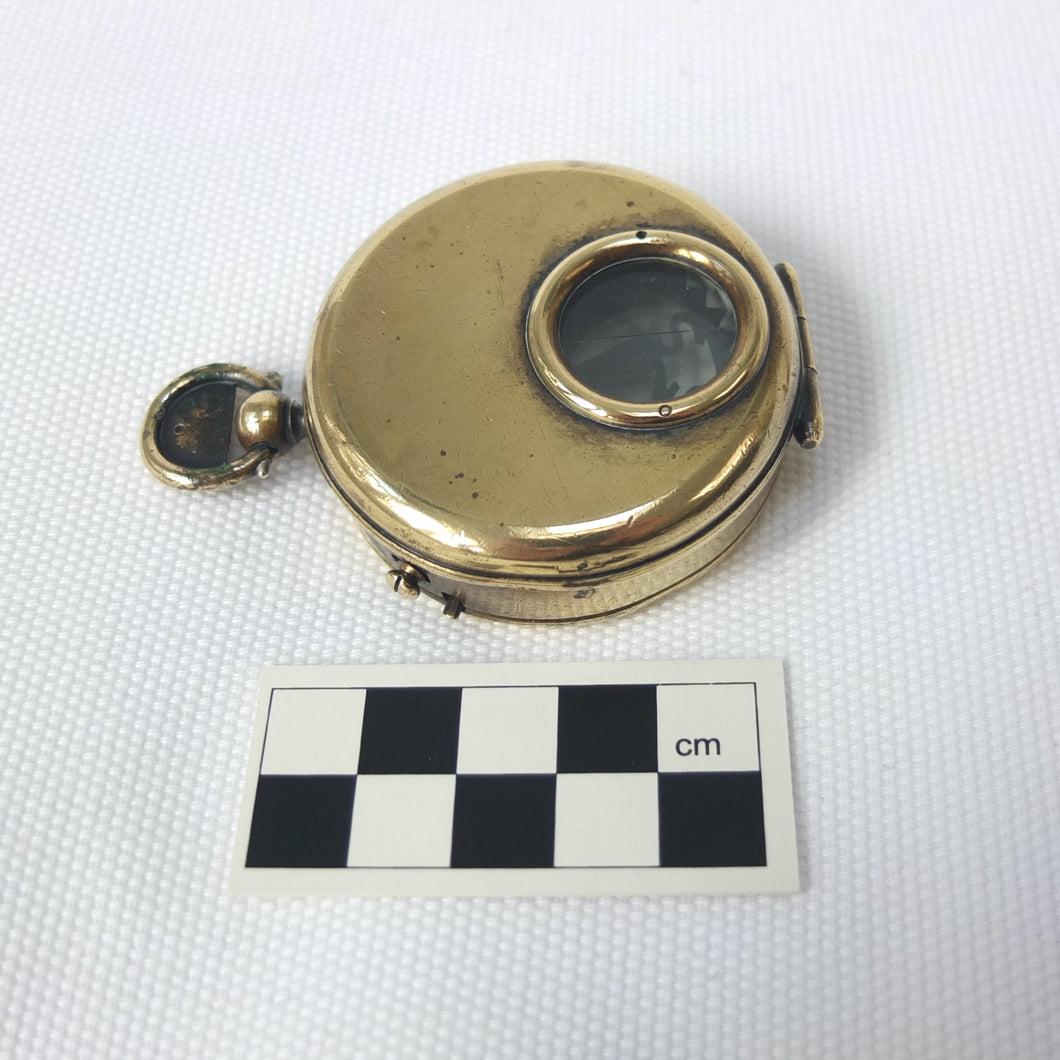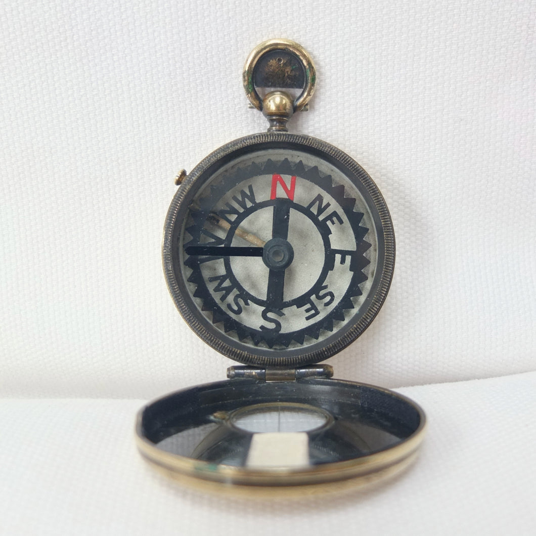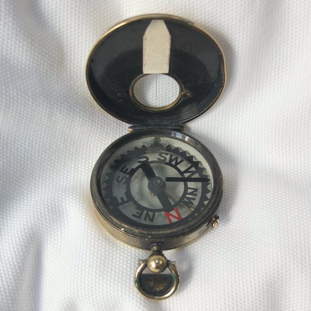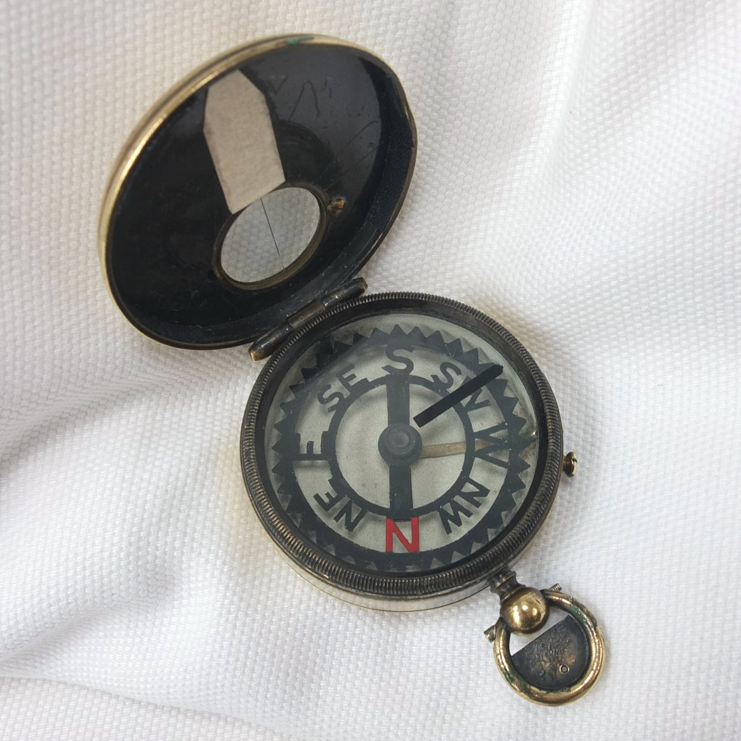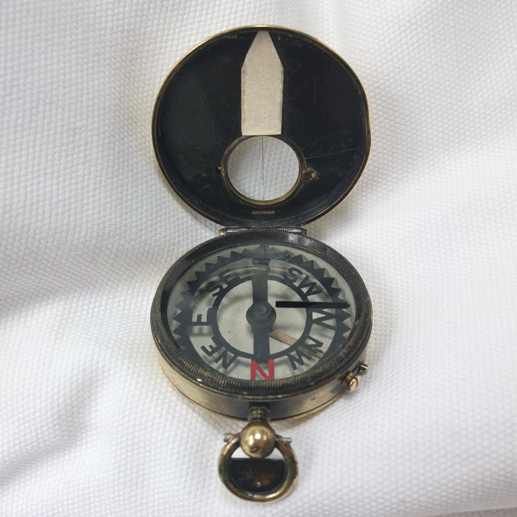 The compass has an aluminium Skeleton dial with a jewelled pivot, rotating bezel with bearing marker on the underside of the glass, and a brass hunter case with viewing window and sighting line in the lid. This sighting line was used in conjunction with the pinhole sight in the thumb ring. In later versions of the Skeleton, the pinhole sight was replaced with a notch on the outside of the ring, as the pinhole tab made the ring difficult to use. The compass has a transit lock operated by a sliding button on the side of the case, and a lever to lift and lock the compass card. The case would originally have had a bronzed finish, and this can still be seen on the interior of the lid.