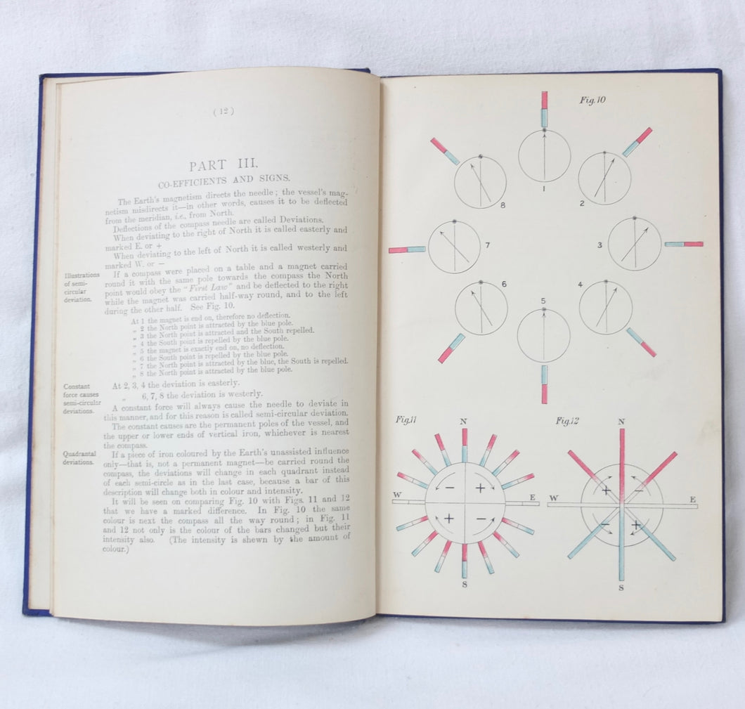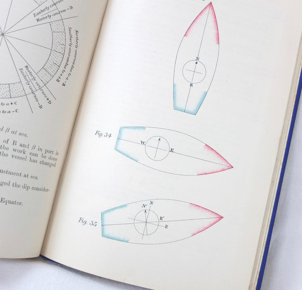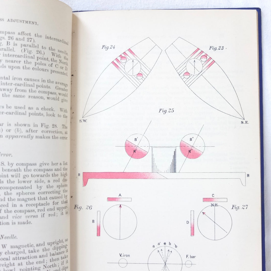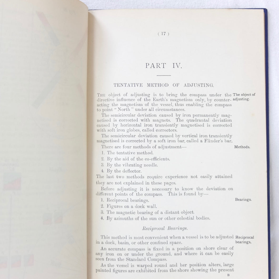 A WW1-era compass adjustment manual, originally owned by Lt Stanley Fielder, a Royal Naval Reserve gunnery officer. All aspects of maritime compass adjustment are examined in detail. The author states in the preface that his intention was to help the reader gain a better undertanding of 'the Magnetism of iron vessels and the Compensation of the Compass'. Subjects covered include: magnetism of ships, magnetic deviation, objects of compass adjusting, the standard compass, methods of adjusting, etc. The book is well illustrated with fold-outs and diagrams, some of which are coloured.