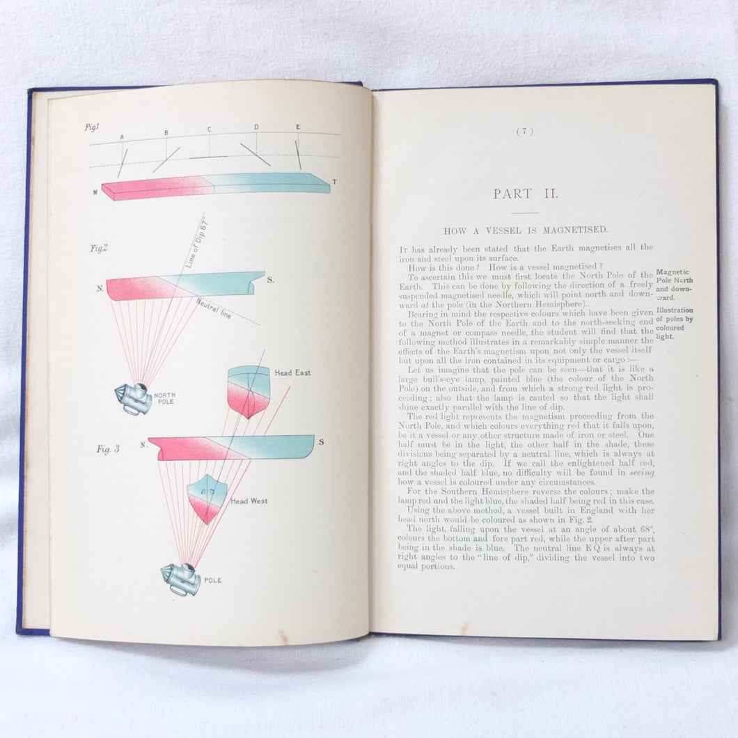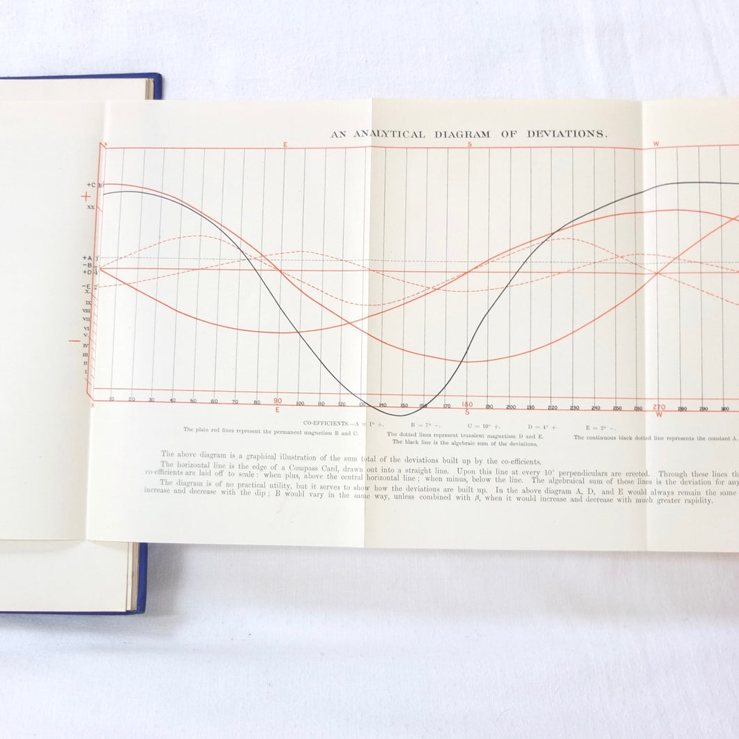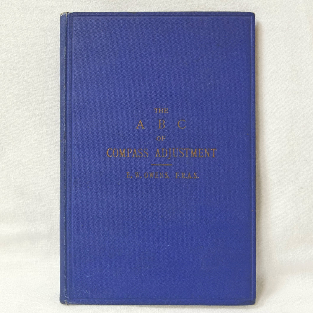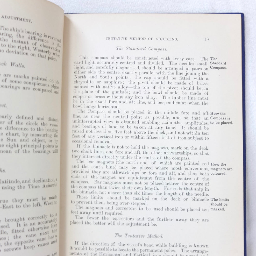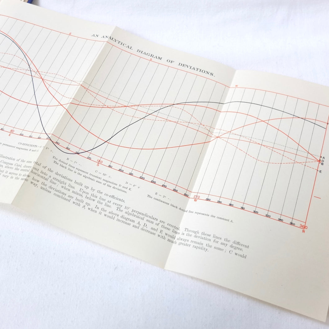 A WW1-era compass adjustment manual, originally owned by Lt Stanley Fielder, a Royal Naval Reserve gunnery officer. All aspects of maritime compass adjustment are examined in detail. The author states in the preface that his intention was to help the reader gain a better undertanding of 'the Magnetism of iron vessels and the Compensation of the Compass'. Subjects covered include: magnetism of ships, magnetic deviation, objects of compass adjusting, the standard compass, methods of adjusting, etc. The book is well illustrated with fold-outs and diagrams, some of which are coloured.