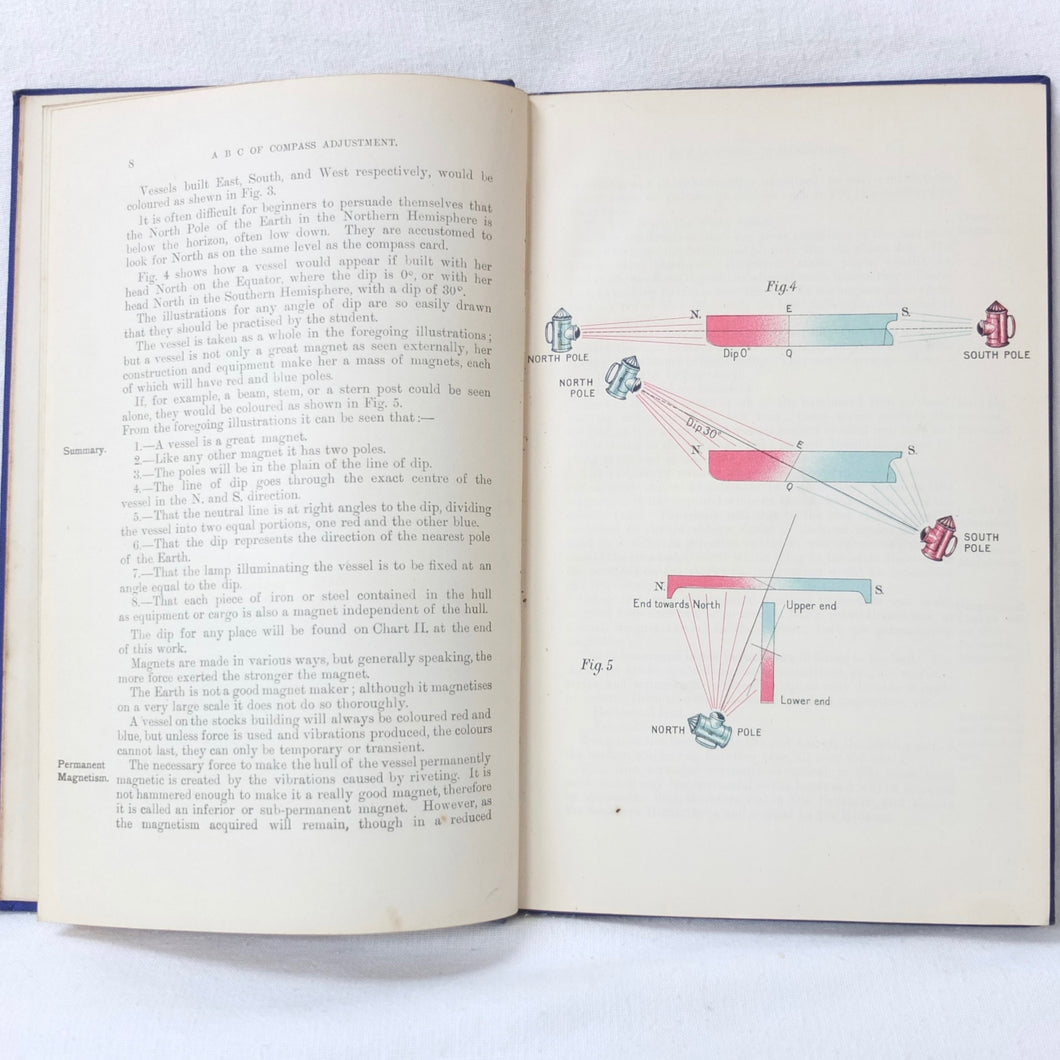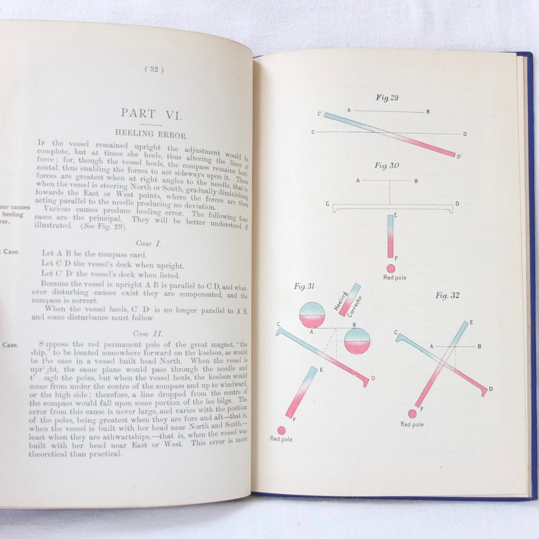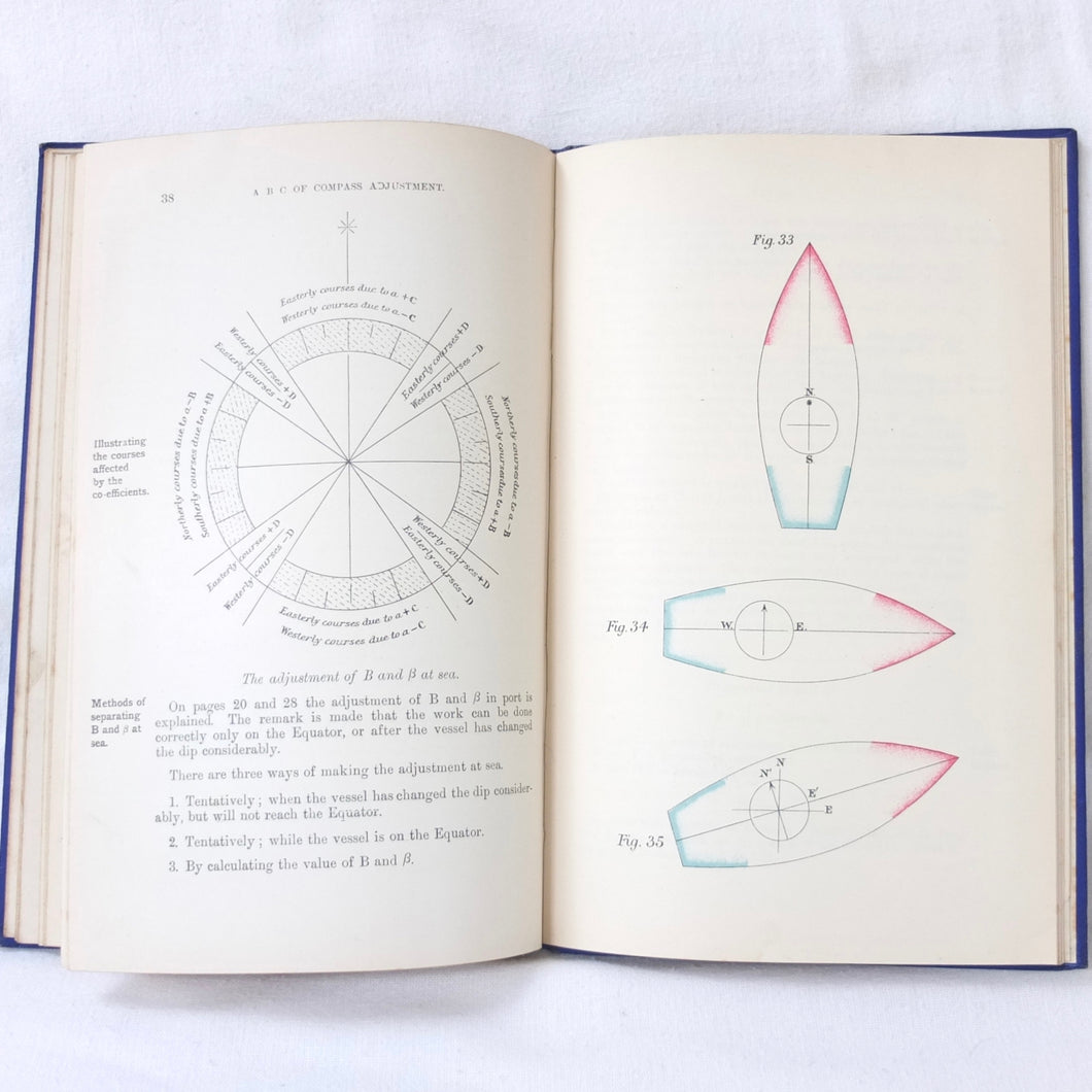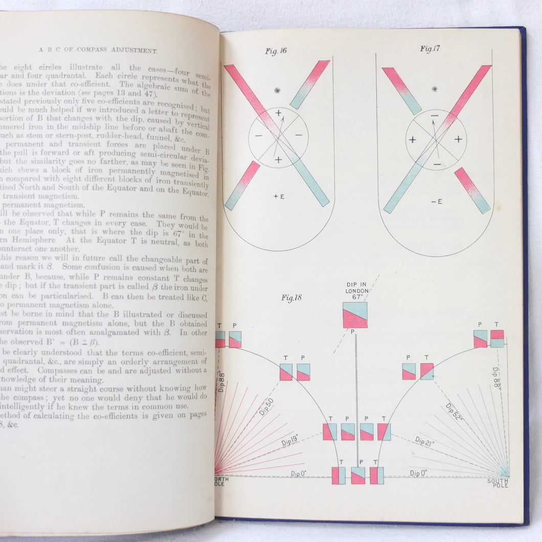 A WW1-era compass adjustment manual, originally owned by Lt Stanley Fielder, a Royal Naval Reserve gunnery officer. All aspects of maritime compass adjustment are examined in detail. The author states in the preface that his intention was to help the reader gain a better undertanding of 'the Magnetism of iron vessels and the Compensation of the Compass'. Subjects covered include: magnetism of ships, magnetic deviation, objects of compass adjusting, the standard compass, methods of adjusting, etc. The book is well illustrated with fold-outs and diagrams, some of which are coloured.