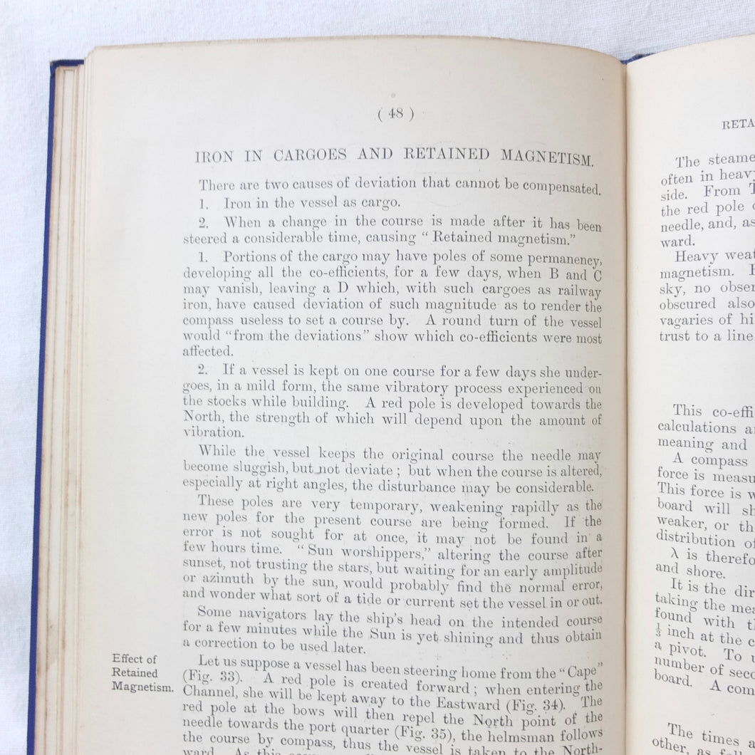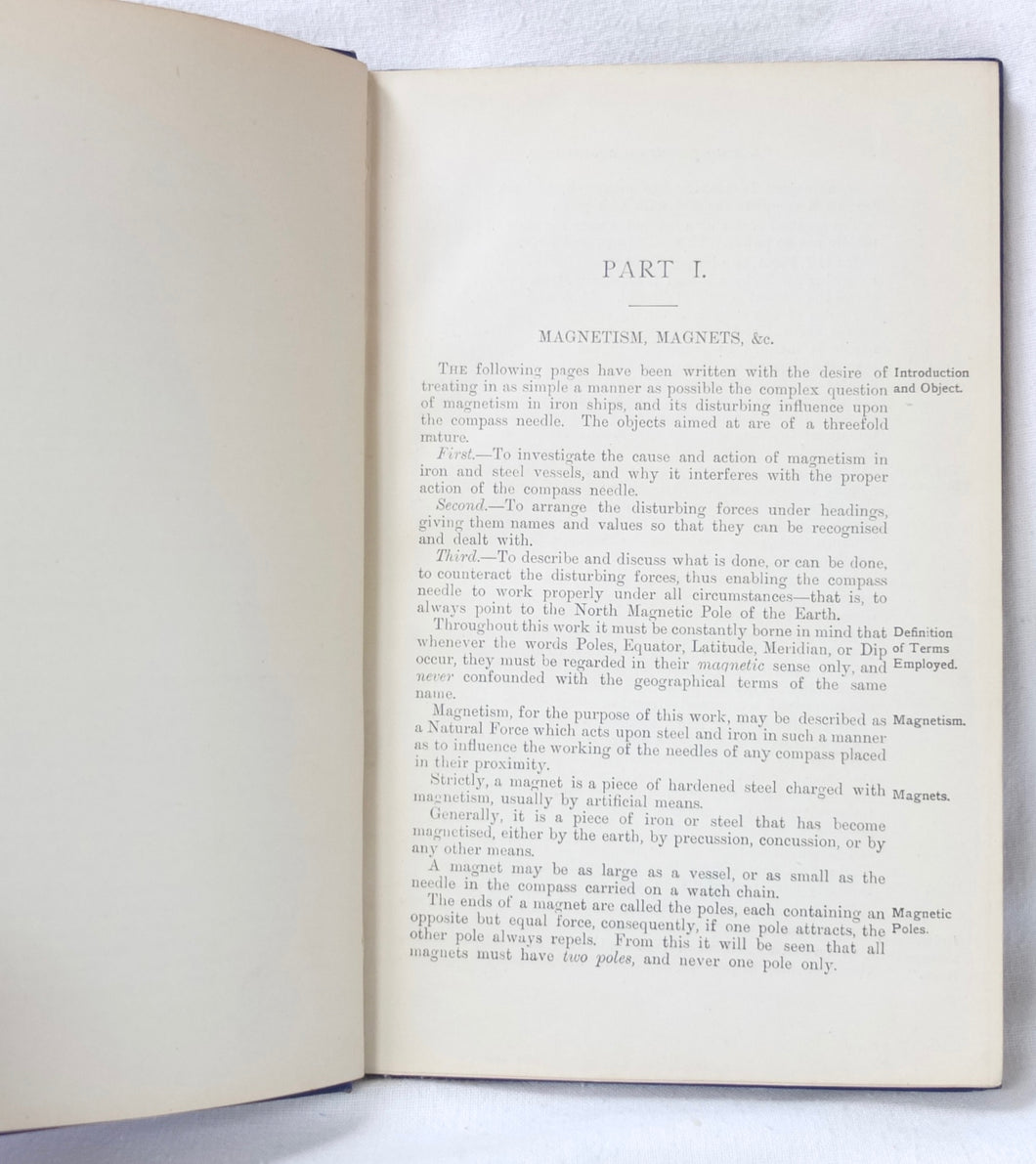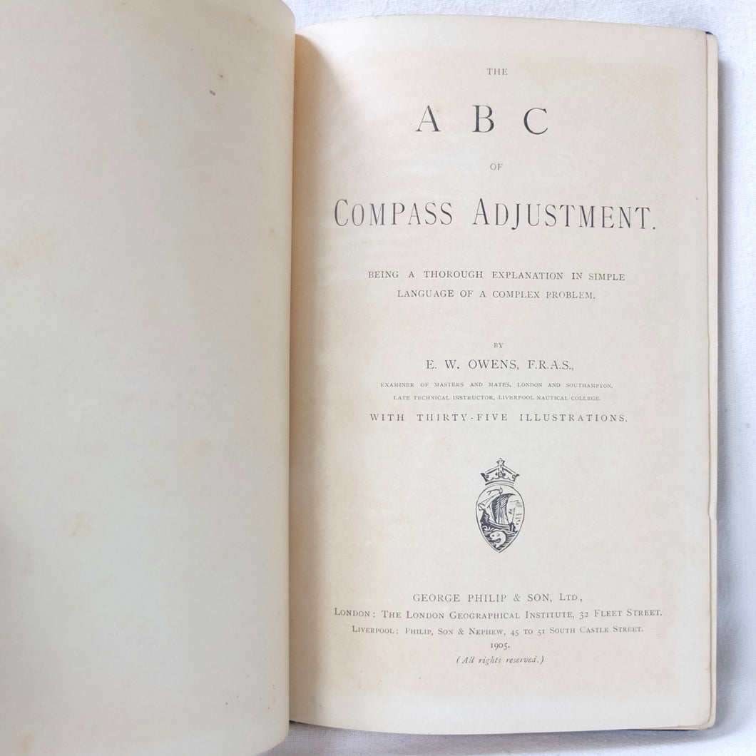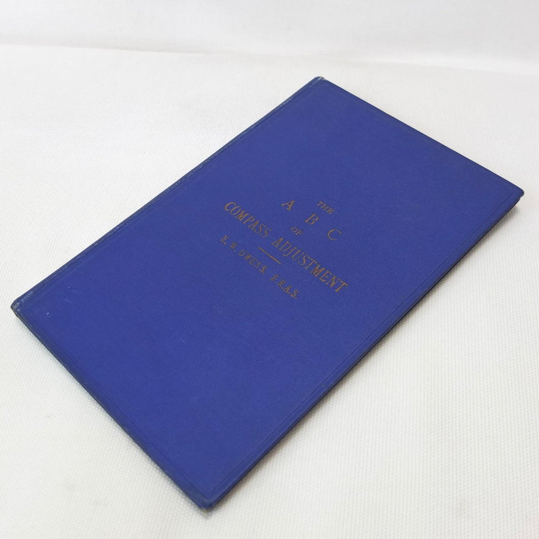 A WW1-era compass adjustment manual, originally owned by Lt Stanley Fielder, a Royal Naval Reserve gunnery officer. All aspects of maritime compass adjustment are examined in detail. The author states in the preface that his intention was to help the reader gain a better undertanding of 'the Magnetism of iron vessels and the Compensation of the Compass'. Subjects covered include: magnetism of ships, magnetic deviation, objects of compass adjusting, the standard compass, methods of adjusting, etc. The book is well illustrated with fold-outs and diagrams, some of which are coloured.