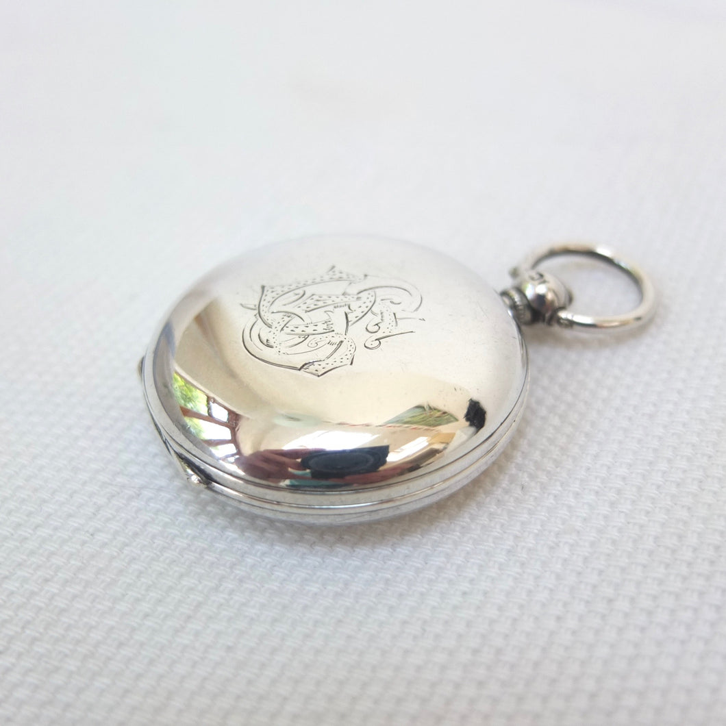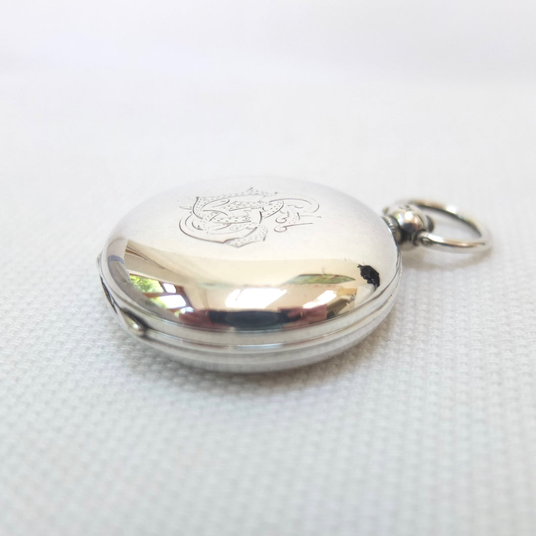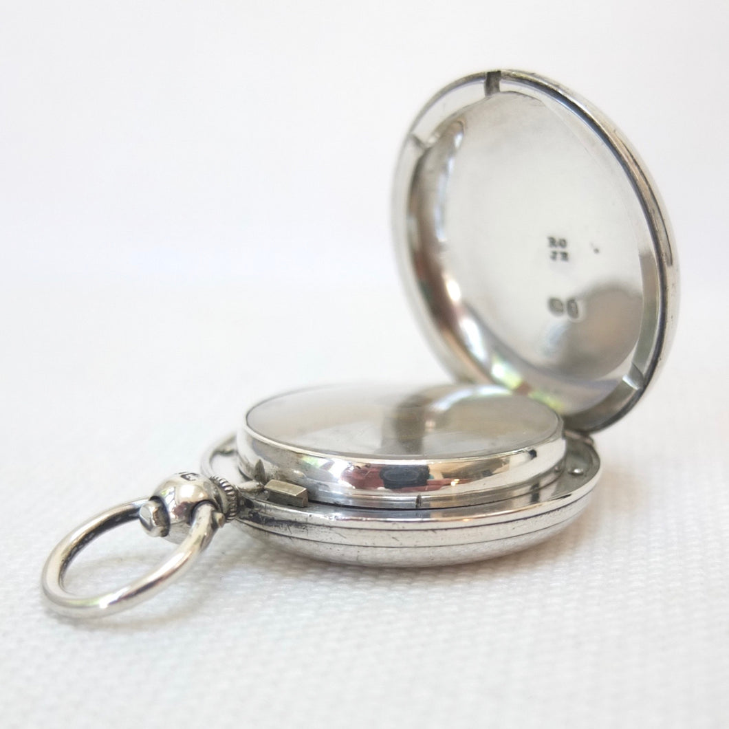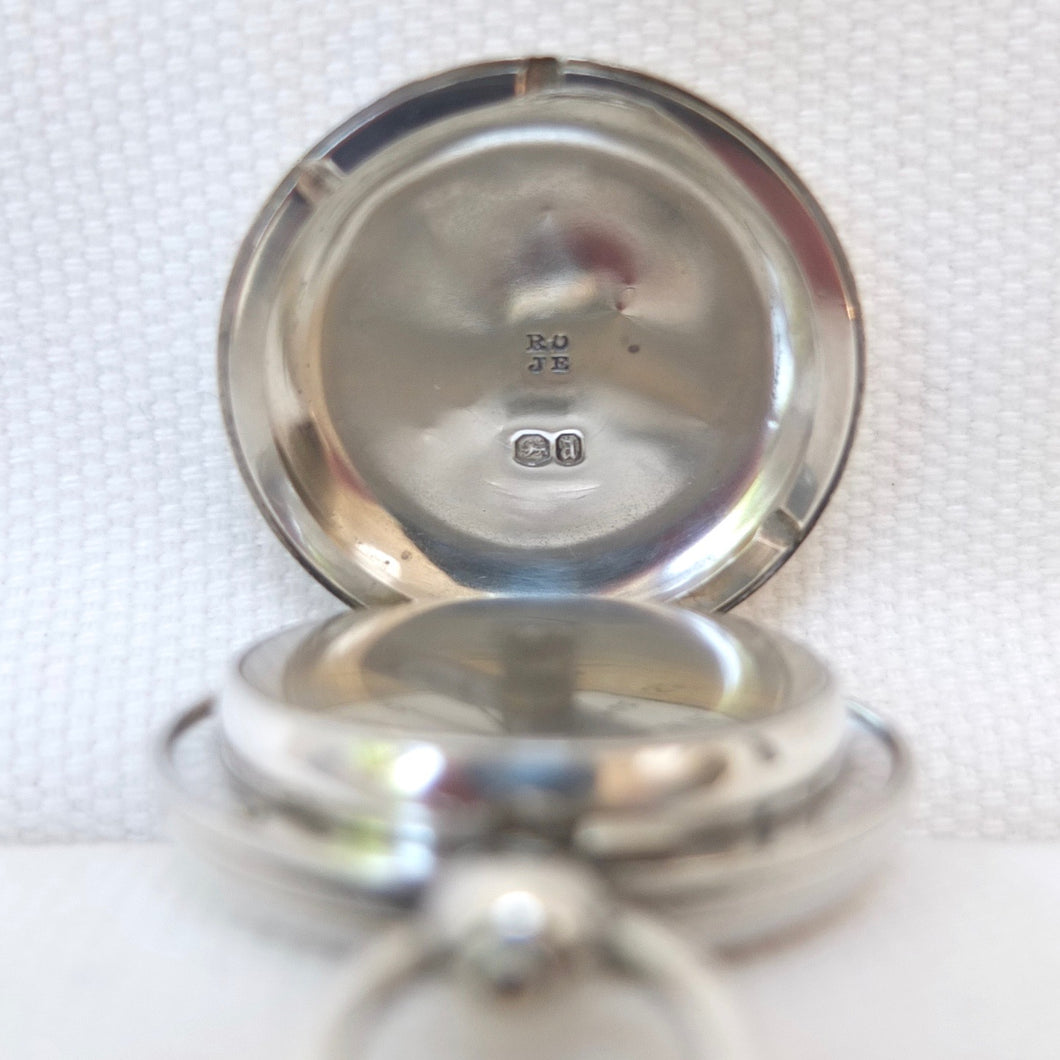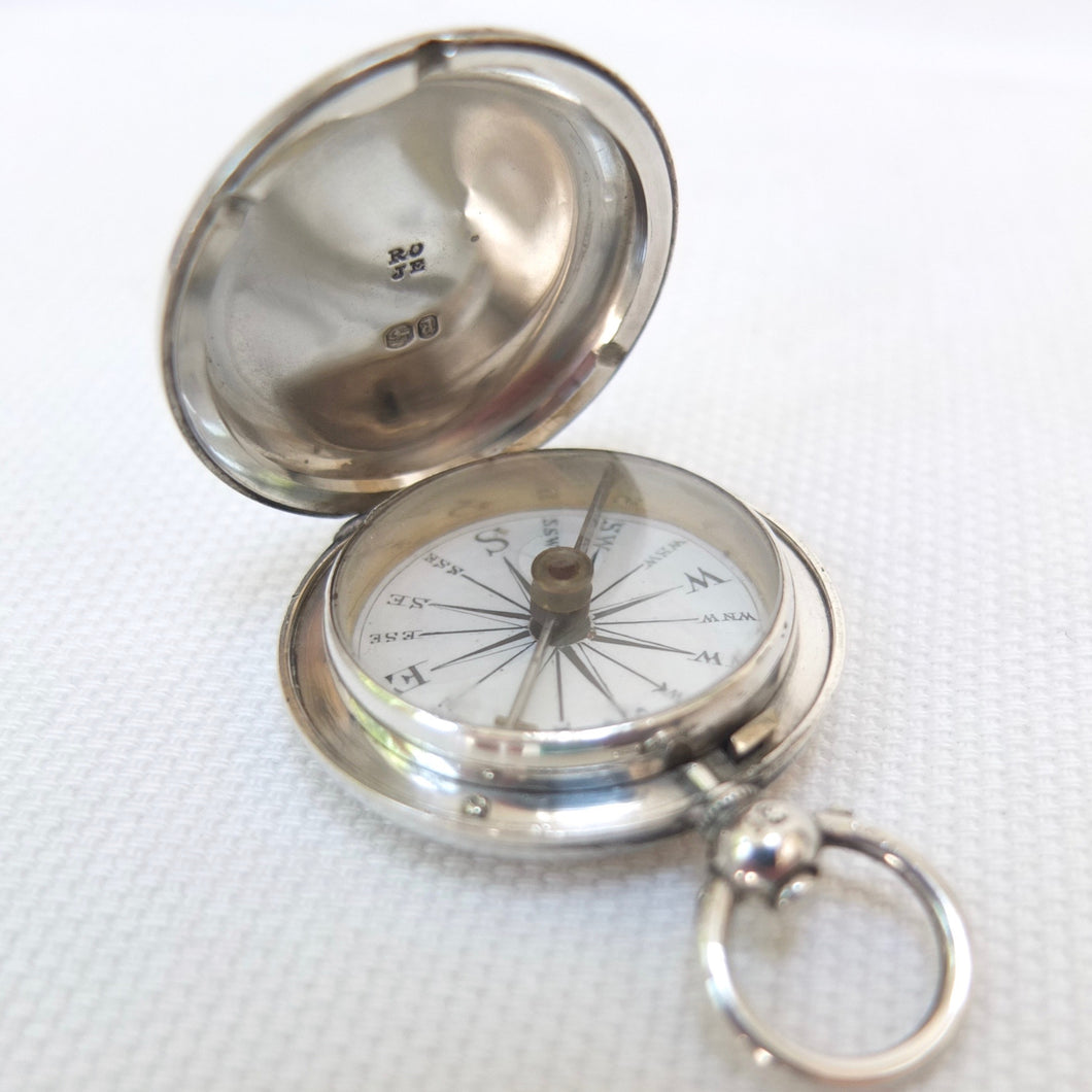 A rare and beautifully made sterling silver early Victorian pocket compass, dating from 1856. The compass has a silver hunter case, hallmarked for London 1856, English bar needle, jewelled pivot, and hand-painted Georgian style enamel compass card. The case has the maker's mark of Richard Oliver and John Edwards, case makers who worked in Galway Street, London from 1846 - 1859. Richard James Oliver was first recorded as working in Galway Street in 1845. Oliver was in partnership at this address with John Edwards and they traded as Oliver and Edwards. The maker's mark 'RO' over 'JE' was first registered at the London Assay Office in 1846. When the partnership was dissolved in 1859, Richard Oliver continued in business at the same address until 1876, when he moved to 1 Northampton Square, Clerkenwell. In 1895 he relocated to 31 Wynyatt Street, Clerkenwell. From 1903 the business was carried on by his son Albert Thomas Oliver. Oliver's business never used modern industrial techniques or machines, continuing to make cases by hand in the old-fashioned way, until the business eventually closed in 1970. The tools and techniques used by the Olivers were a relic of the Georgian era, and they would have been familiar to watch case makers of the eighteenth century.
