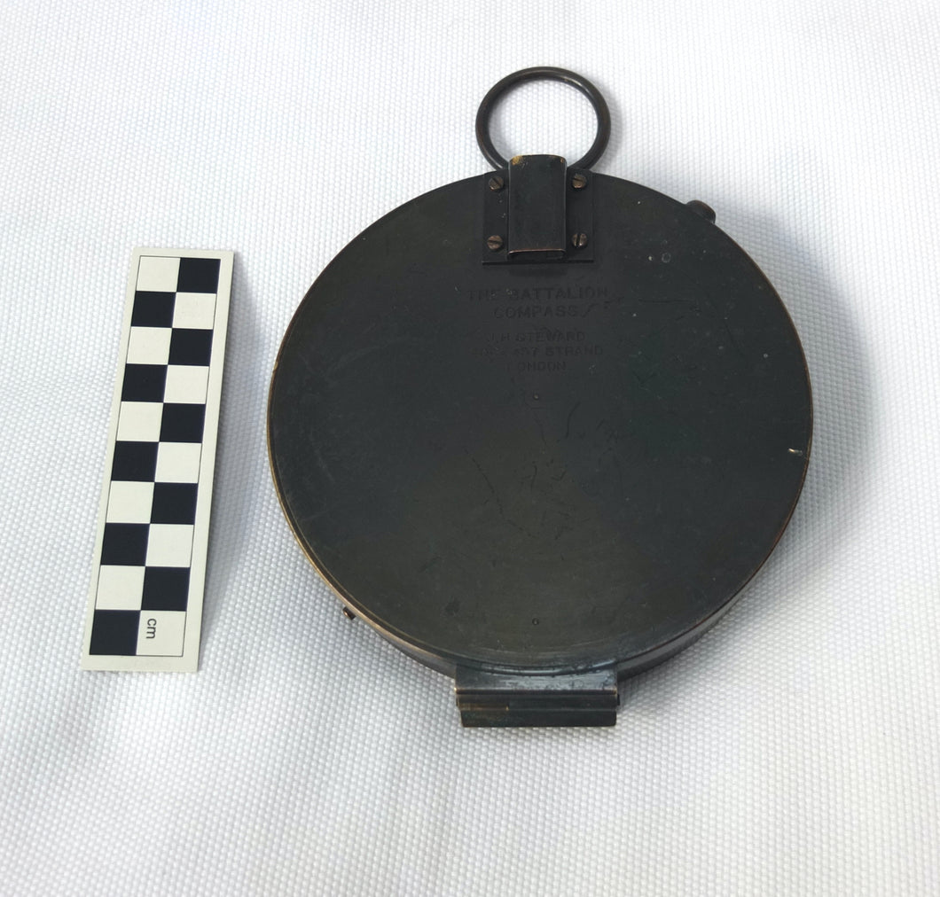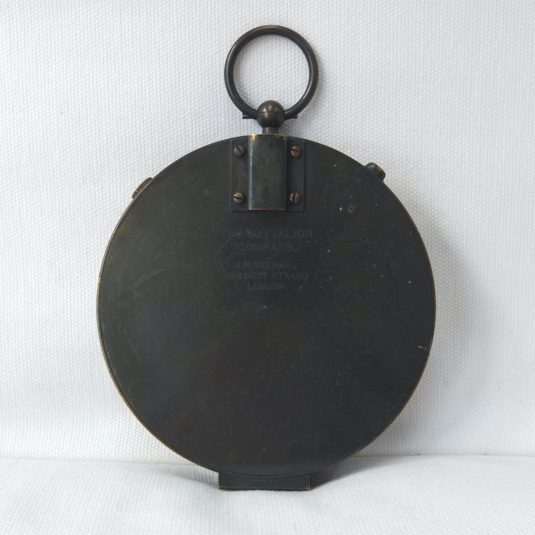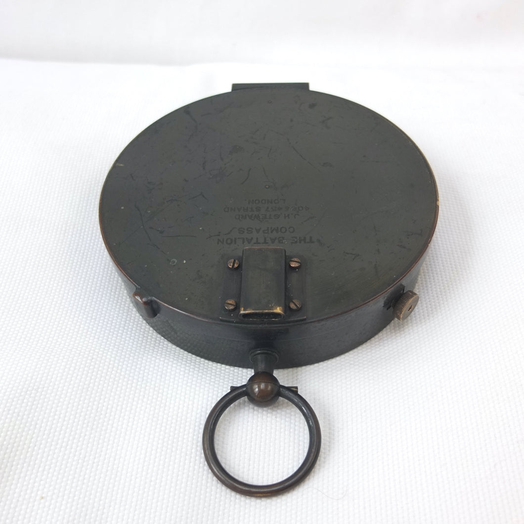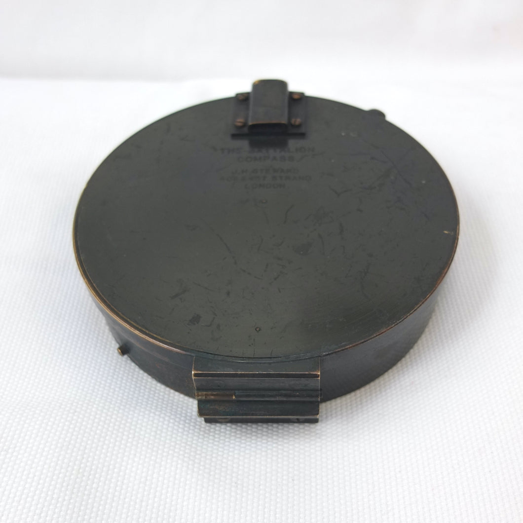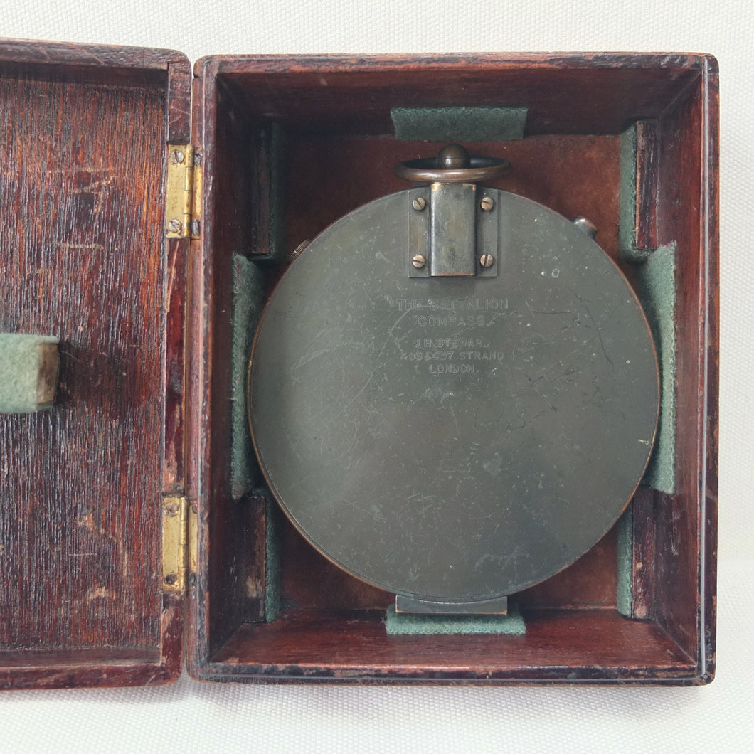The compass has a large and heavy bronzed brass case (120mm diameter), aluminium dial with black painted centre and luminous paper markers, black outer degrees ring, with gold painted degree markings and luminous paper markers, rotating bezel with luminous paper marker under the glass, and a luminous paper sighting line inside the lid. The paper markers were most probably painted with a version of 'Balmain's Luminous Paint', a compound of Calcium Sulphide which was patented by William Balmain in 1877. The paint was made luminous by exposure to sunlight or burning a strip of magnesium ribbon near the dial. The compass has the maker's details engraved on the lid: 'The Battalion Compass, J. H. Steward 406 & 457 Strand, London'. It comes complete with its original wooden box, lined with suede in the base, and with felt covered internal fittings. The box is stamped on the lid and base with the official War Department broad arrow mark.