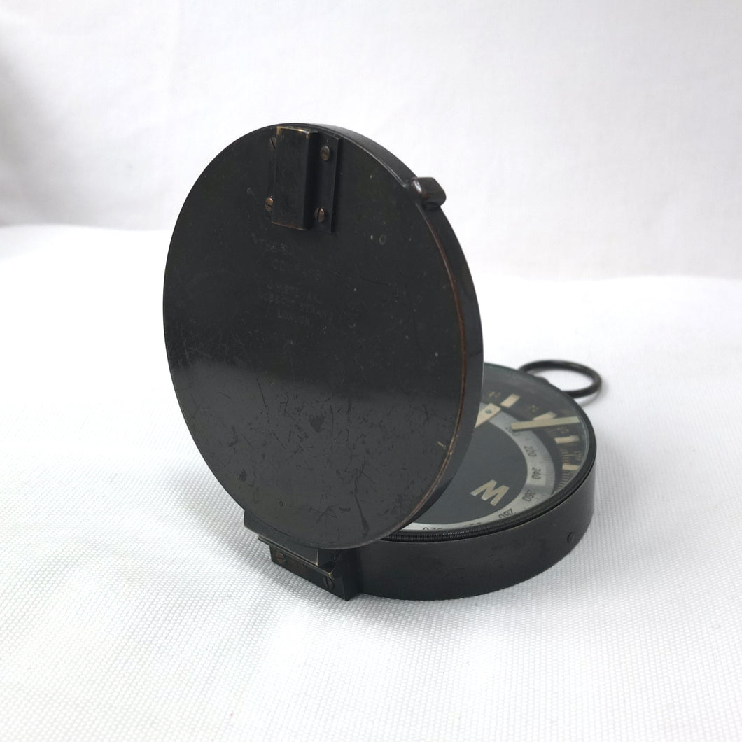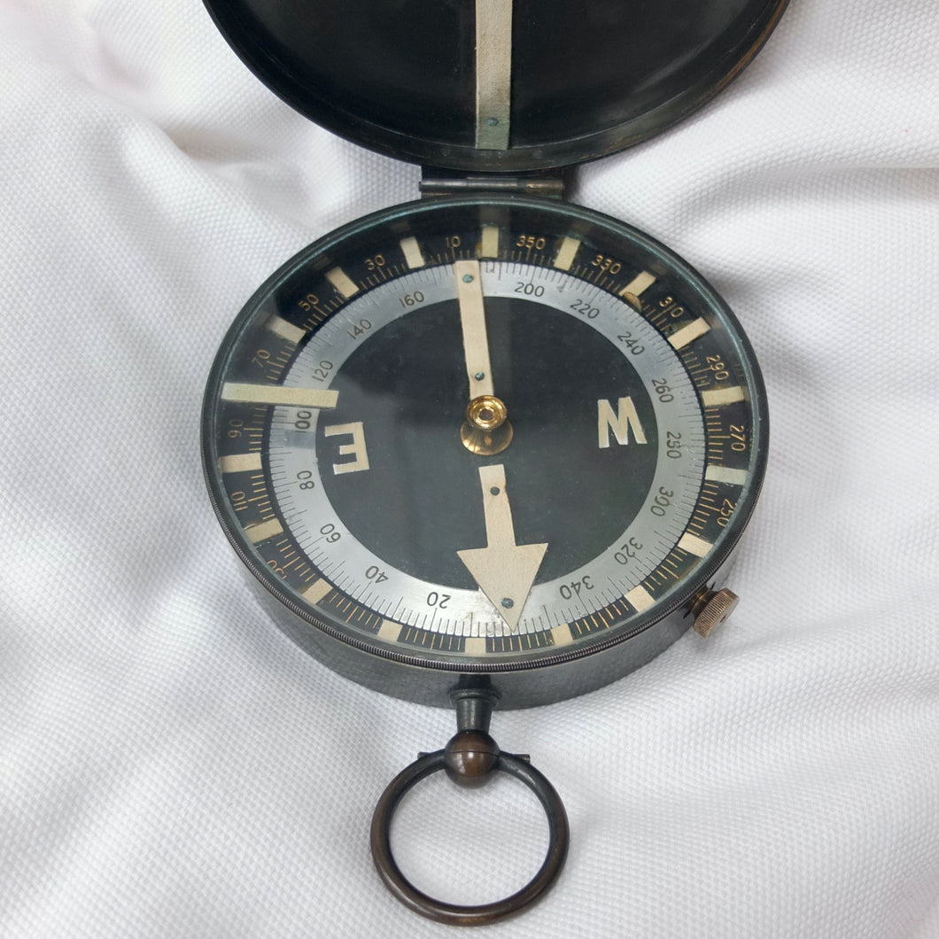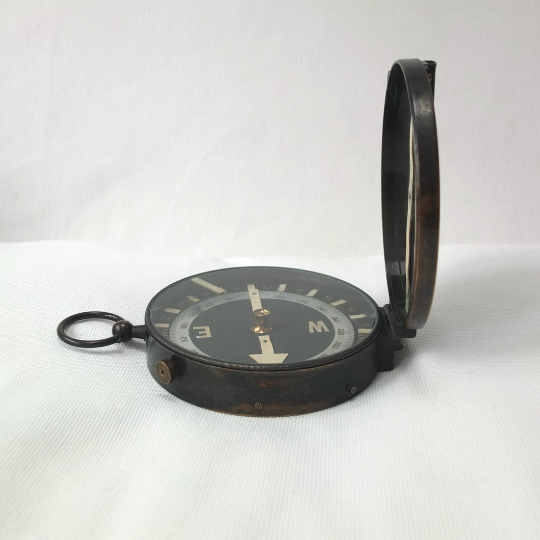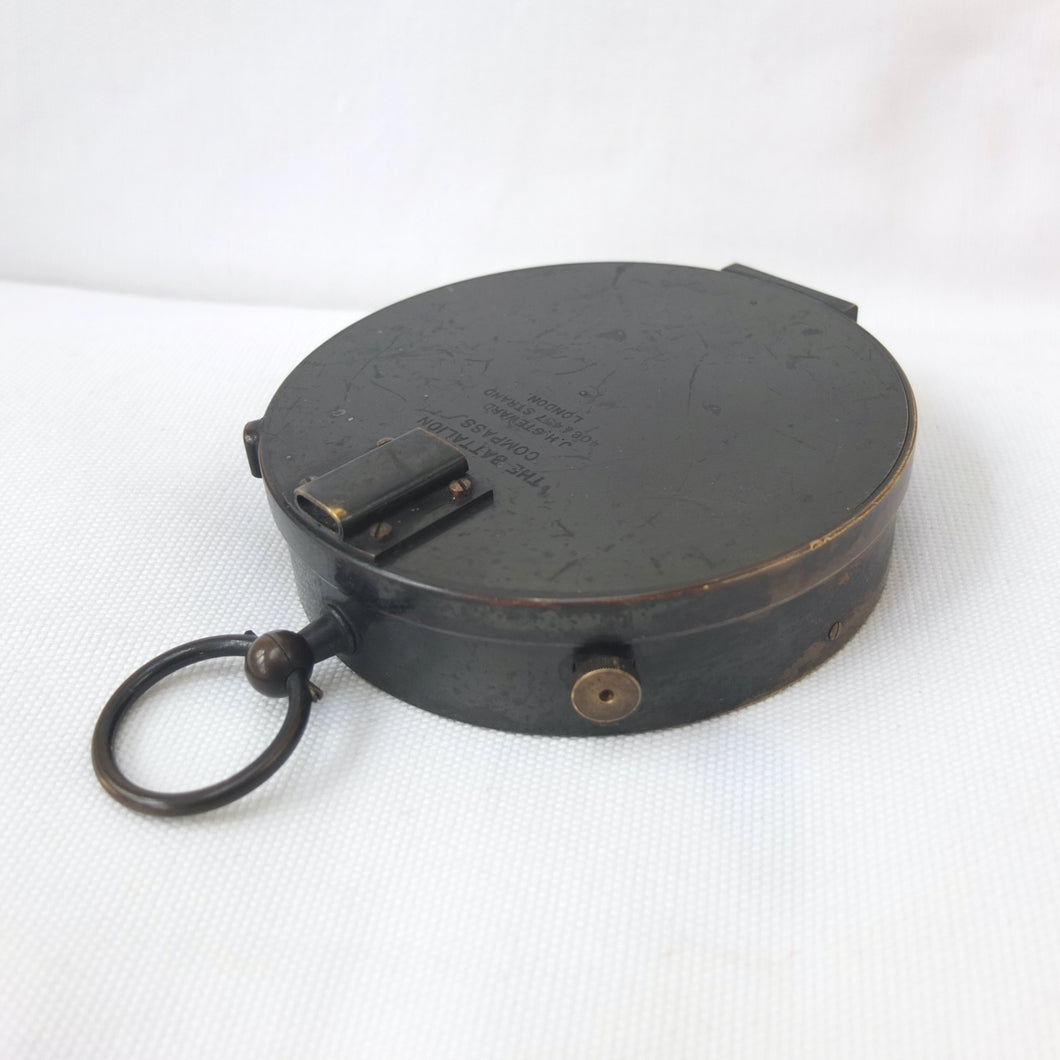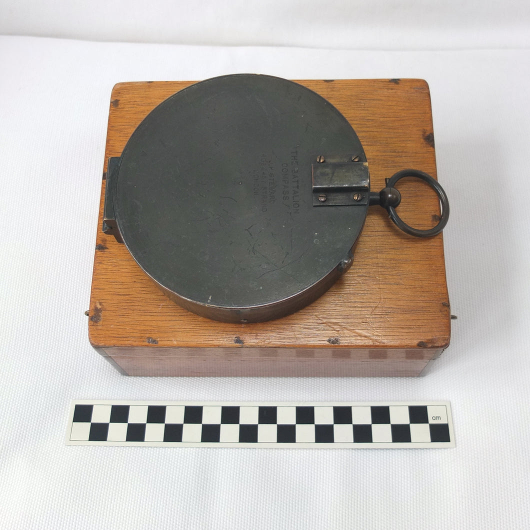 The compass has a large and heavy bronzed brass case (120mm diameter), aluminium dial with black painted centre and luminous paper markers, black outer degrees ring, with gold painted degree markings and luminous paper markers, rotating bezel with luminous paper marker under the glass, and a luminous paper sighting line inside the lid. The paper markers were most probably painted with a version of 'Balmain's Luminous Paint', a compound of Calcium Sulphide which was patented by William Balmain in 1877. The paint was made luminous by exposure to sunlight or burning a strip of magnesium ribbon near the dial. The compass has the maker's details engraved on the lid: 'The Battalion Compass, J. H. Steward 406 & 457 Strand, London'. It comes complete with its original wooden box, lined with suede in the base, and with felt covered internal fittings. The box is stamped on the lid and base with the official War Department broad arrow mark.