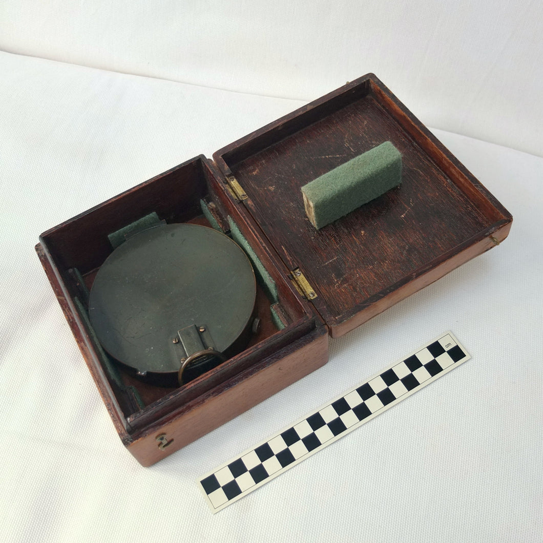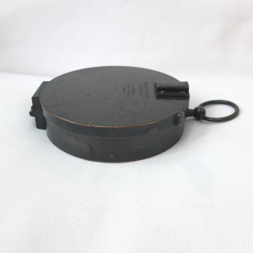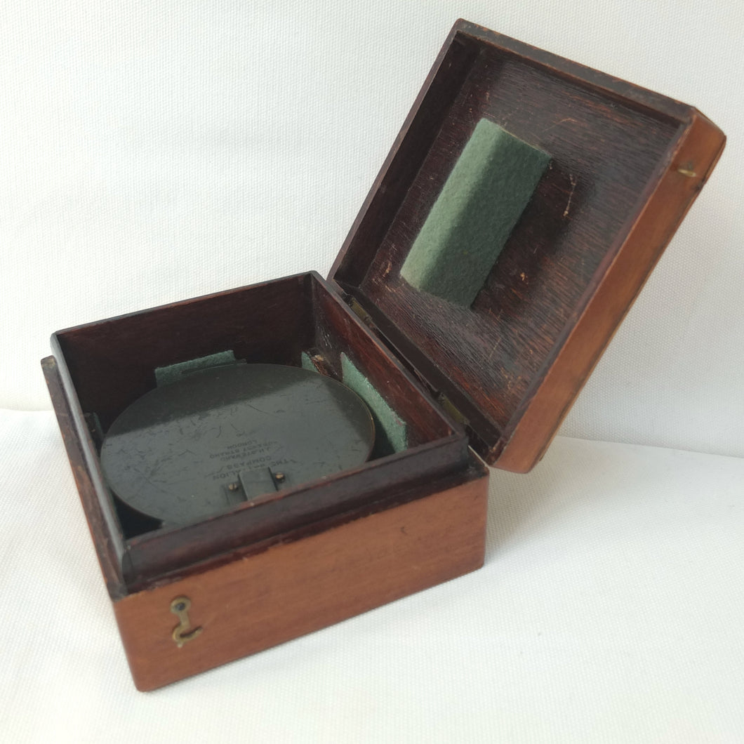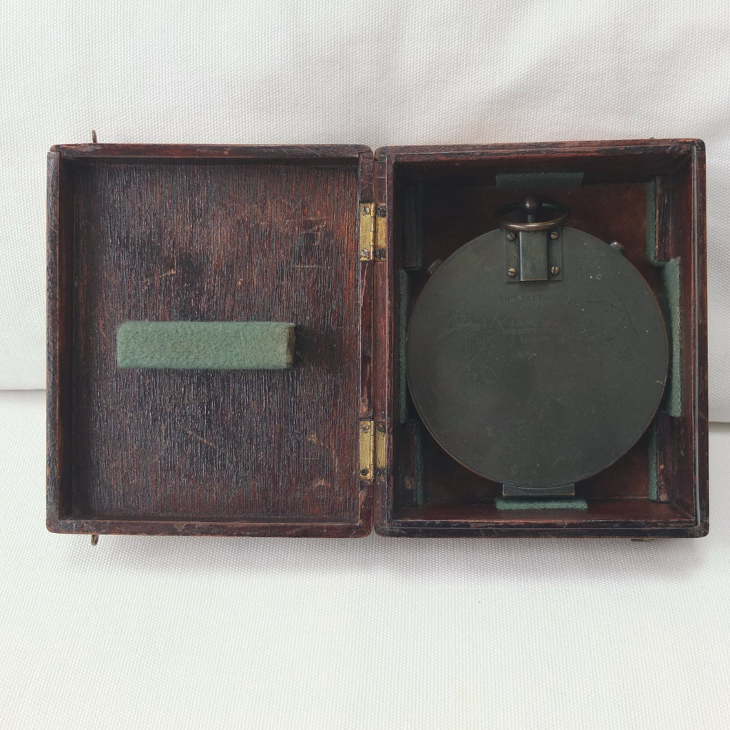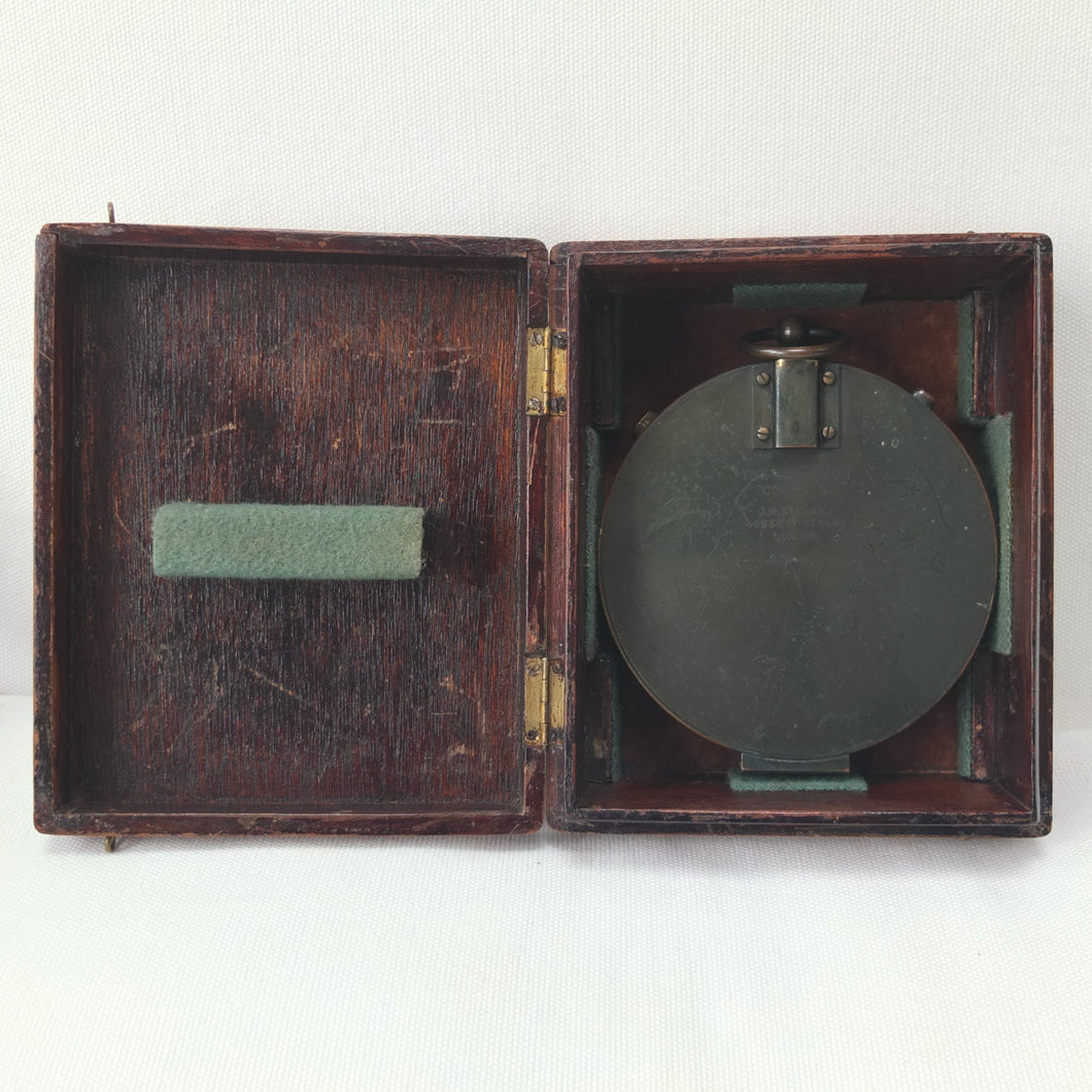 In excellent condition and full working order, with minor signs of use, and some marks and wear to the original bronzed finish of the case. The compass finds North well. The luminous markers no longer glow in the dark. The wooden case is in very good condition, with general signs of use and a few marks.
