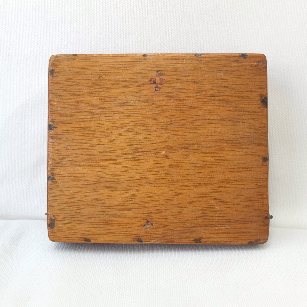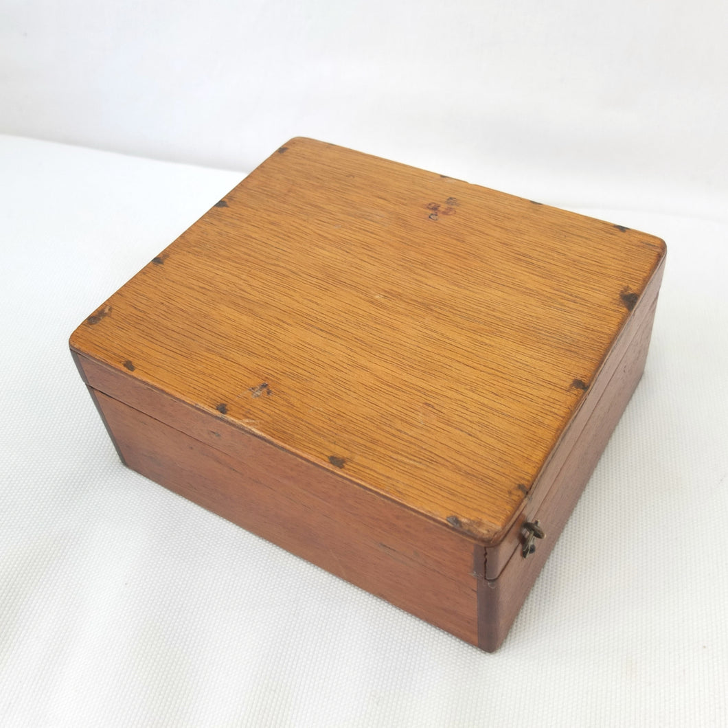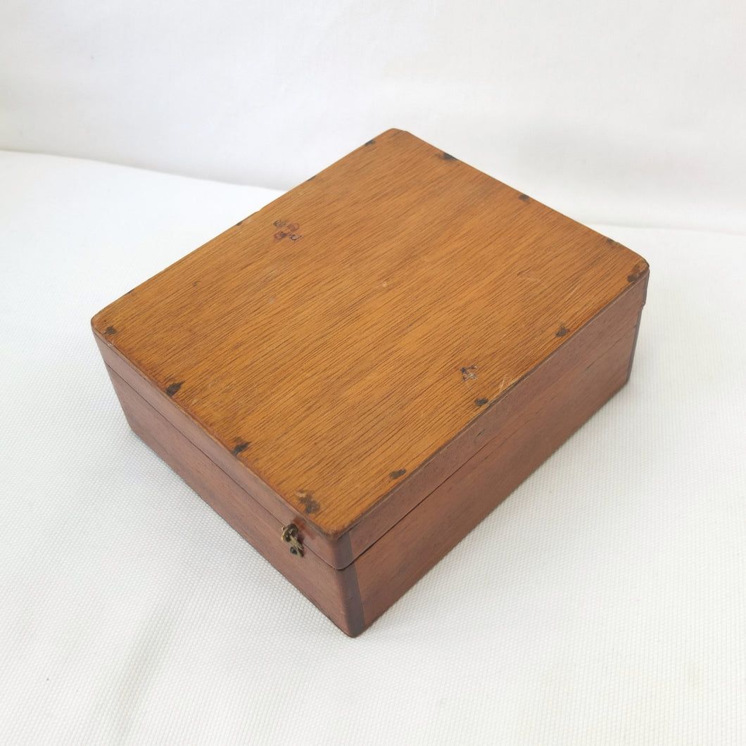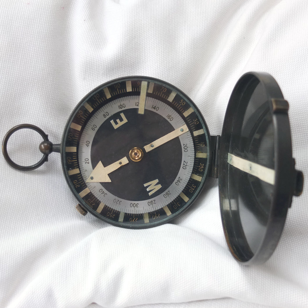 In excellent condition and full working order, with minor signs of use, and some marks and wear to the original bronzed finish of the case. The compass finds North well. The luminous markers no longer glow in the dark. The wooden case is in very good condition, with general signs of use and a few marks.