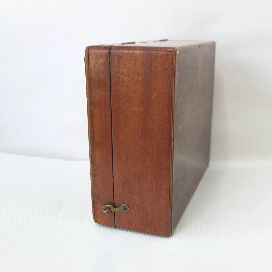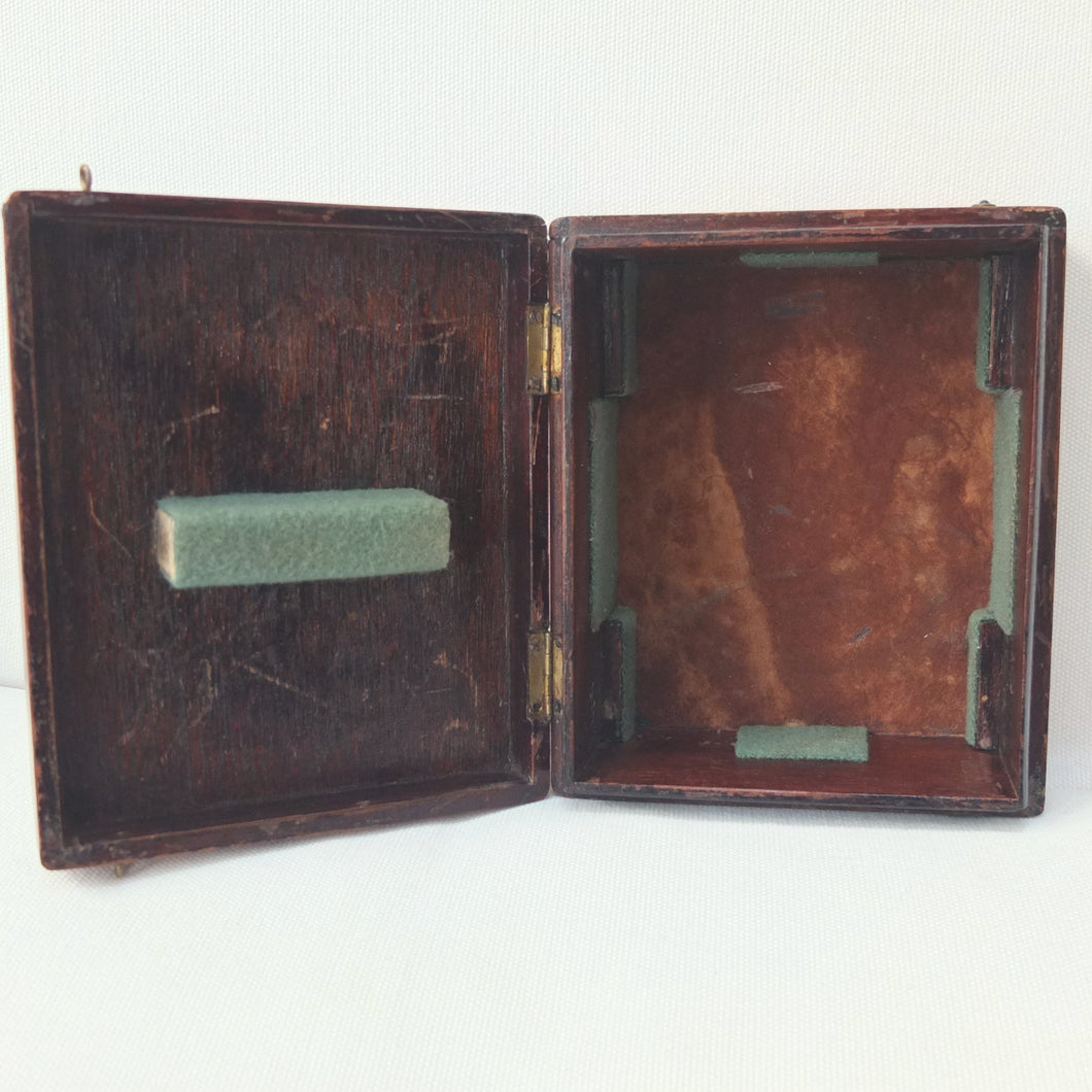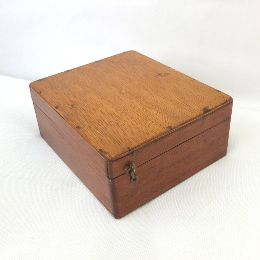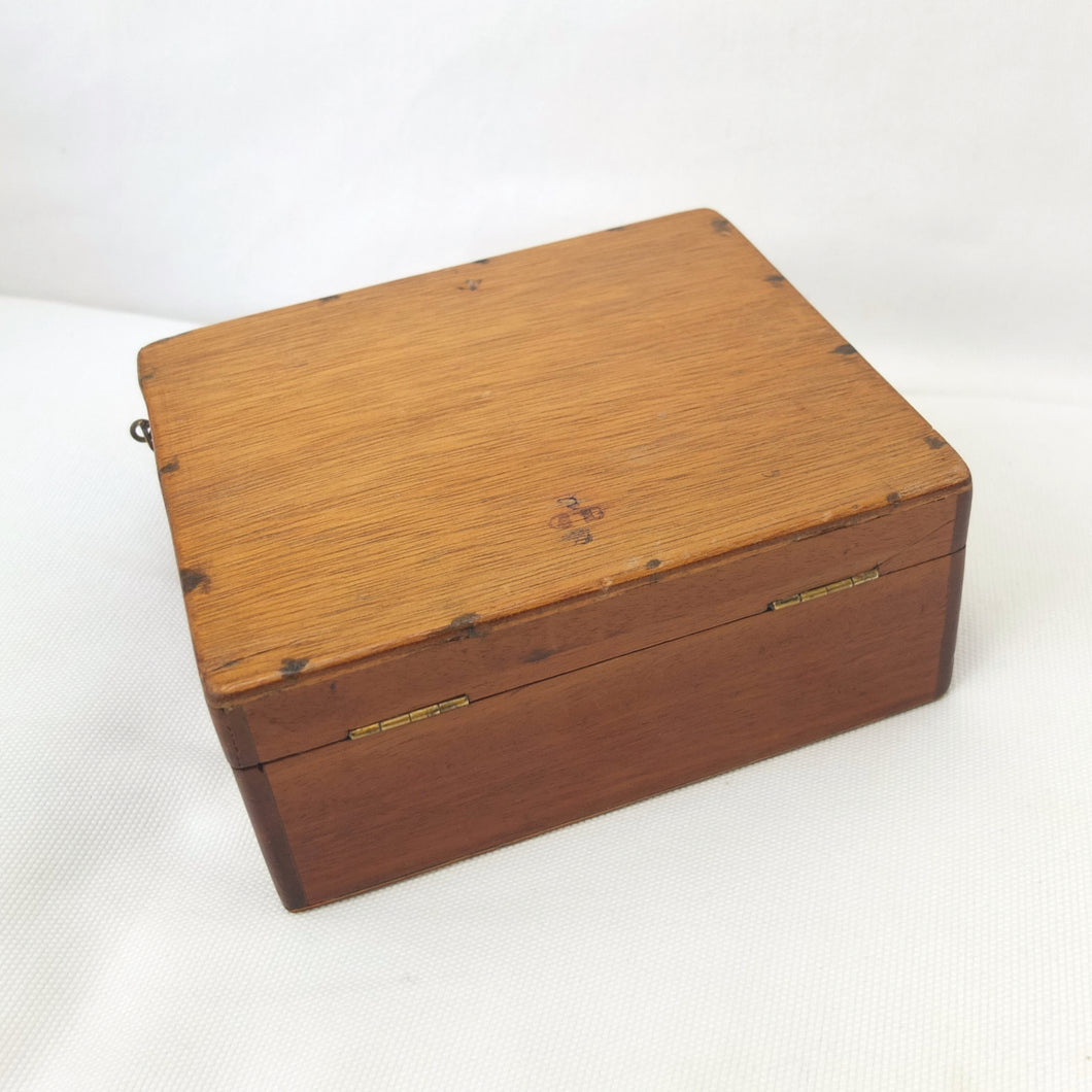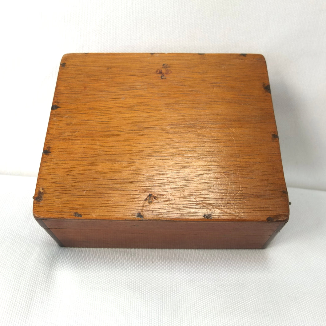 In excellent condition and full working order, with minor signs of use, and some marks and wear to the original bronzed finish of the case. The compass finds North well. The luminous markers no longer glow in the dark. The wooden case is in very good condition, with general signs of use and a few marks.