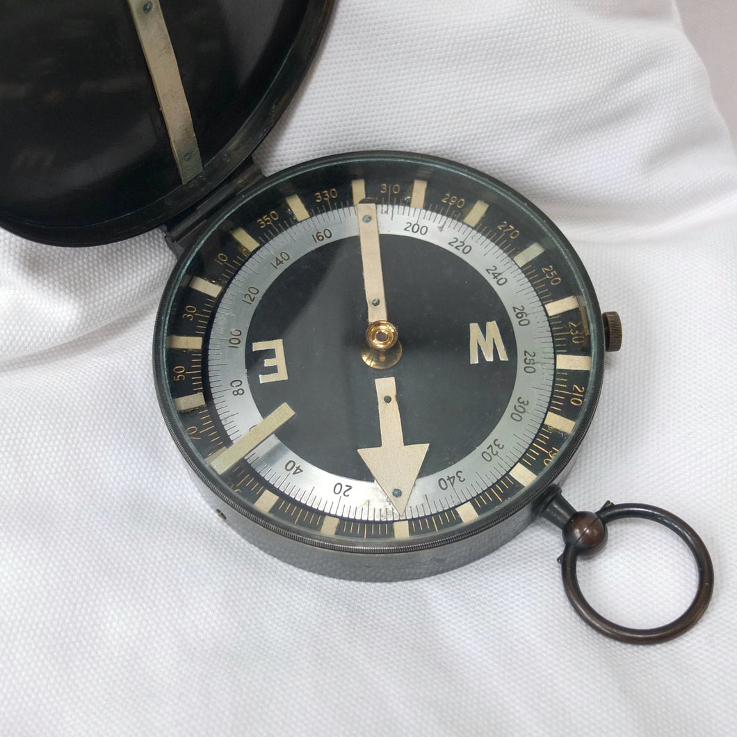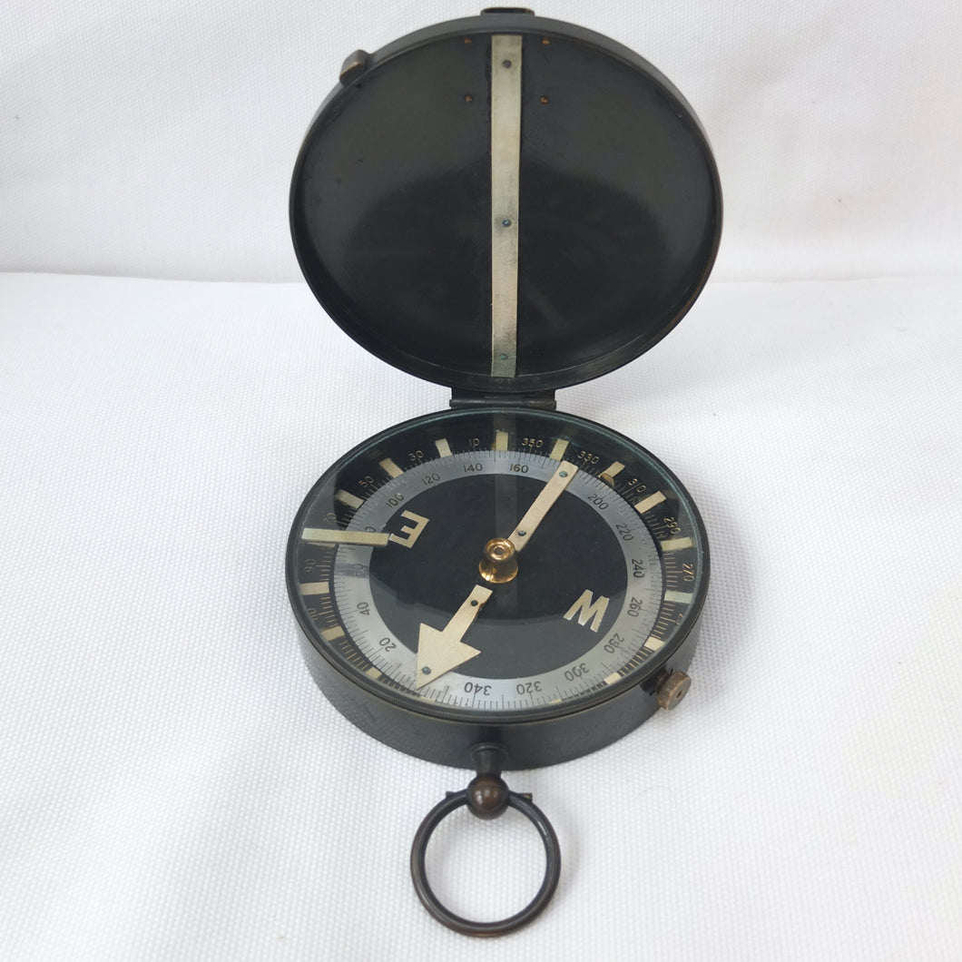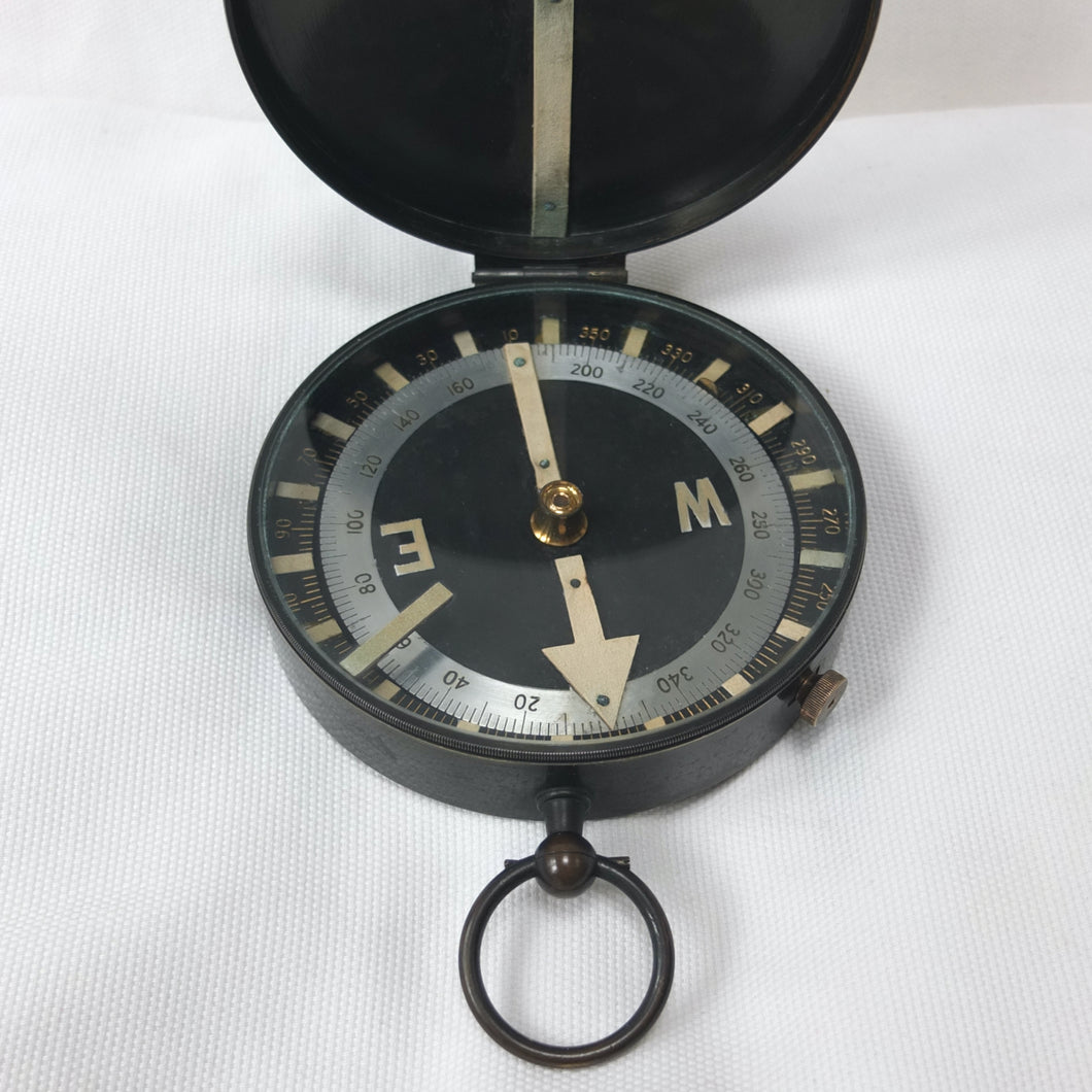 The 'Battalion Luminous Compass' appeared in Steward military instrument catalogues from c.1898 to 1909, and was only produced for a relatively short time, no longer being listed in the 1910 catalogue. Steward described it as having been designed 'so that a most reliable luminous Compass may be available for regimental use, and ensure an unmistakable course for night marching. The fixed outer ring of degrees has unmistakable luminous points at every 20 degrees, and the index bar, which is also luminous, is of corresponding width. It is, therefore, very easy to set and re-set the Compass in the dark with great accuracy'.