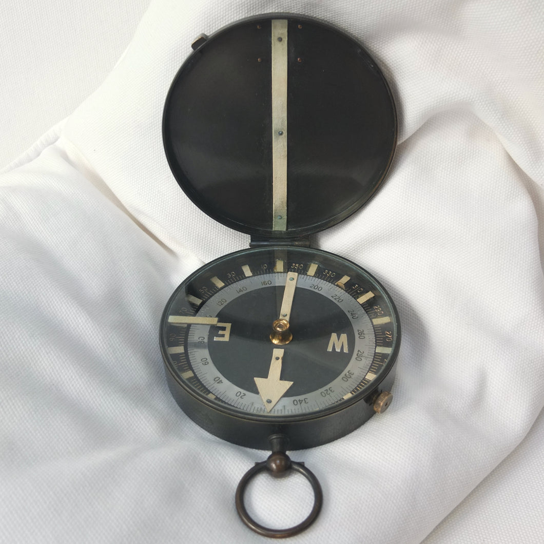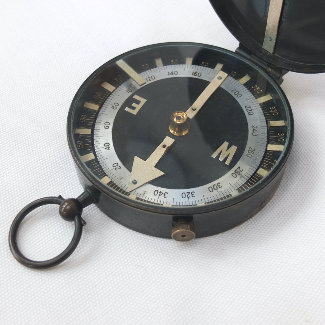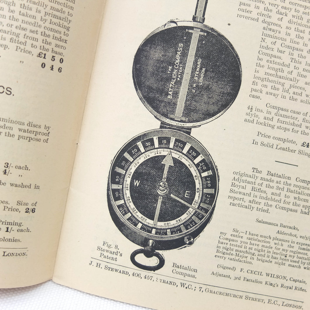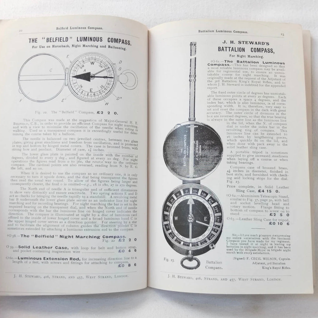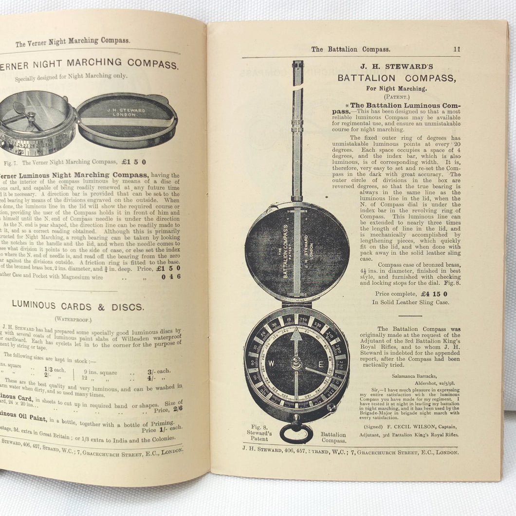 An exceptionally rare J. H. Steward 'Battalion' Night Marching Compass, dating from c.1898. A unique and very distinctive design, the Battalion Compass was originally made by J. H. Steward at the request of Captain Cecil Wilson, the Adjutant of the 3rd battalion King's Royal Rifles. After Captain Wilson had tested the compass in the field, he provided the following testimonial for the 1899 Steward catalogue: 'I have much pleasure in expressing my entire satisfaction with the luminous Compass you have made for my regiment. I have tested it at night in leading my battalion in night marching, and it has been used by the Brigade-Major in brigade night march with every satisfaction'.