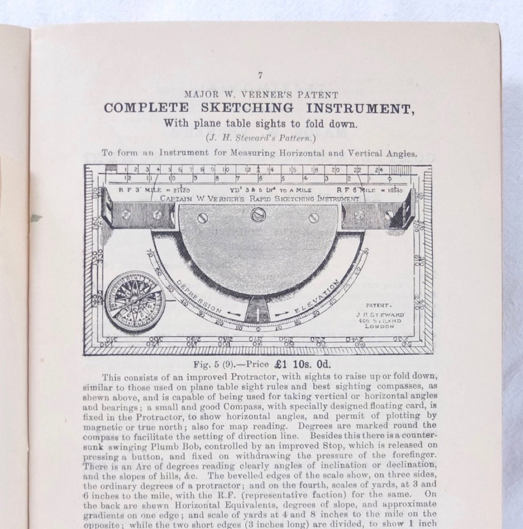 Lt-Colonel Willoghby Verner (1852-1922): was a British army officer and scientific instrument inventor who served on the staff in the Egyptian campaign of 1884-85 and during the Second Boer War. He retired as a Lt-Colonel in May 1904, having never fully recovered after being seriously injured at the battle of Graspan in November 1899. The earliest Verner designs were simple pocket compasses, before he developed an innovative prismatic version, with various models of his service pattern Mk III to Mk VII compass appearing between c.1900-1918. His prismatic compasses were essentially a development of the Schmalcalder Patent design of the early 19th century, but they remained the standard service compass of the British army until the start of WW2. As well as designing compasses, Verner was a prolific author, military historian and chronicler of the Rifle Brigade. Verner was also briefly Professor of Topography at Sandhurst, inventing the 'Complete Sketching Instrument' and developing his own version of the Cavalry Sketching Board. He patented his improvements to the board in 1887 and 1891 and it became generally known as the ‘Verner's'. He had a long standing business relationship with J. H. Steward Ltd, and they produced versions of many of his instruments, including service compasses, plane tables, sketching boards, and the 'Complete Sketcher'.