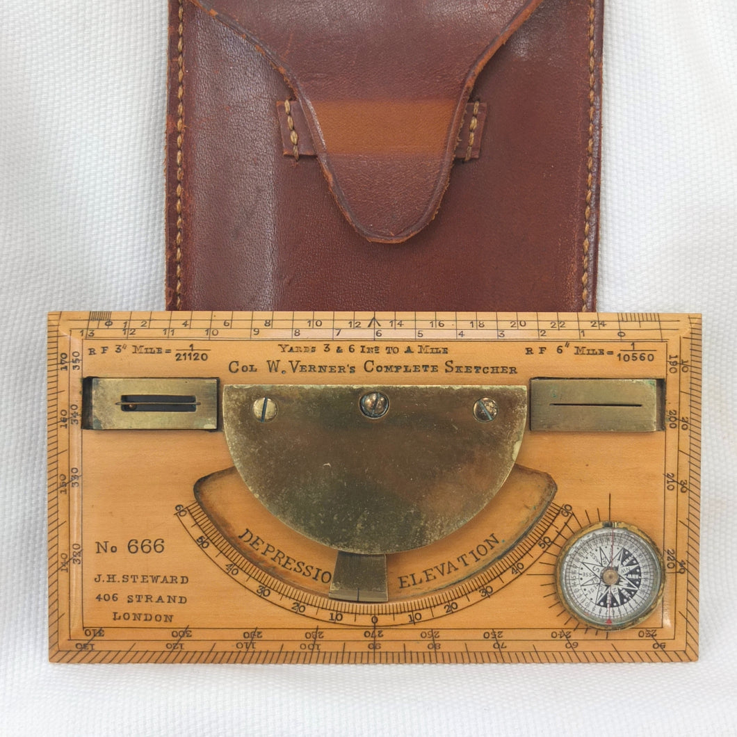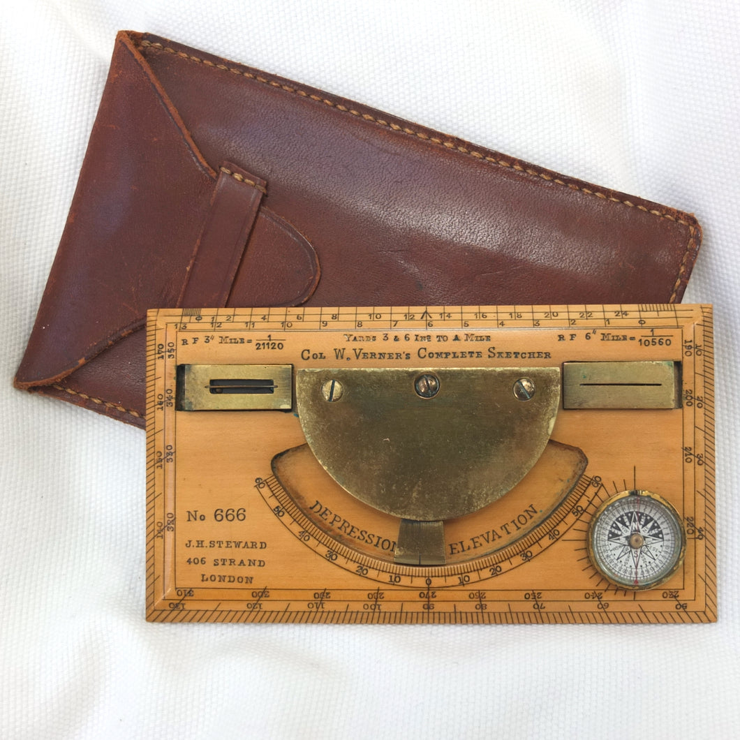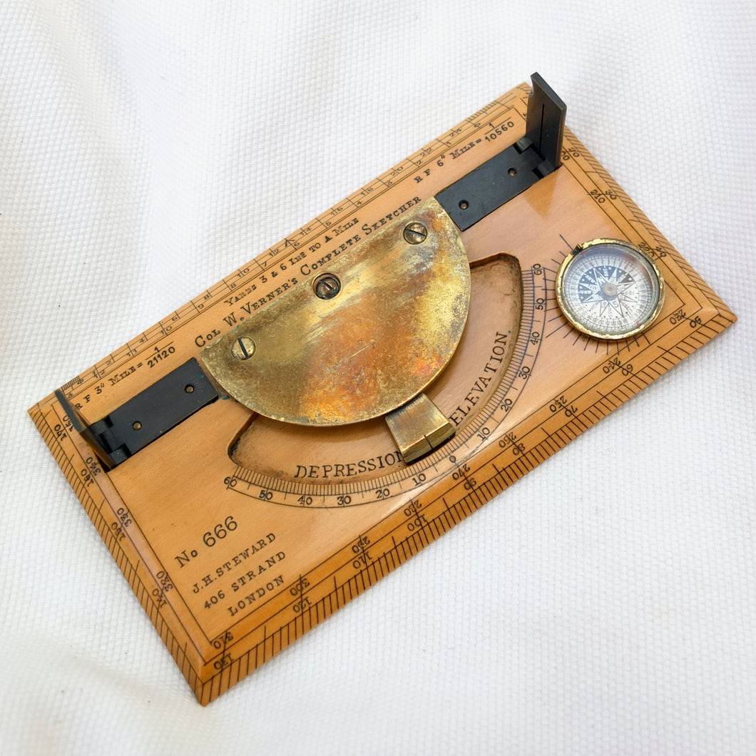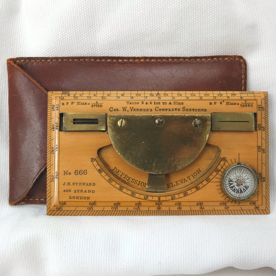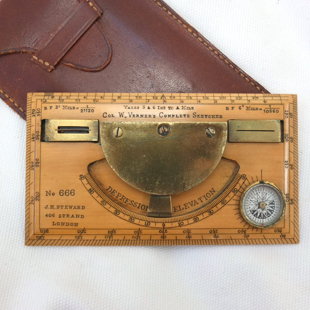 A very rare J. H. Steward Verner's Complete Sketching Instrument, dating from c.1896. The 'Verner's Complete Sketcher' appeared in Steward military instrument catalogues from c.1893 to 1916, and was intended for 'Prospecting and Military Use'. Made of boxwood, with brass sights, clinometer, and inset compass, it comes complete with its original fitted leather case. The 1899 Steward catalogue included the following testimonial from Major J. Burton Foster of the Royal Irish Regiment: 'I have very carefully examined and tried the compact little "Complete Sketching Instrument" designed by Captain W. Verner. With it anyone acquainted with Military Surveying can execute a reliable map in a rapid and very satisfactory mannner, independent of any extras save sketching case, pencil and India rubber. When proceeding on active service again, I shall take care one of these instruments forms part of my field kit'.