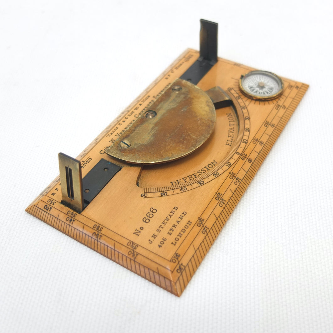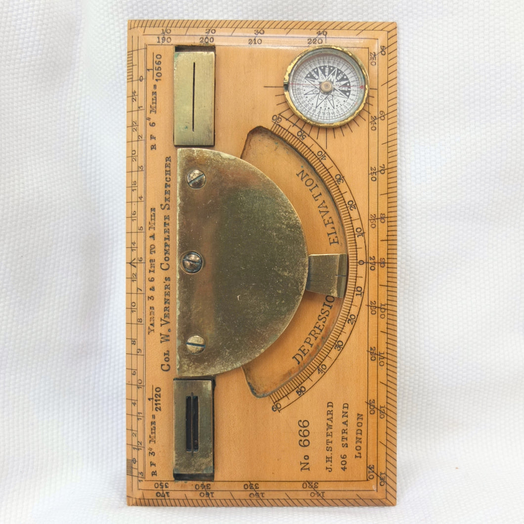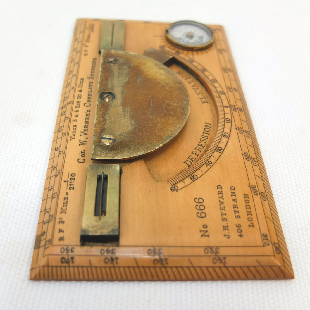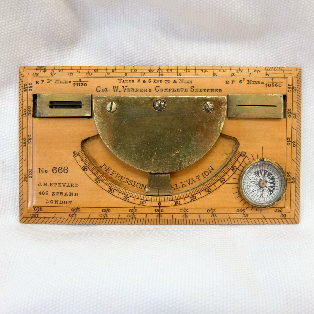 A very rare J. H. Steward Verner's Complete Sketching Instrument, dating from c.1896. The 'Verner's Complete Sketcher' appeared in Steward military instrument catalogues from c.1893 to 1916, and was intended for 'Prospecting and Military Use'. Made of boxwood, with brass sights, clinometer, and inset compass, it comes complete with its original fitted leather case. The 1899 Steward catalogue included the following testimonial from Major J. Burton Foster of the Royal Irish Regiment: 'I have very carefully examined and tried the compact little "Complete Sketching Instrument" designed by Captain W. Verner. With it anyone acquainted with Military Surveying can execute a reliable map in a rapid and very satisfactory mannner, independent of any extras save sketching case, pencil and India rubber. When proceeding on active service again, I shall take care one of these instruments forms part of my field kit'.