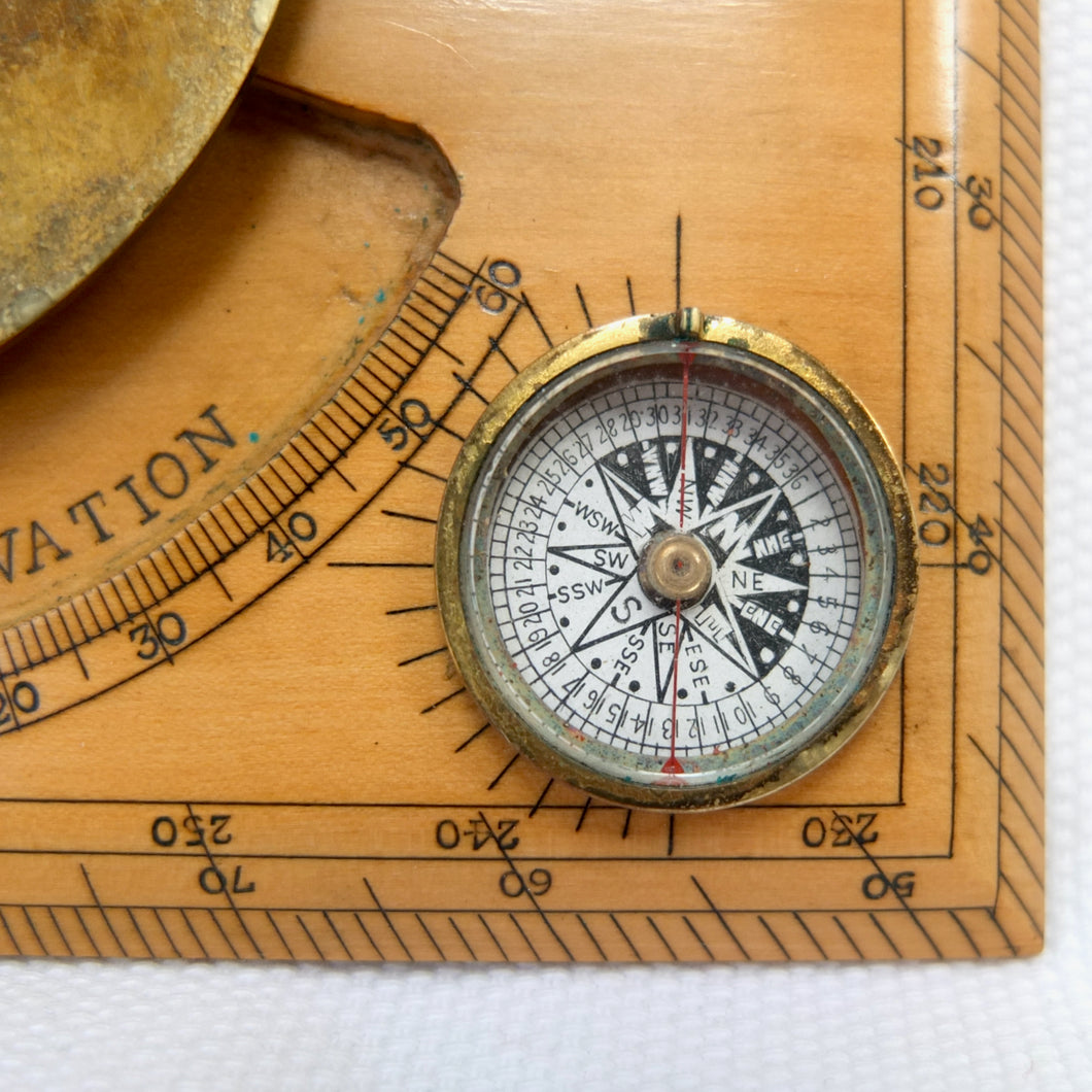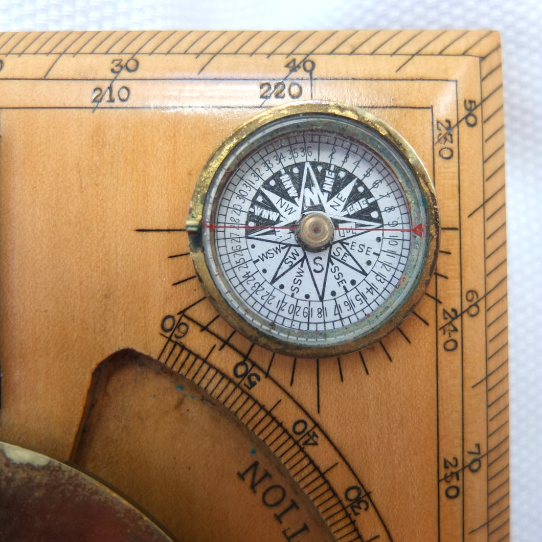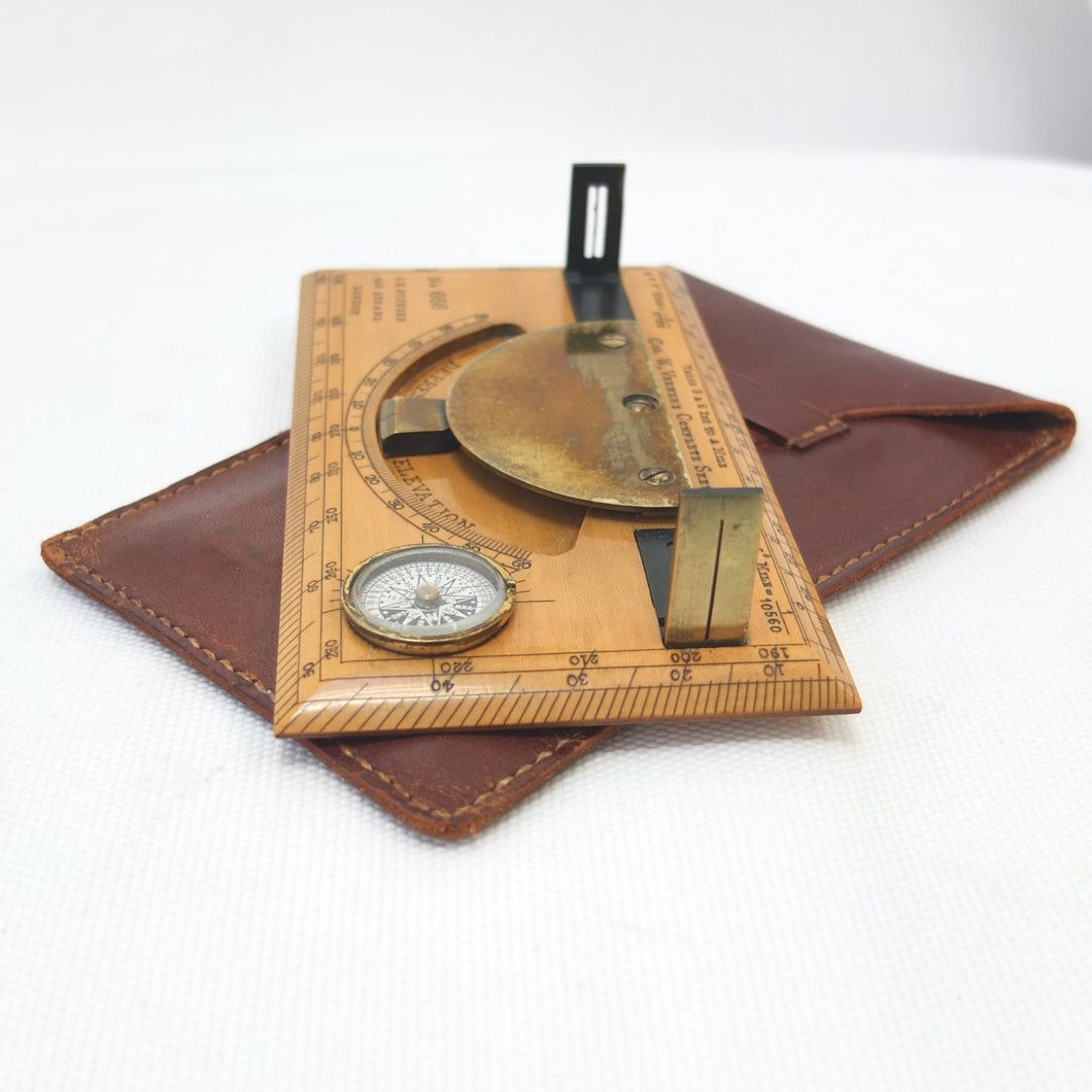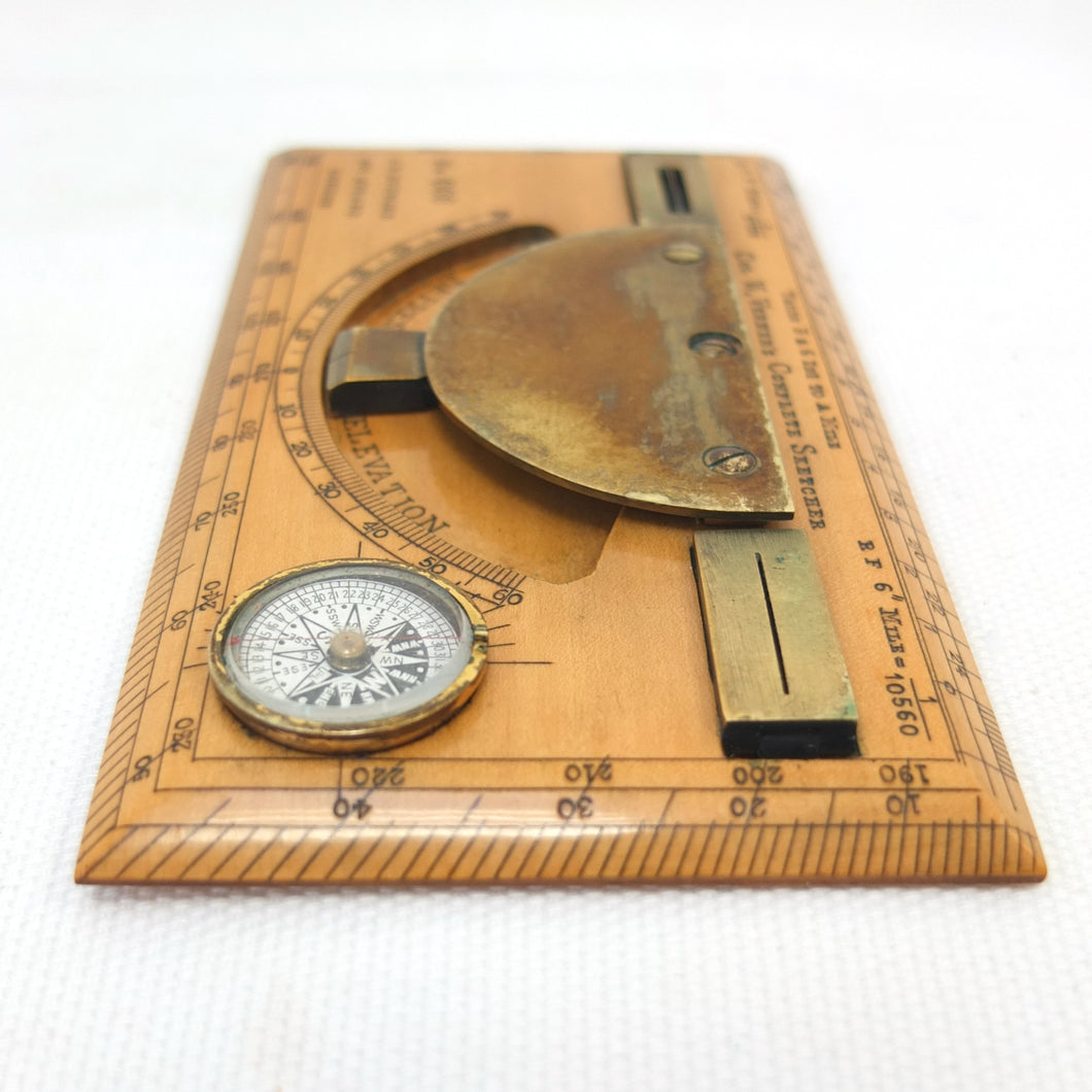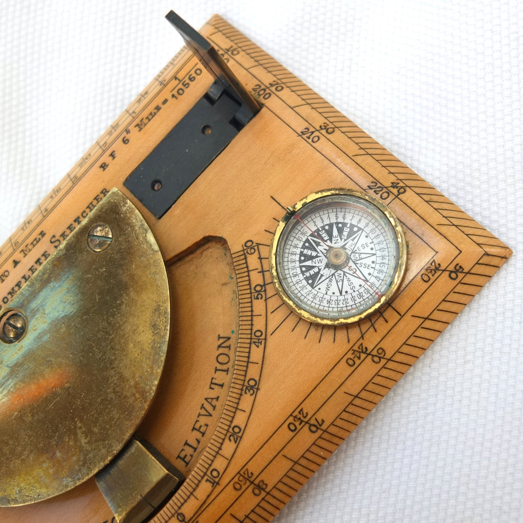 A very rare J. H. Steward Verner's Complete Sketching Instrument, dating from c.1896. The 'Verner's Complete Sketcher' appeared in Steward military instrument catalogues from c.1893 to 1916, and was intended for 'Prospecting and Military Use'. Made of boxwood, with brass sights, clinometer, and inset compass, it comes complete with its original fitted leather case. The 1899 Steward catalogue included the following testimonial from Major J. Burton Foster of the Royal Irish Regiment: 'I have very carefully examined and tried the compact little "Complete Sketching Instrument" designed by Captain W. Verner. With it anyone acquainted with Military Surveying can execute a reliable map in a rapid and very satisfactory mannner, independent of any extras save sketching case, pencil and India rubber. When proceeding on active service again, I shall take care one of these instruments forms part of my field kit'.