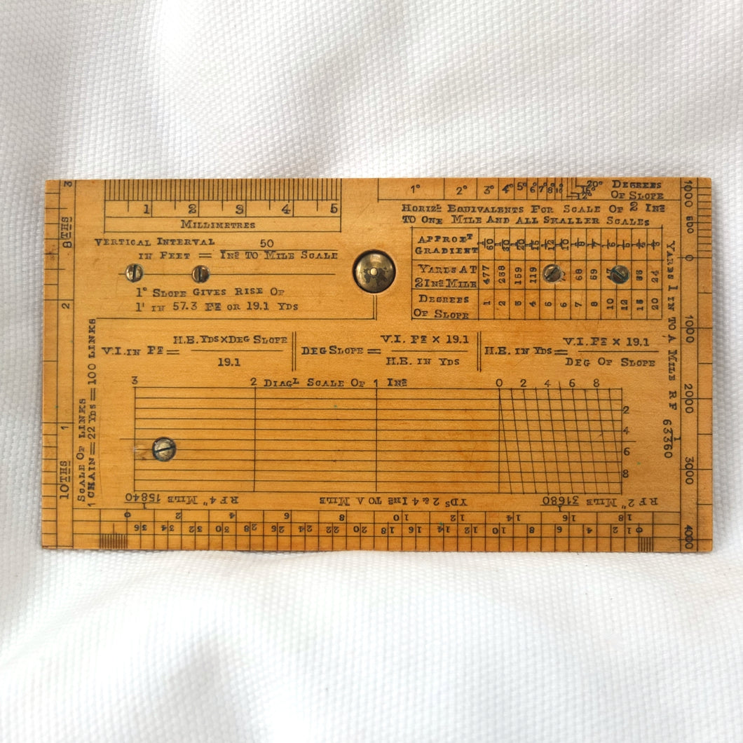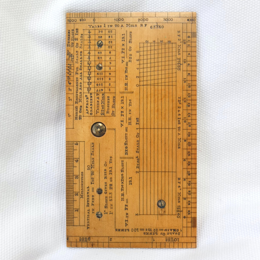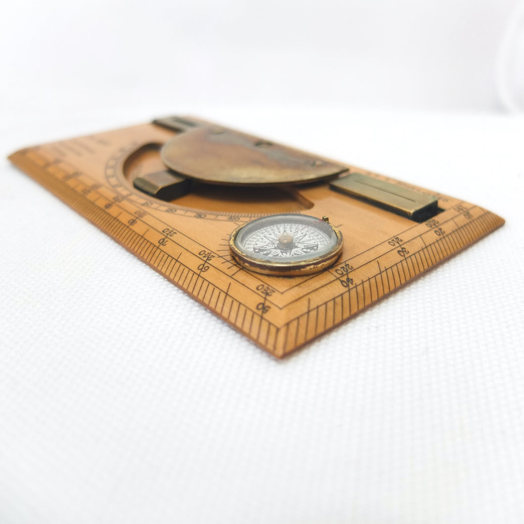 Apart from the Mark I type non-extending sights, this sketcher is essentially identical to the 'Improved' or 'Rapid' Mark II instruments. In the catalogues it was described as having 'all the merits of the Mark I pattern with several improvements, which considerably increase its accuracy. At the same time very little has been added to the size of the instrument, the dimensions being 6 x 3 inches and 1/4 inch thick, so that it can be conveniently carried in the breast pocket. The slightly larger protractor admits the use of a larger compass, giving more open divisions. The floating card dial is divided in a similar fashion to the dial in Mark I, and has a jewelled centre and also a locking stop.' The instrument also featured a clinometer, with 'a countersunk swinging plumb bob, controlled by an improved stop, which is released on pressing a button, and fixed on withdrawing the pressure'.