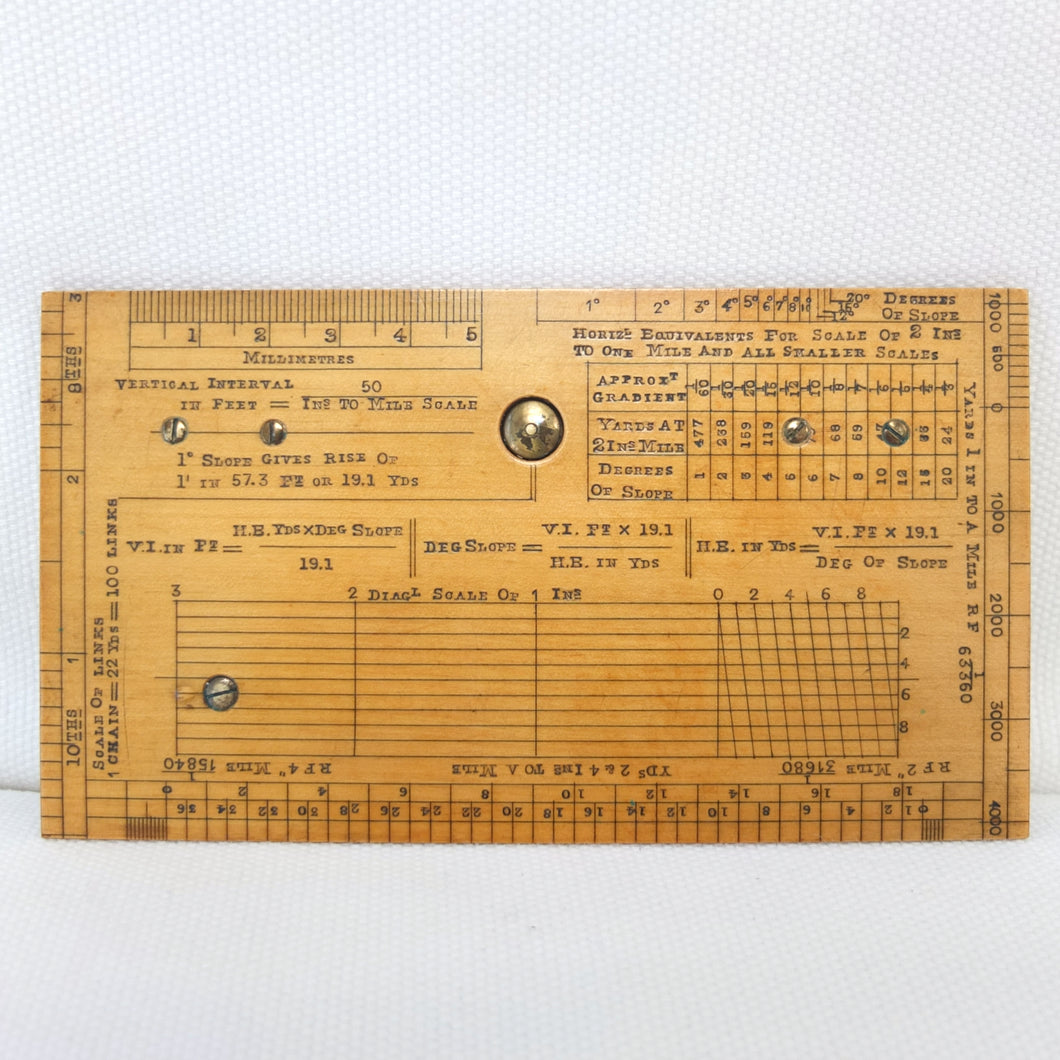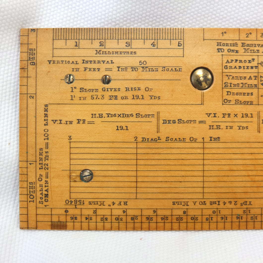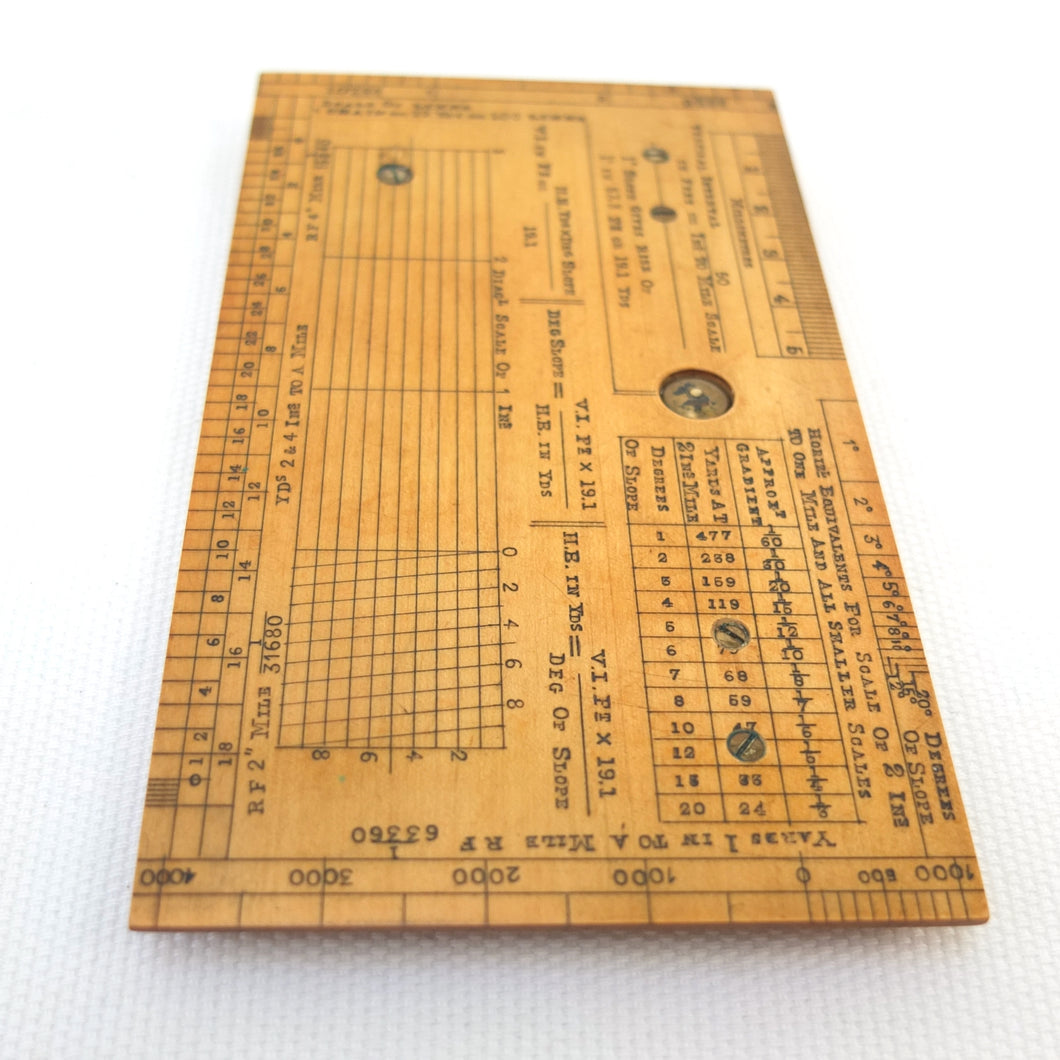 Apart from the Mark I type non-extending sights, this sketcher is essentially identical to the 'Improved' or 'Rapid' Mark II instruments. In the catalogues it was described as having 'all the merits of the Mark I pattern with several improvements, which considerably increase its accuracy. At the same time very little has been added to the size of the instrument, the dimensions being 6 x 3 inches and 1/4 inch thick, so that it can be conveniently carried in the breast pocket. The slightly larger protractor admits the use of a larger compass, giving more open divisions. The floating card dial is divided in a similar fashion to the dial in Mark I, and has a jewelled centre and also a locking stop.' The instrument also featured a clinometer, with 'a countersunk swinging plumb bob, controlled by an improved stop, which is released on pressing a button, and fixed on withdrawing the pressure'.
