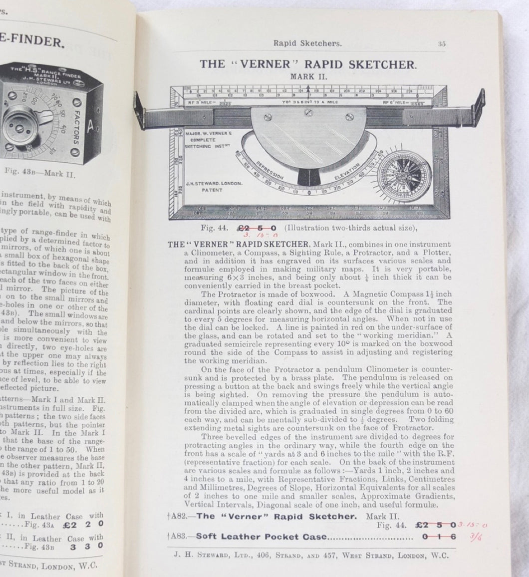 Several versions of this instrument were produced by J. H. Steward under various names over the years, including 'The Complete Sketcher', 'Improved Complete Sketcher' (1896), 'The Verner Complete Sketching Instrument' (1901), 'Verner Rapid Sketcher' (1910), and the 'Verner Rapid Sketcher Mark II' (1916). This example combines elements of both the Mk I and Mk II Sketcher: the fixed sights of the MK I, and the compass positioned on the right hand side as seen in the Mk II - suggesting that the instrument was being continually developed and revised.
