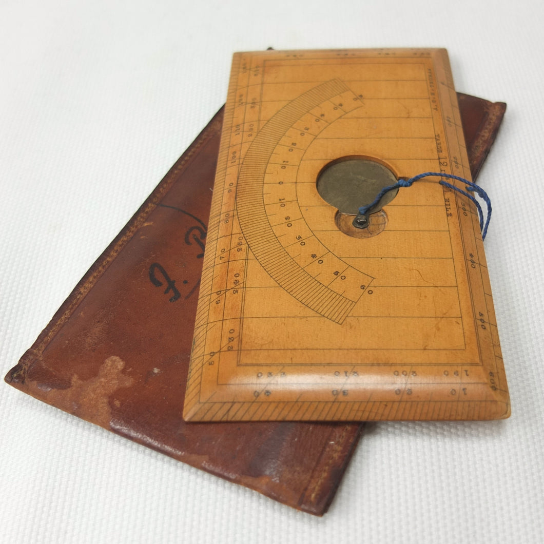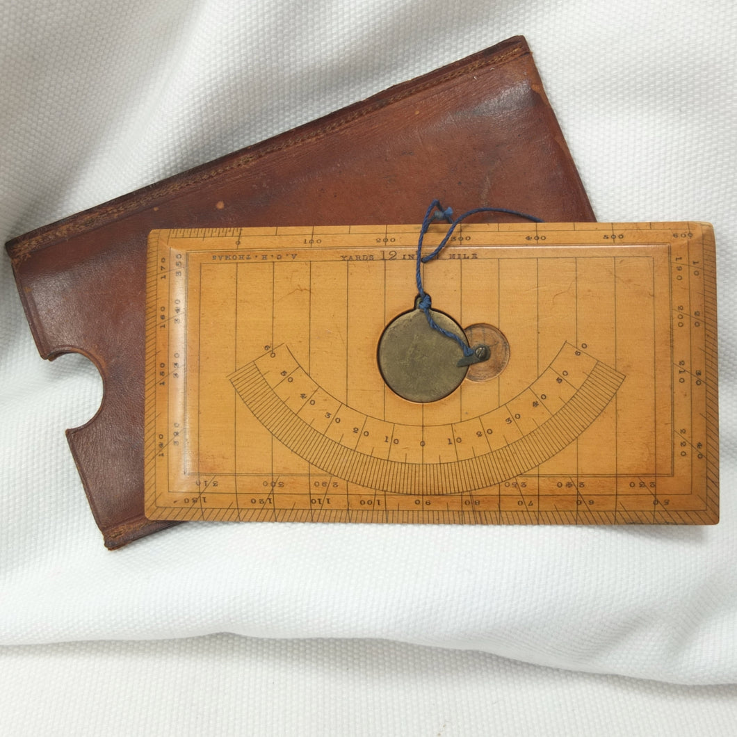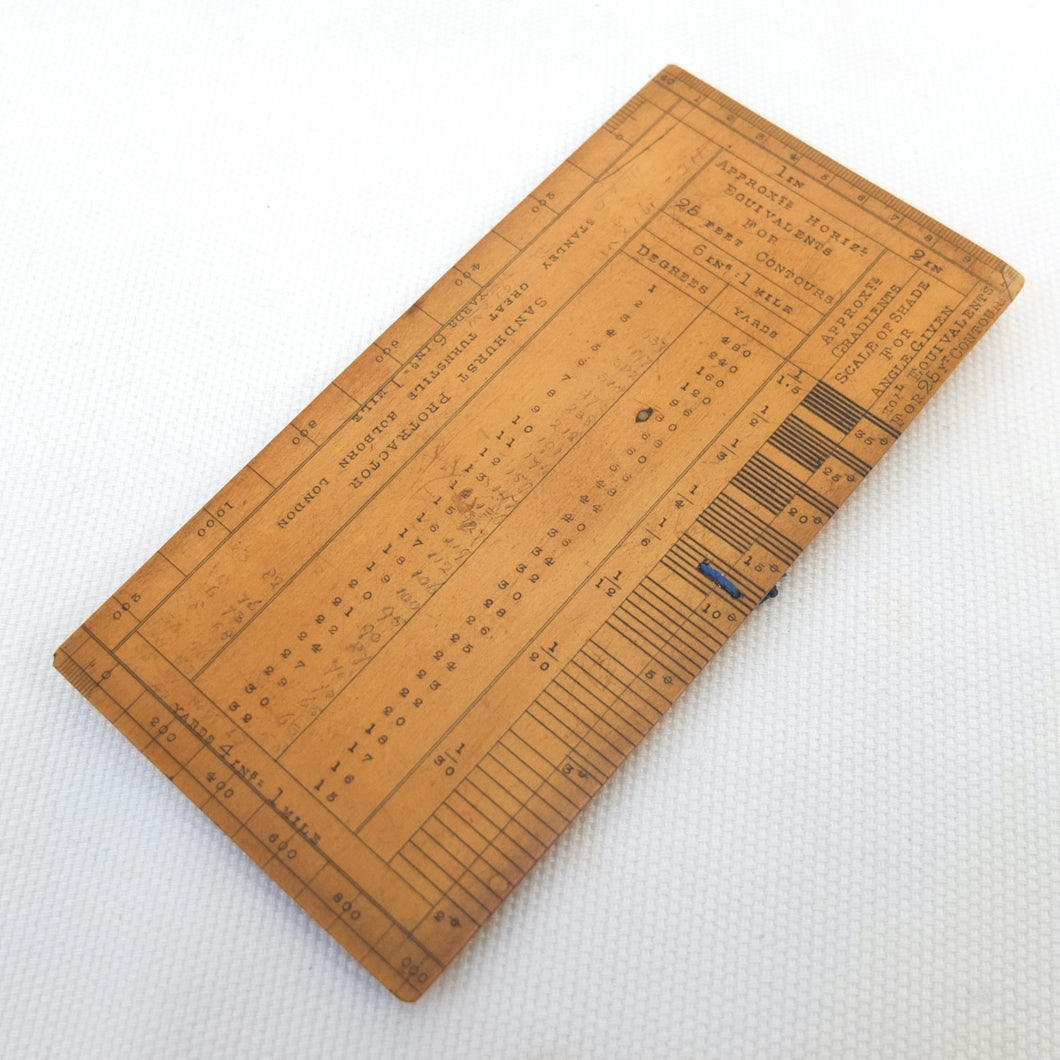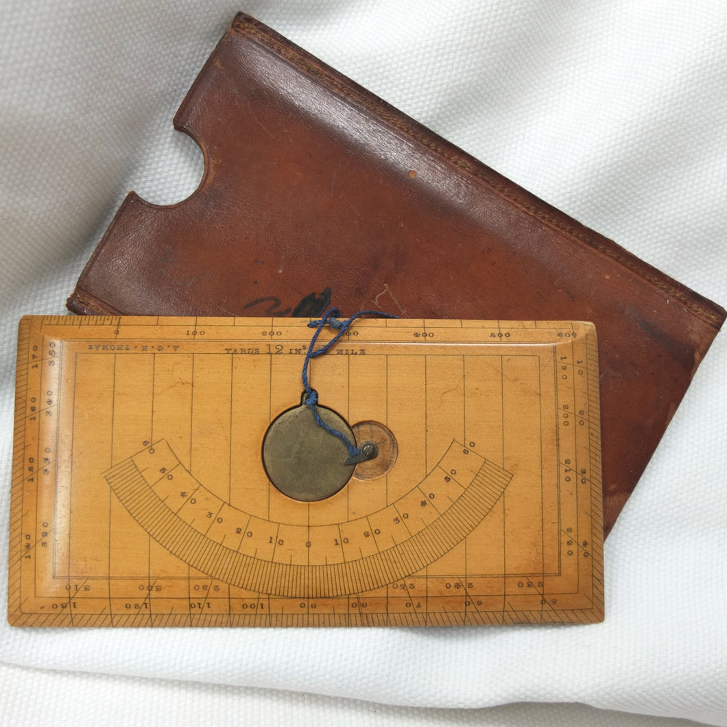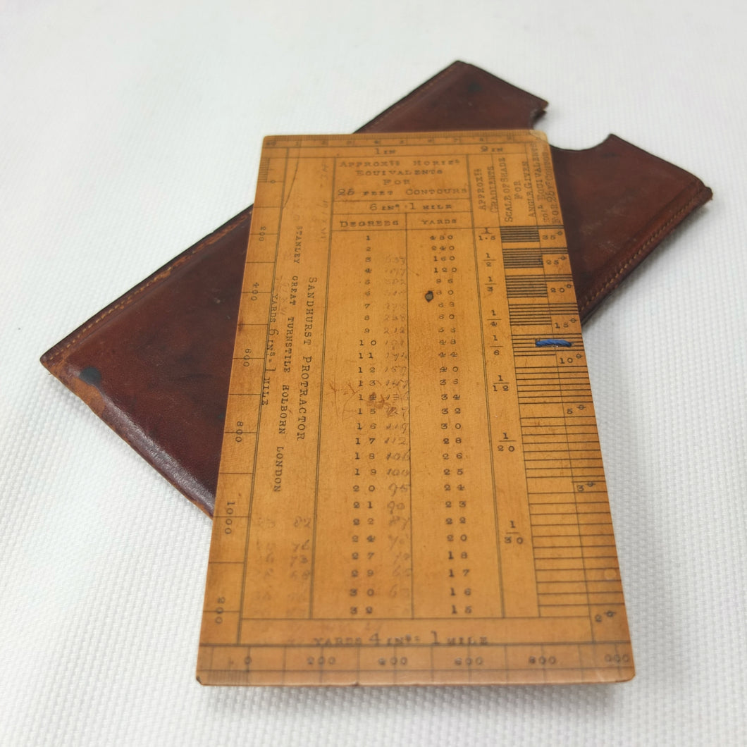 The Sandhurst Protractor was intended for use by military cartographers and surveyors measuring slopes in the field. The protractor is made of boxwood and incorporates a brass plumb bob, set in a recess with a small catch holding it in place, attached to a length of cord. There are several different scales on the protractor - the main one on the front, plus horizontal equivalents for 25 ft contours, approximate gradients, scale of shade for given angle, etc. It comes complete with its original leather case.