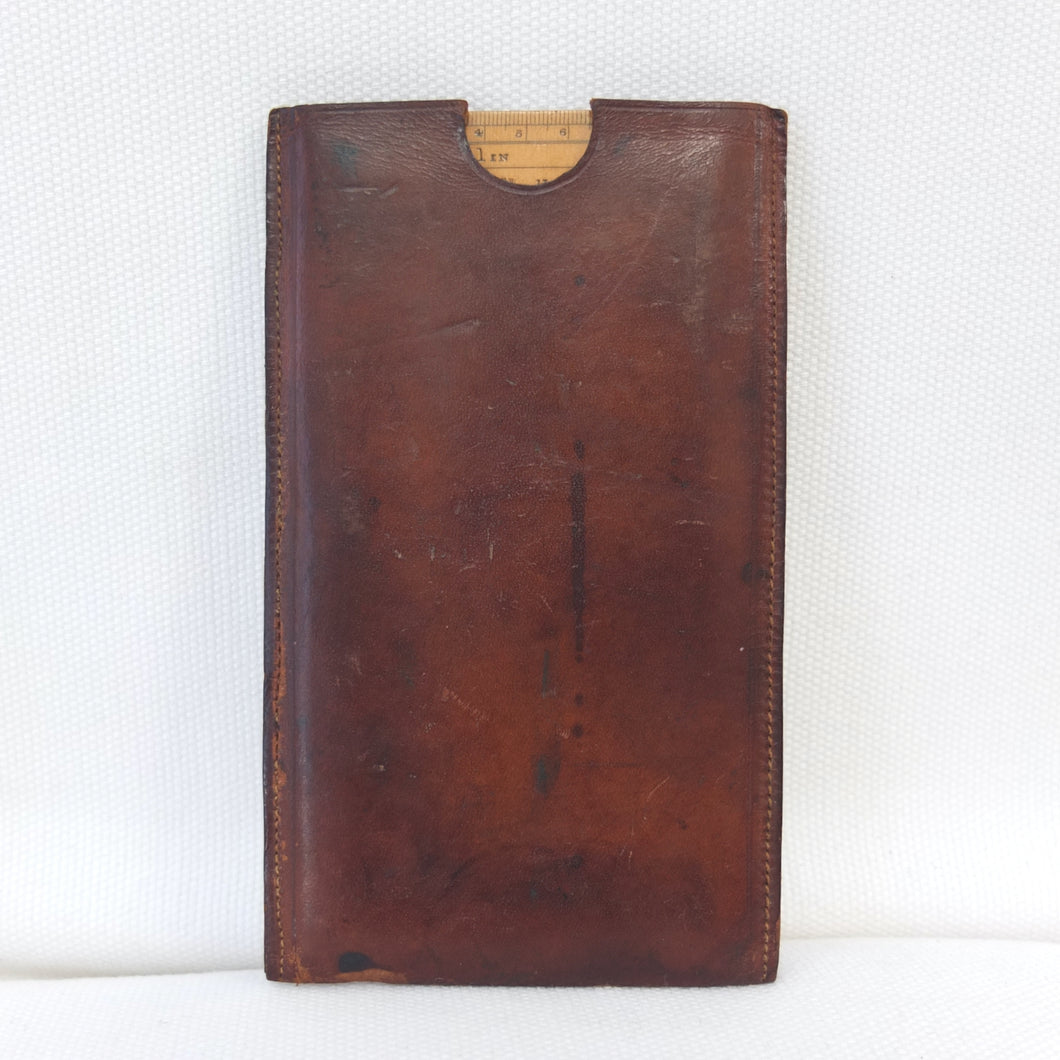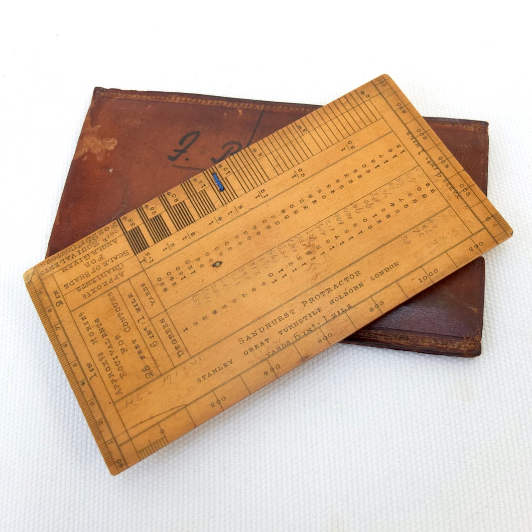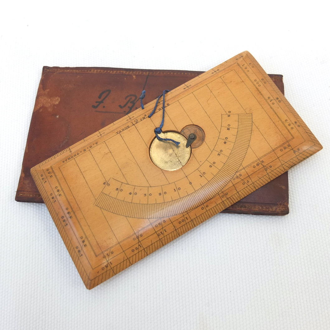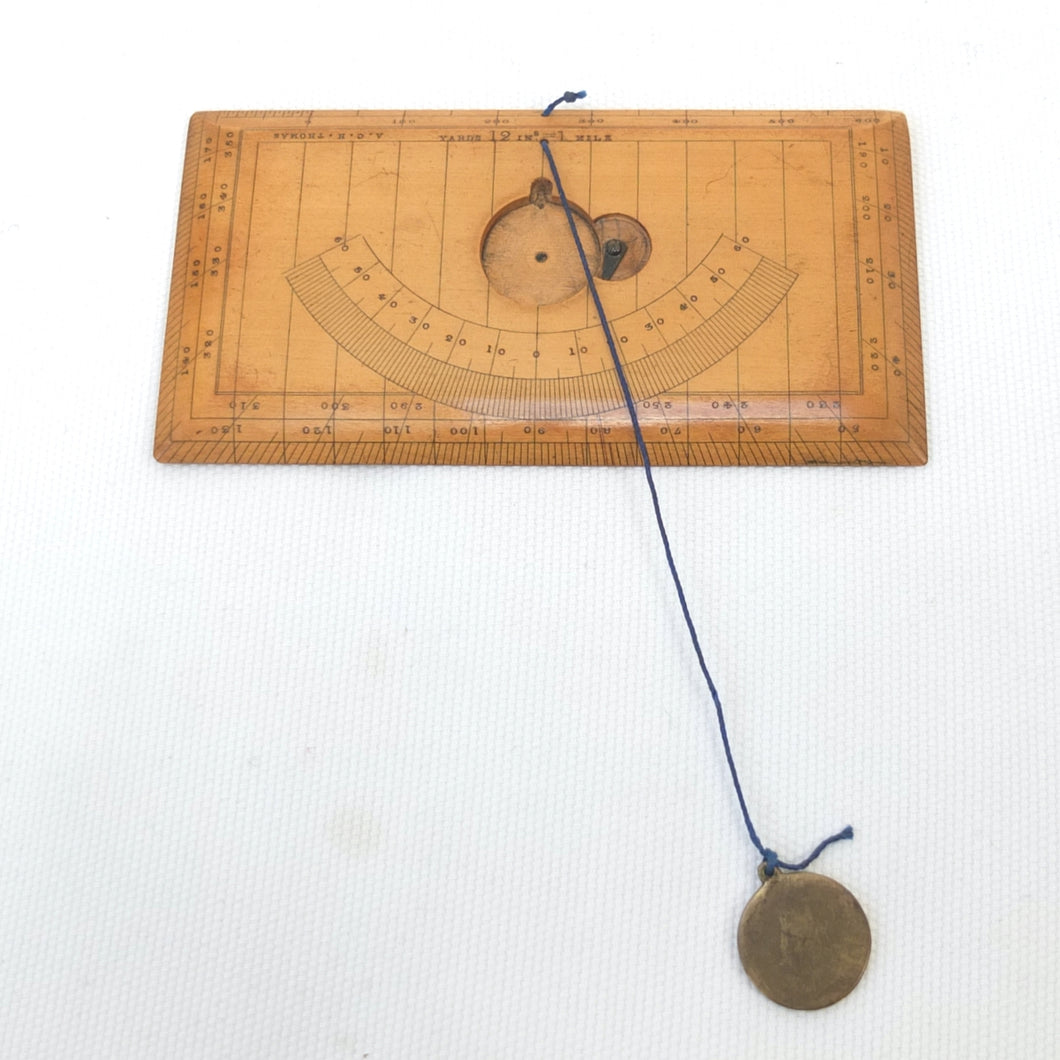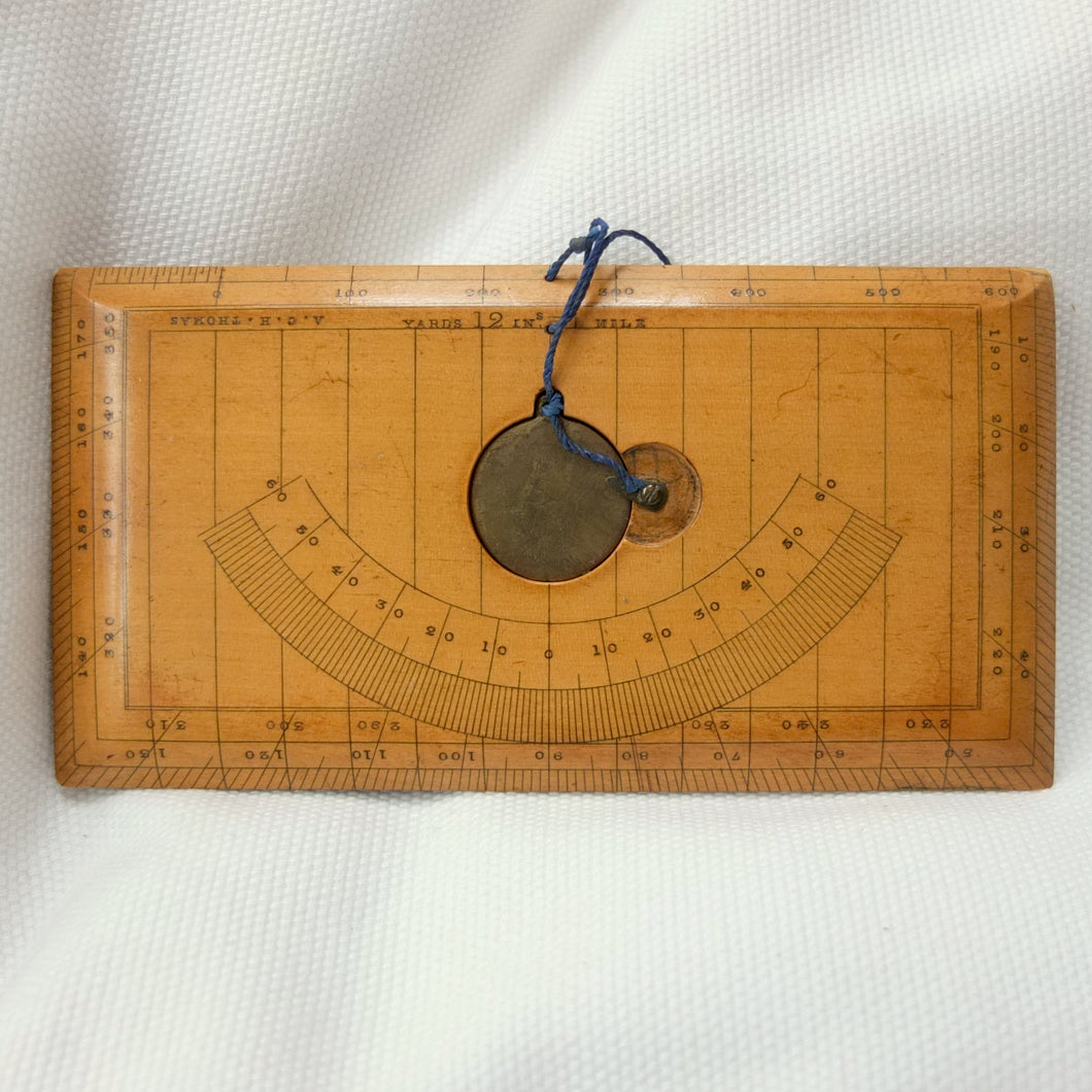 The Sandhurst Protractor was intended for use by military cartographers and surveyors measuring slopes in the field. The protractor is made of boxwood and incorporates a brass plumb bob, set in a recess with a small catch holding it in place, attached to a length of cord. There are several different scales on the protractor - the main one on the front, plus horizontal equivalents for 25 ft contours, approximate gradients, scale of shade for given angle, etc. It comes complete with its original leather case.