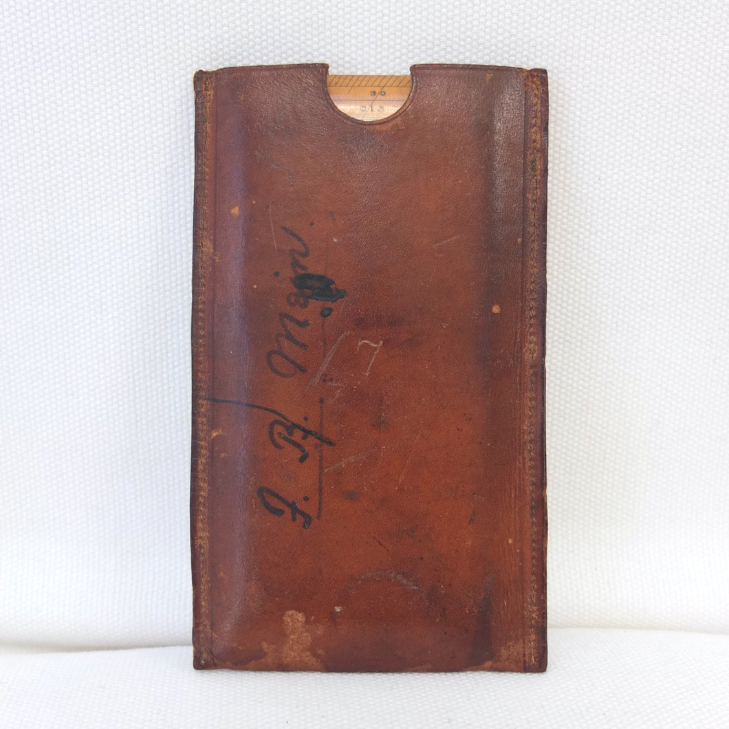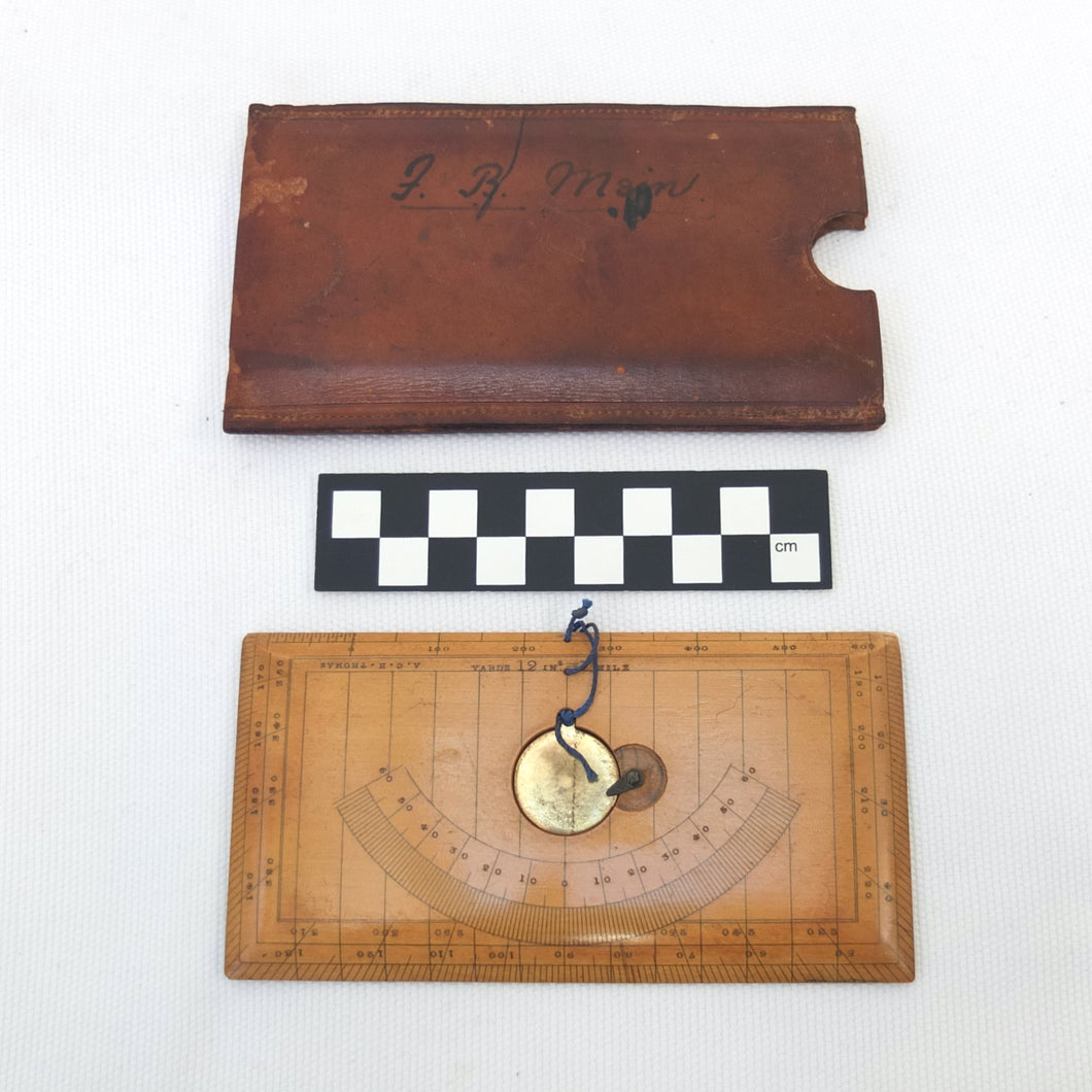 In very good condition and full working order, with minor signs of use, and some faint annotation to the scales on the rear. The leather case is in very good condition, with general signs of wear, and the inscription 'F. B. Main' [or possibly 'Major'] written in ink on the front. The name 'A. C. H. Thomas' is engraved near the top left hand edge of the protractor.