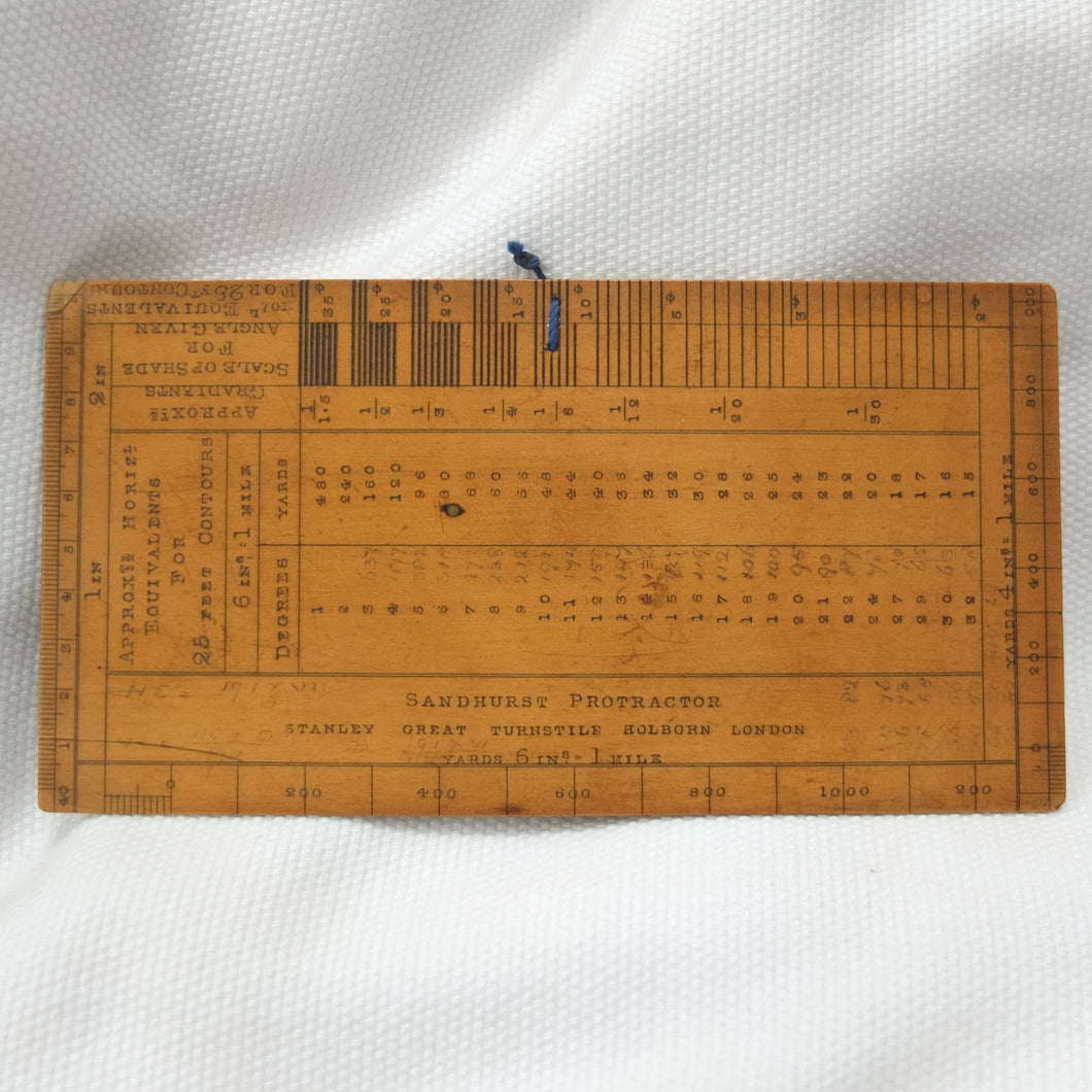 In his book Surveying and Levelling Instruments (1895) W. F. Stanley described the Sandhurst Protractor as: 'a military protractor adapted especially for topographical delineation. It is made of boxwood, upon which the protractor is cut, and has also one scale at the lower edge of six inches to a mile in yards, the tens of which are carried across to make parallels of 90 degrees, in the manner of an ordinary military protratctor. Over the back of the protractor is a scale which gives a standard for shading slopes of land upon topographical maps fron 2 to 35 degrees, also lines for contour shades. A small plummet is supplied with the instrument, the cord of which is passed through a hole in the centre from which the degrees are protracted. when the protractor is held up, degrees downwards, the cord of the plummet will pass over the degrees and indicate the angle at which it is held; by looking over the edge in this manner the angle of inclination of the land may be taken as with a clinometer'.