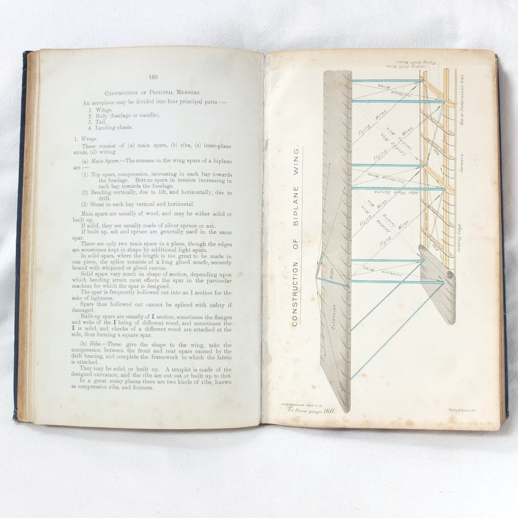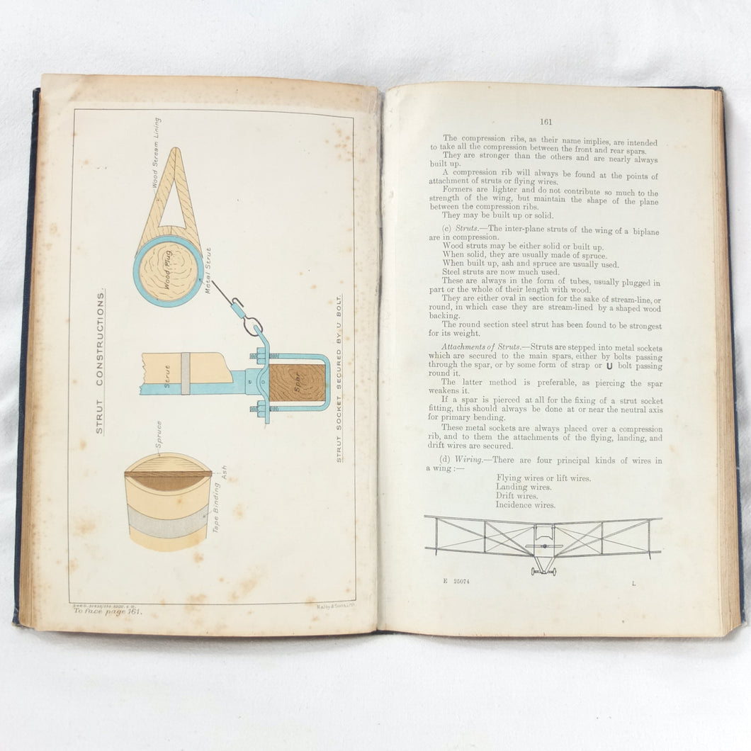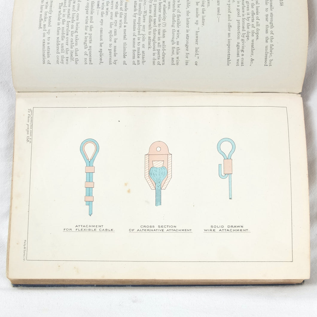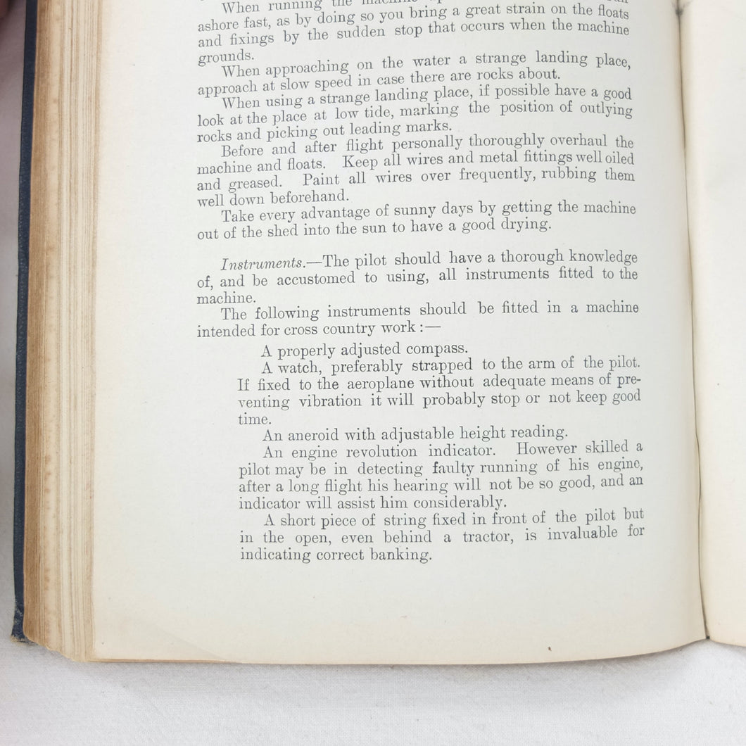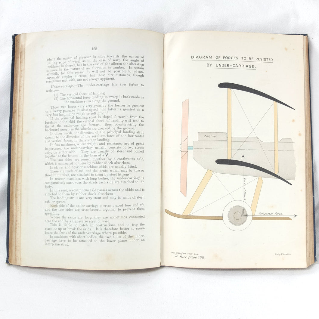 Subjects covered include: airship rigging and machinery, fire precautions, preparing for flight, landing, selecting a temporary base, breakdown procedure, history of airships, construction of aeroplanes, seaplanes, aero engines, aircraft maintenance, practical flying, handling a seaplane, aerial navigation, and aerial photography. The book is illustrated with photographs of aircraft and airships, diagrams and line drawings. There are four coloured plates showing details of wings, cable attachments, undercarriages, and strut construction. There is also a loosely inserted single sheet extract from another publication with photographs and details of airships and members of the RFC.