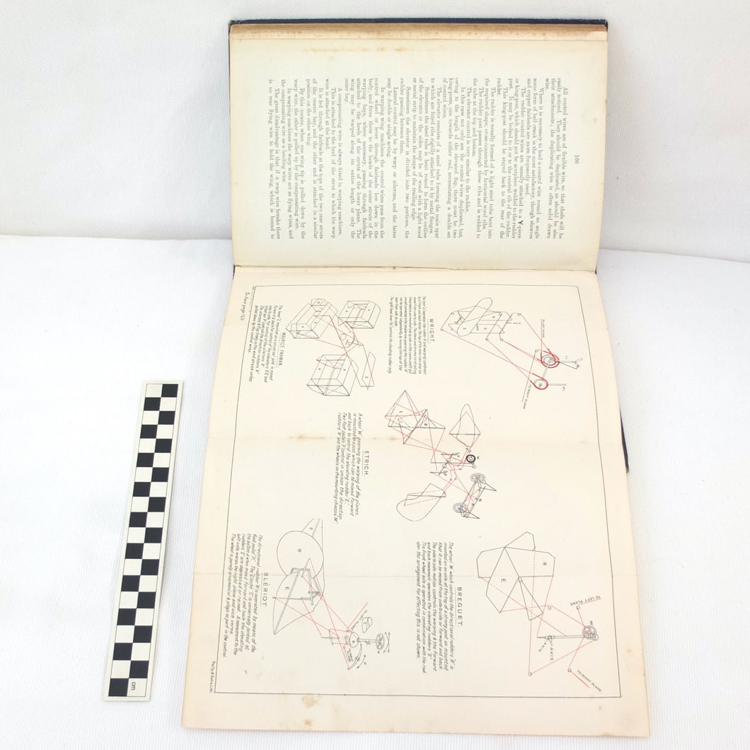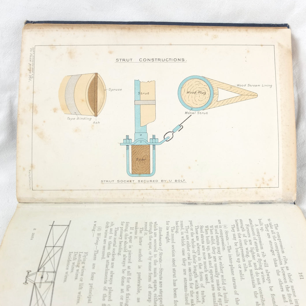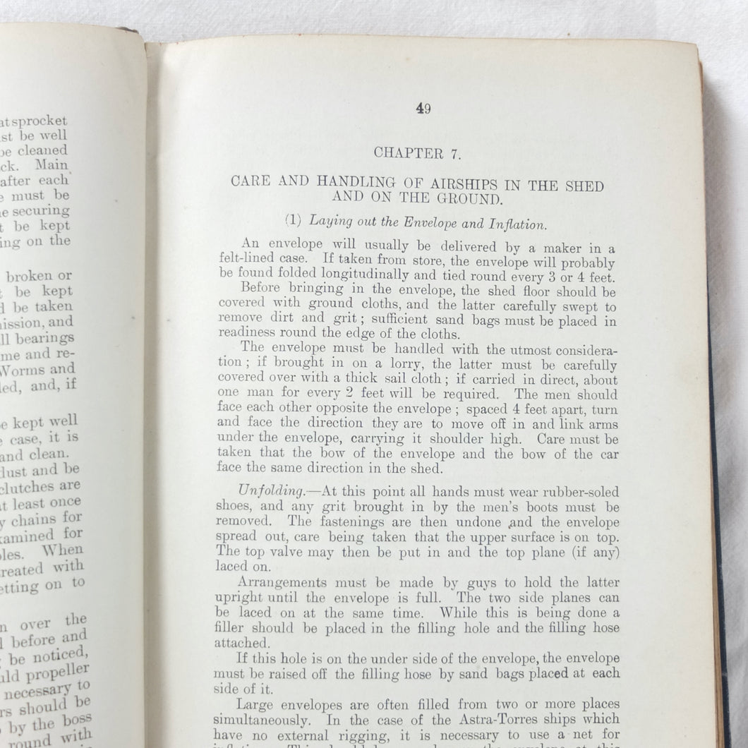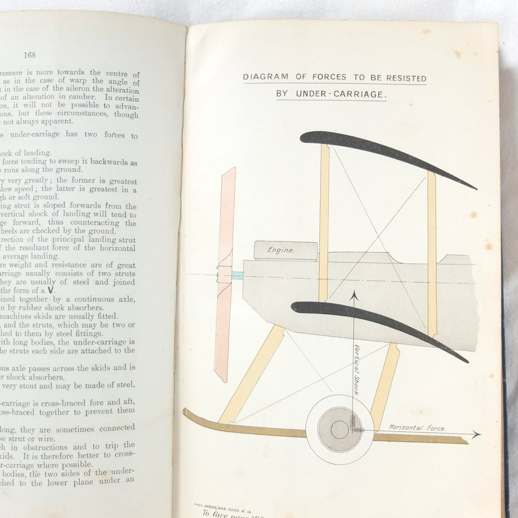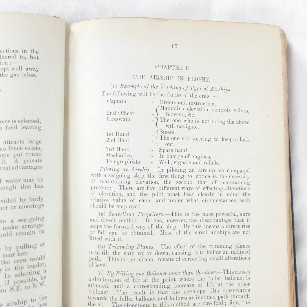 Subjects covered include: airship rigging and machinery, fire precautions, preparing for flight, landing, selecting a temporary base, breakdown procedure, history of airships, construction of aeroplanes, seaplanes, aero engines, aircraft maintenance, practical flying, handling a seaplane, aerial navigation, and aerial photography. The book is illustrated with photographs of aircraft and airships, diagrams and line drawings. There are four coloured plates showing details of wings, cable attachments, undercarriages, and strut construction. There is also a loosely inserted single sheet extract from another publication with photographs and details of airships and members of the RFC.