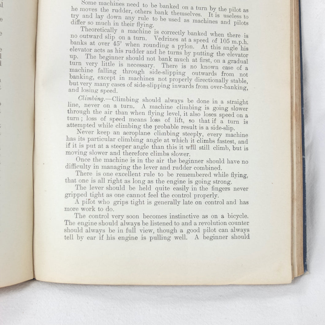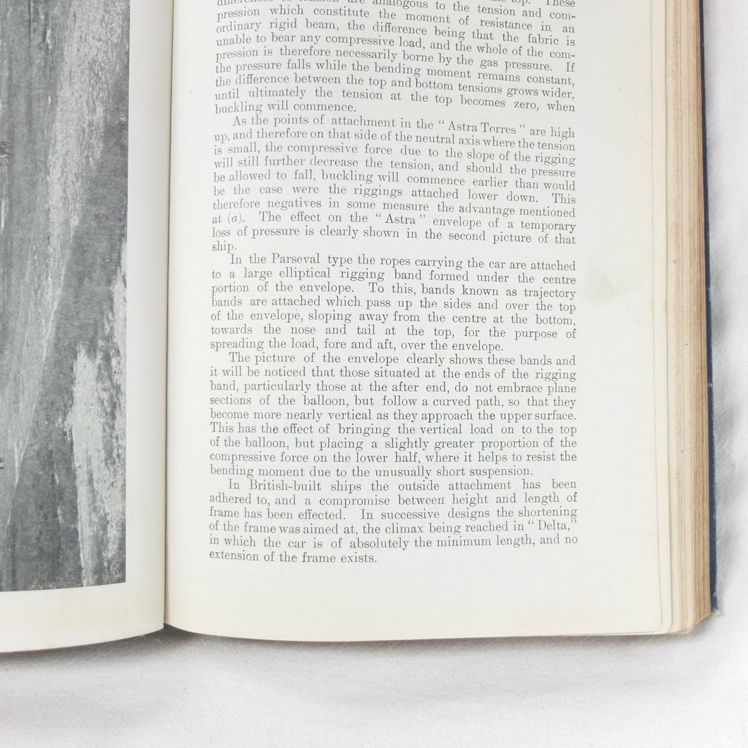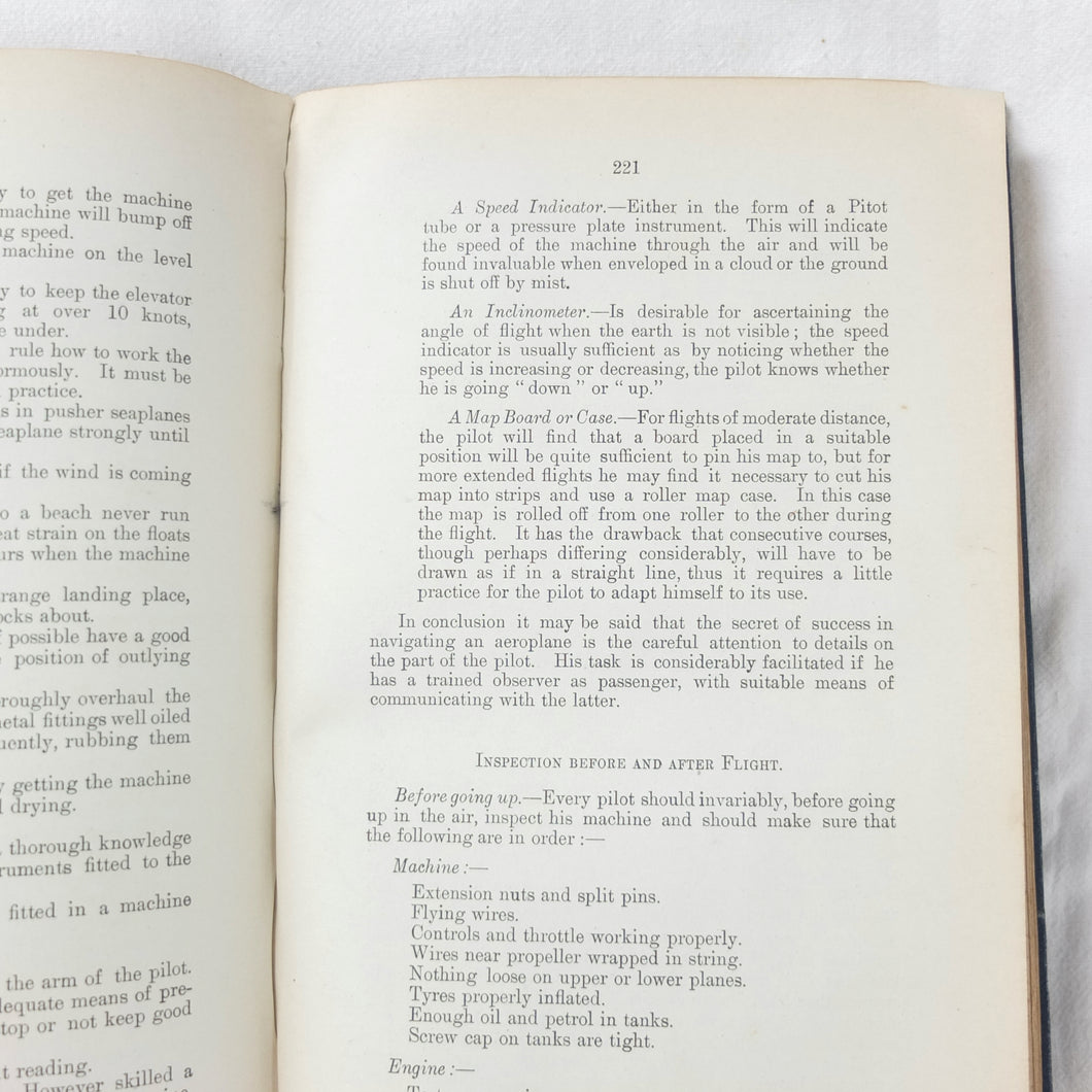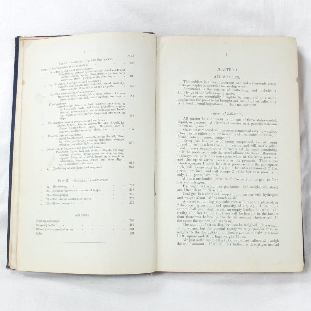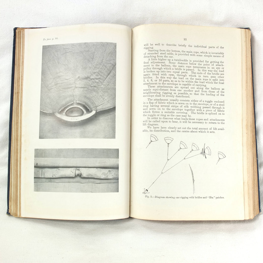 Subjects covered include: airship rigging and machinery, fire precautions, preparing for flight, landing, selecting a temporary base, breakdown procedure, history of airships, construction of aeroplanes, seaplanes, aero engines, aircraft maintenance, practical flying, handling a seaplane, aerial navigation, and aerial photography. The book is illustrated with photographs of aircraft and airships, diagrams and line drawings. There are four coloured plates showing details of wings, cable attachments, undercarriages, and strut construction. There is also a loosely inserted single sheet extract from another publication with photographs and details of airships and members of the RFC.