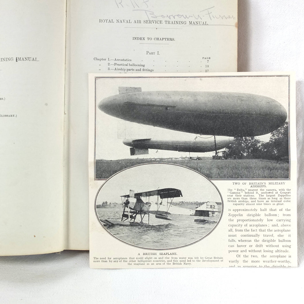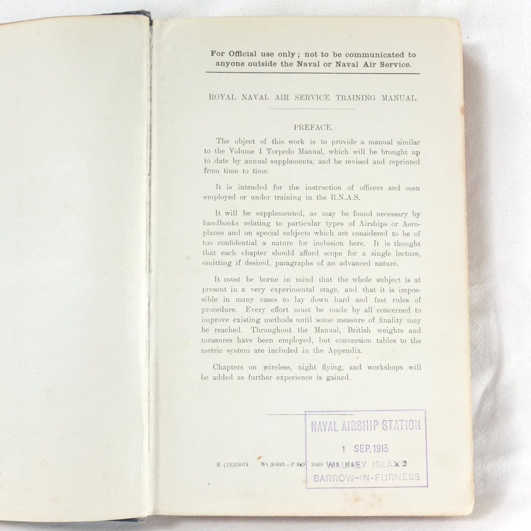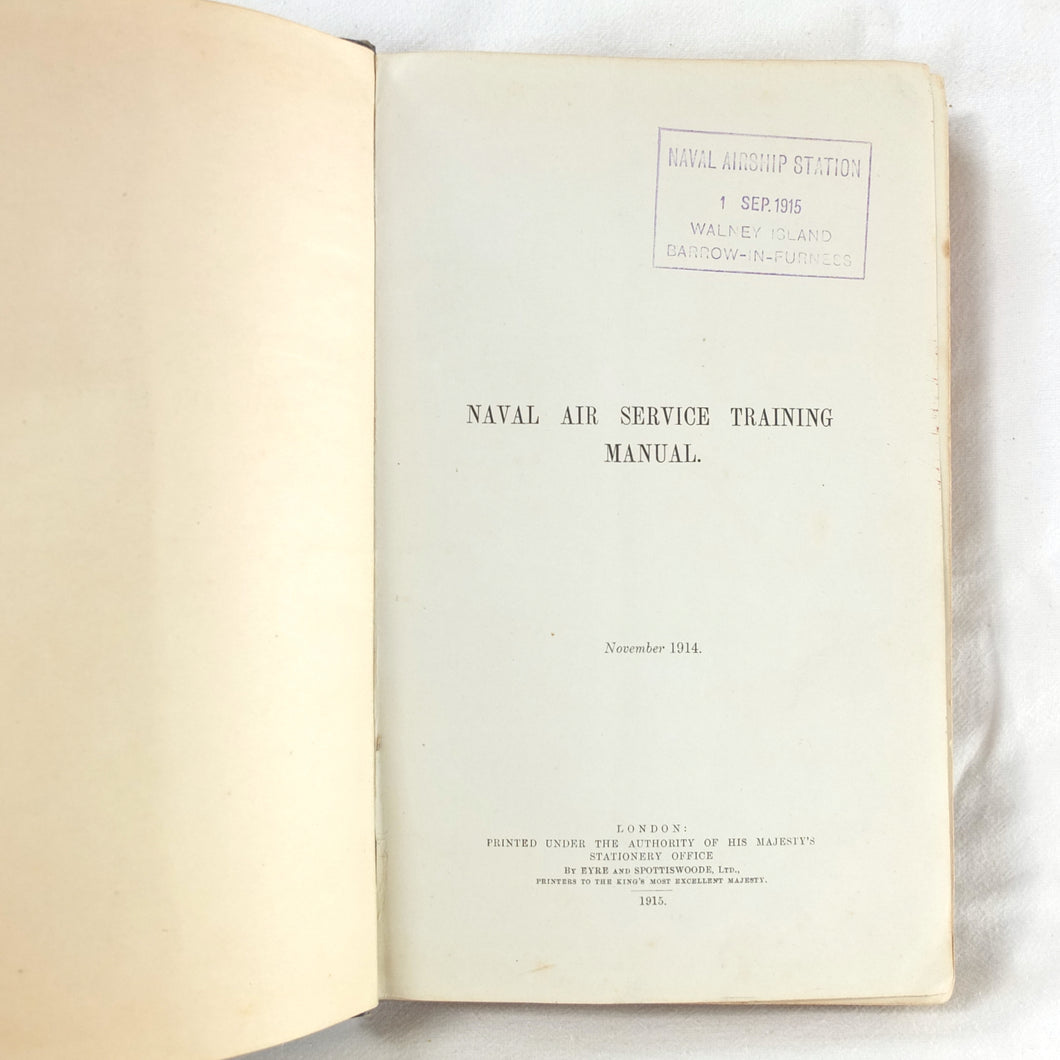 A very rare Royal Naval Air Service Training Manual published in June 1915. Produced by the Air Department of The Admiralty in November 1914, just after the outbreak of war, this is a detailed handbook of R.N.A.S training from the time when the Naval Air Service was in its infancy. It includes a great deal of very useful information on all aspects of R.N.A.S. aviation, with sections on airship flight and maintenance, conventional aeroplanes and seaplanes, flying training, and the other activities of the R.NA.S. at the start of the First World War.
