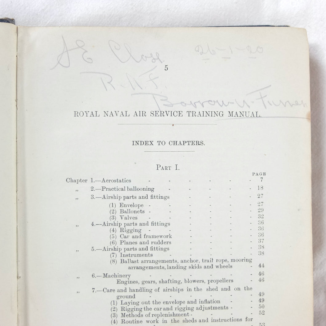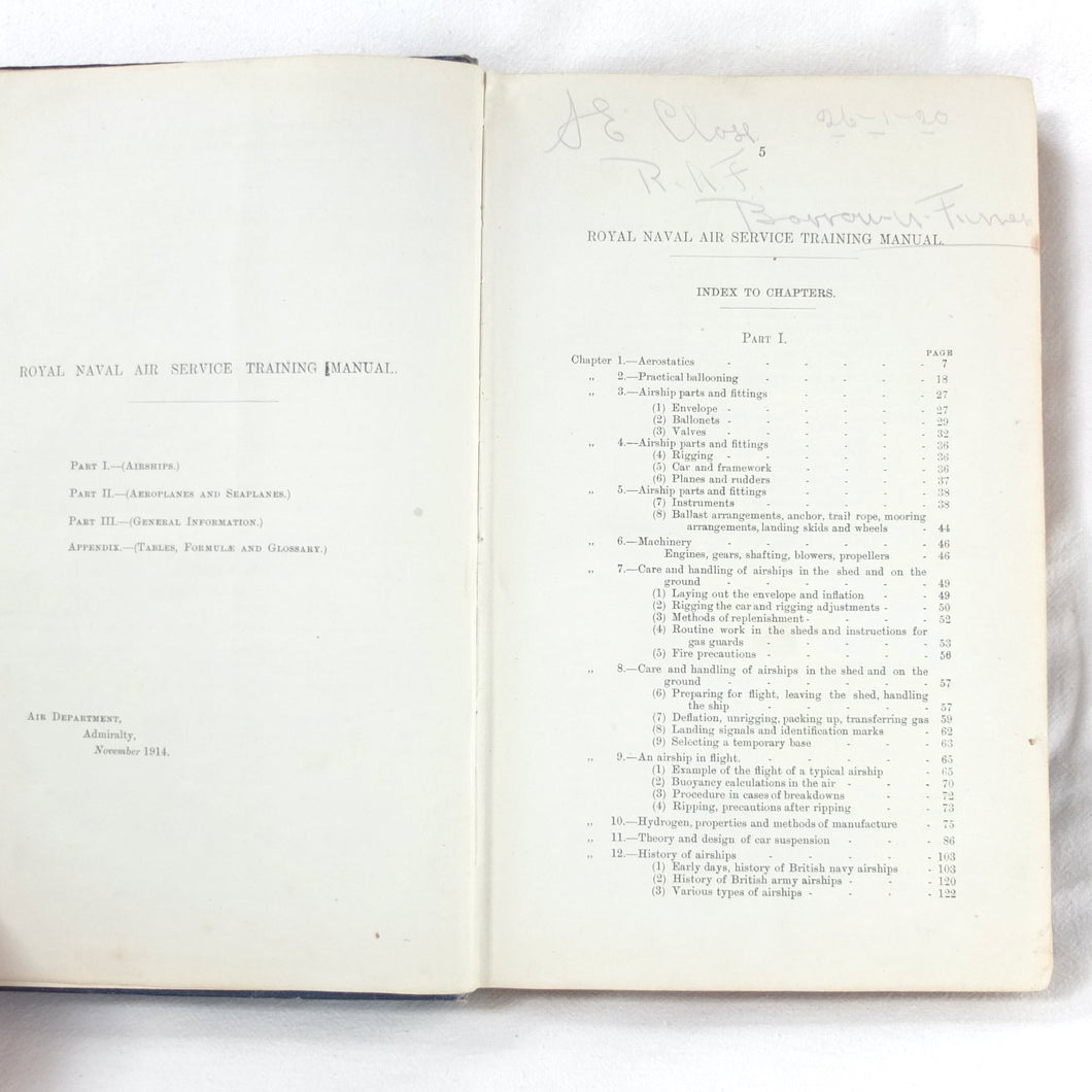 With ink stamps of 'Naval Airship Station, Walney Island, Barrow in Furness', dated '1st Sep. 1915' to the endpapers and title page. This is almost exactly the time Barnes Wallis returned to Barrow from the Artist's Rifles to resume his work on the HMA No. 9r airship. Barnes Wallis is best known for inventing the 'Bouncing Bomb' used by the RAF in Operation Chastise - the Dambusters raid - to attack the dams of the Ruhr Valley in May 1943). The manual is signed in pencil on the contents page by 'J. E. Close, RAF, Barrow in Furness, 26/1/20'.