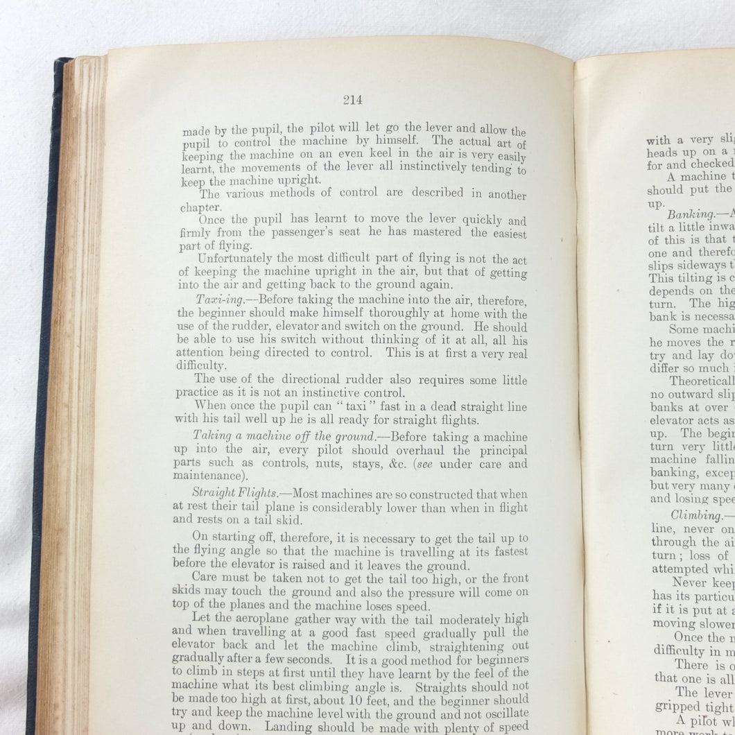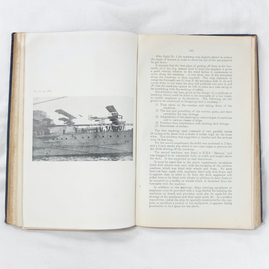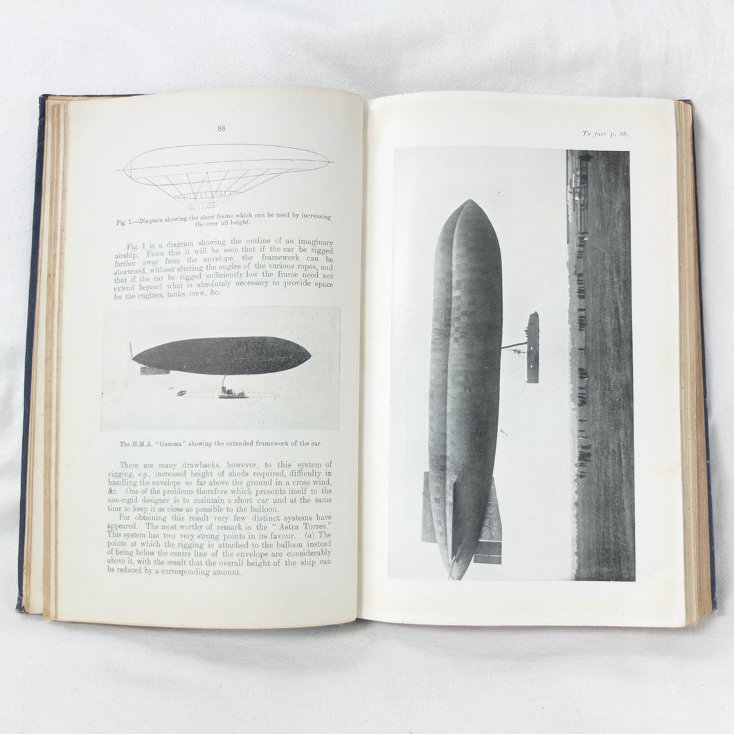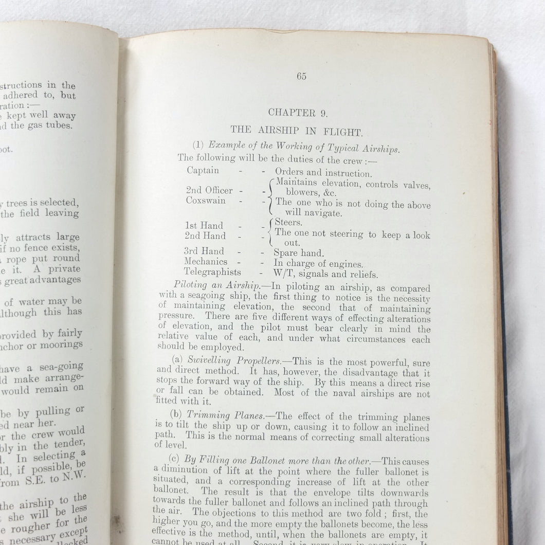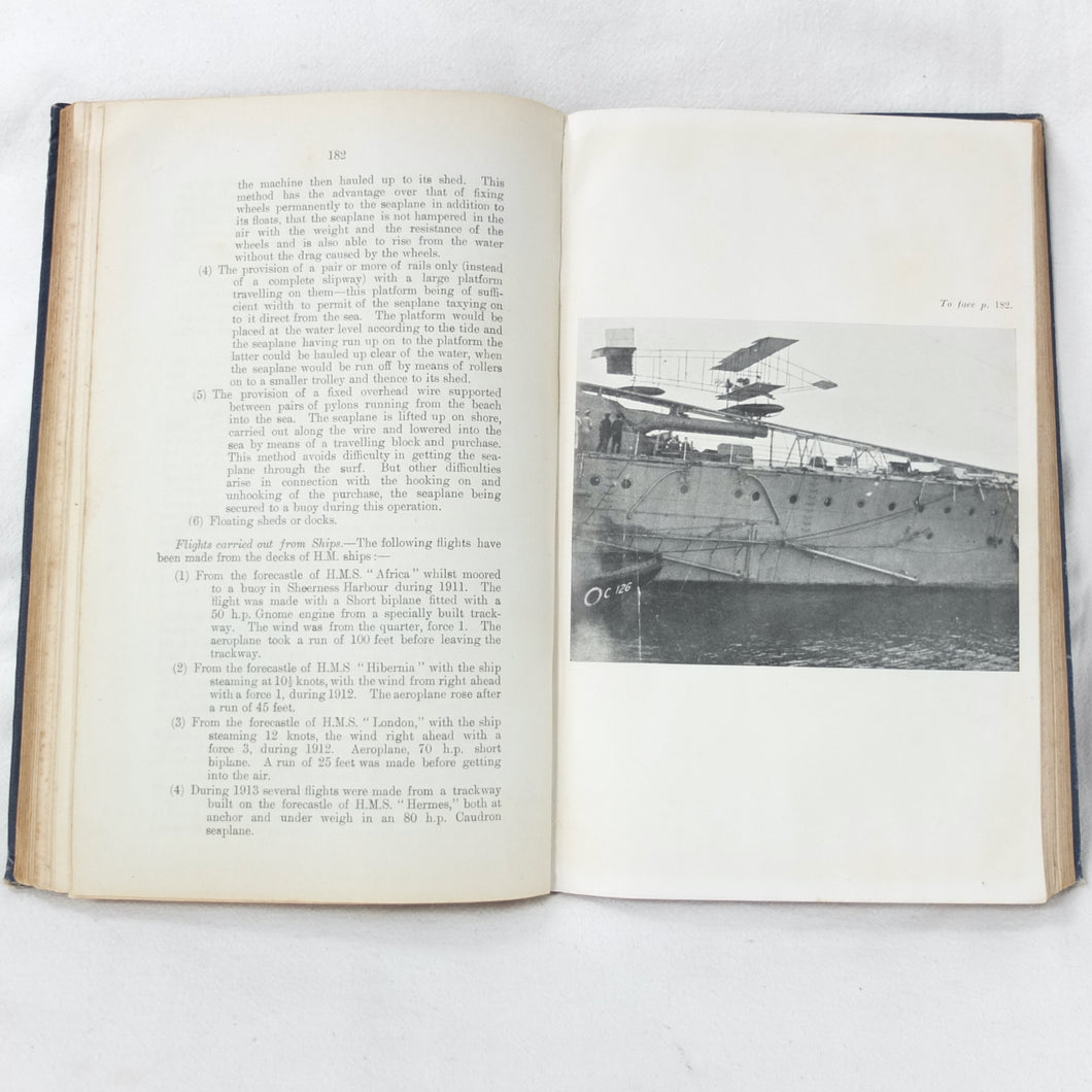 In good condition. The boards are in fair to good condition with general signs of wear and use, creases, bumping to the corners, and some marks. The binding and hinges are good and secure. The text is in very good condition, with some marks to the endpapers. The illustrations, plates, and fold-out diagrams are in good condition, with some marks to the colour plates. With ink stamps of 'Naval Airship Station, Walney Island, Barrow in Furness', dated '1st Sep. 1915' to the endpapers and title page. Signed in pencil on the contents page by 'J. E. Close, RAF, Barrow in Furness, 26/1/20'.