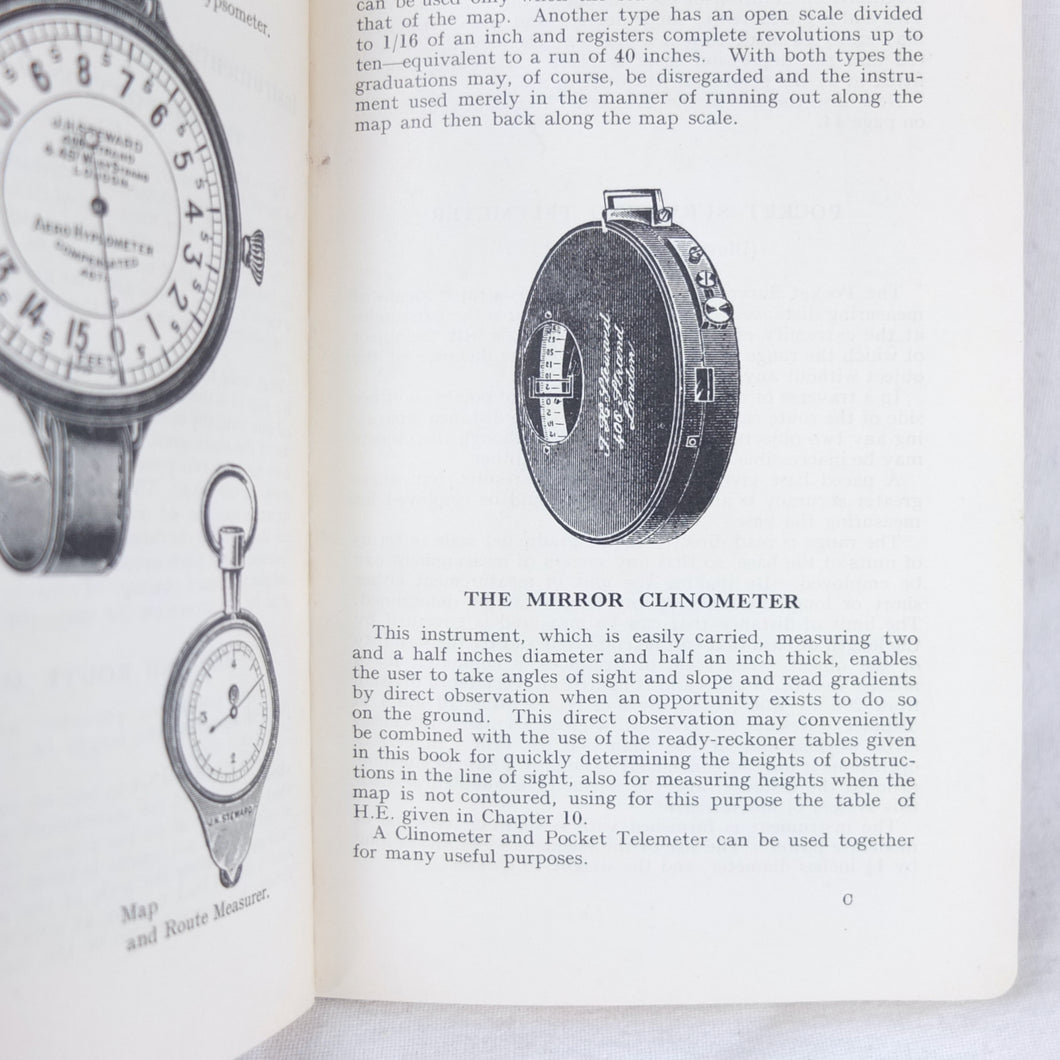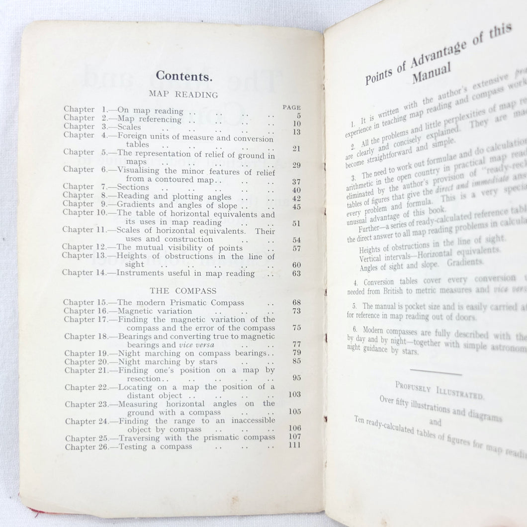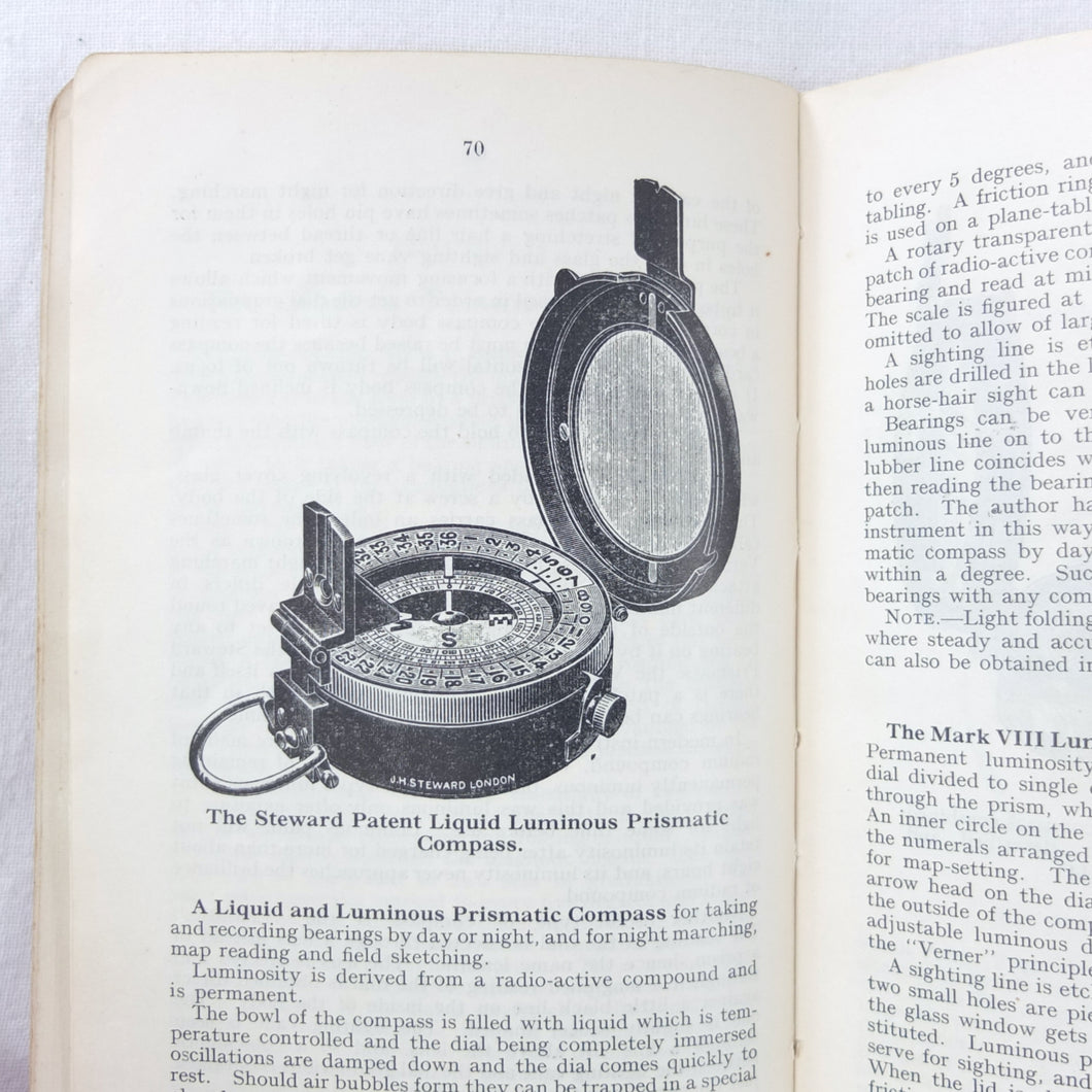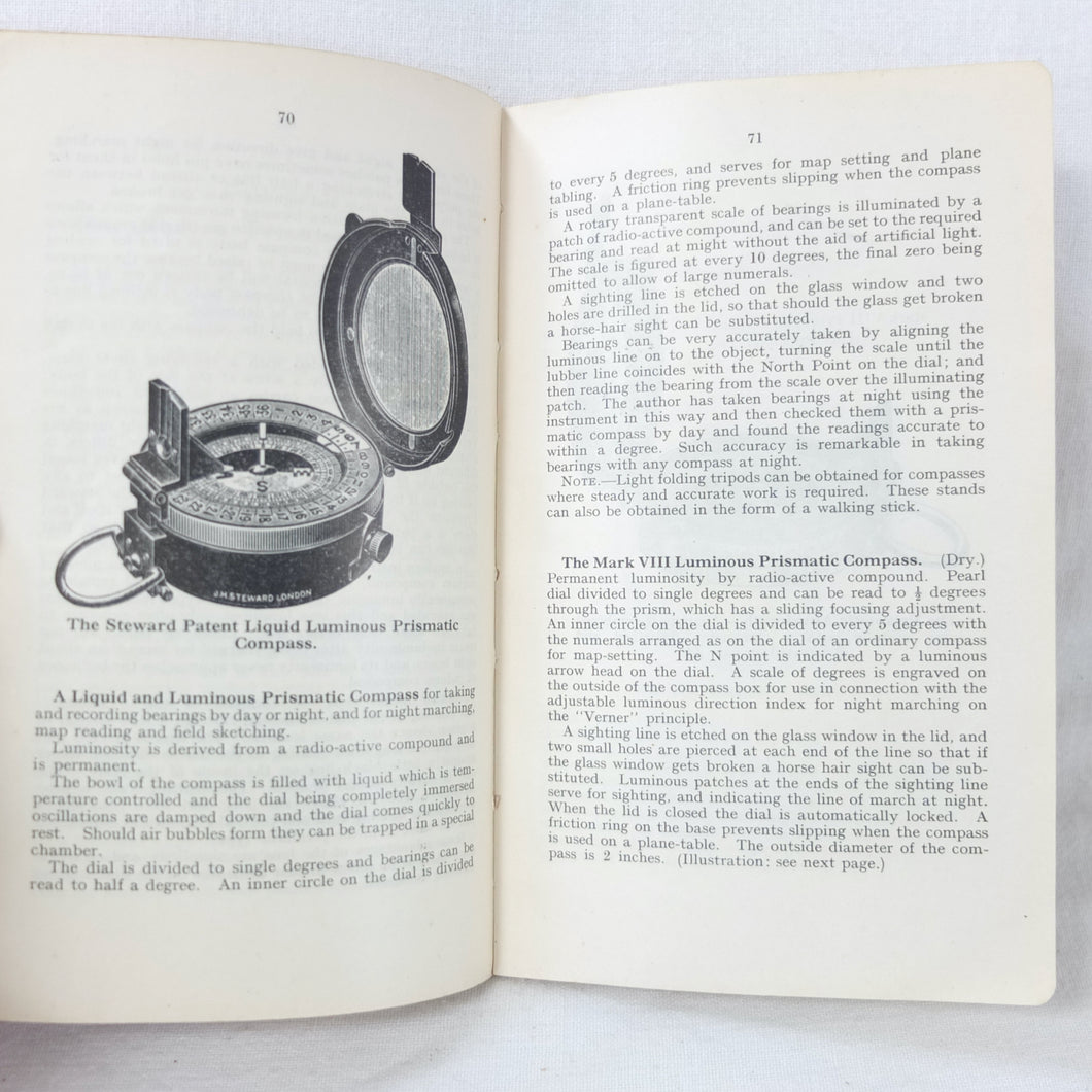 An original WW2 map and Compass manual by the celebrated Everest mountaineer Captain John Noel. Undated, but published c.1940 (there is an advert for one of Noel's other books on the rear endpaper with a quote dated October 1940). The book covers the British Army standard issue compasses and other navigation instruments in use from before WW1 to the 1930s. The Verners Compass, Steward patent Liquid Compass, Mirror Clinometer, and Steward Aero Hypsometer (a wrist altimeter used by the RFC and RAF) are among the instruments described. Their use is discussed and they are illustrated in the book. Compass use and map reading are covered in detail. Fully illustrated with more than 50 drawings and diagrams.