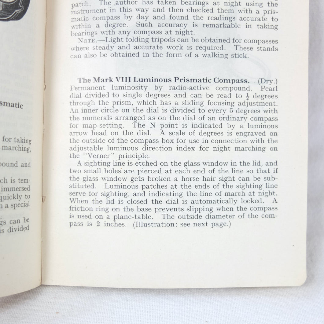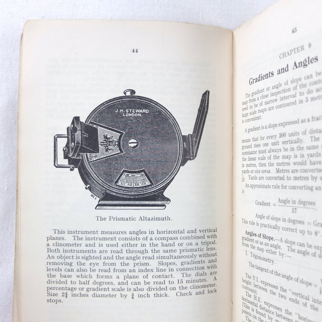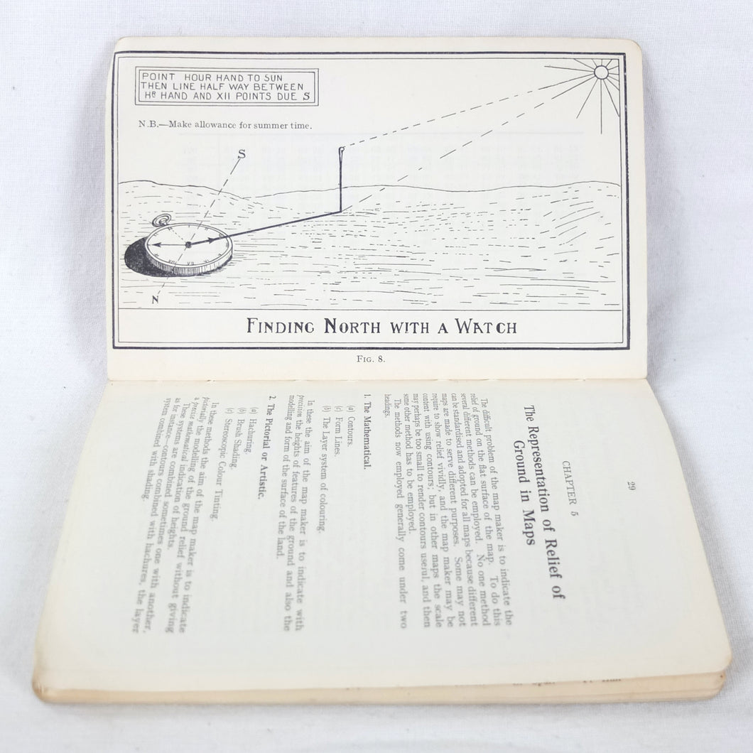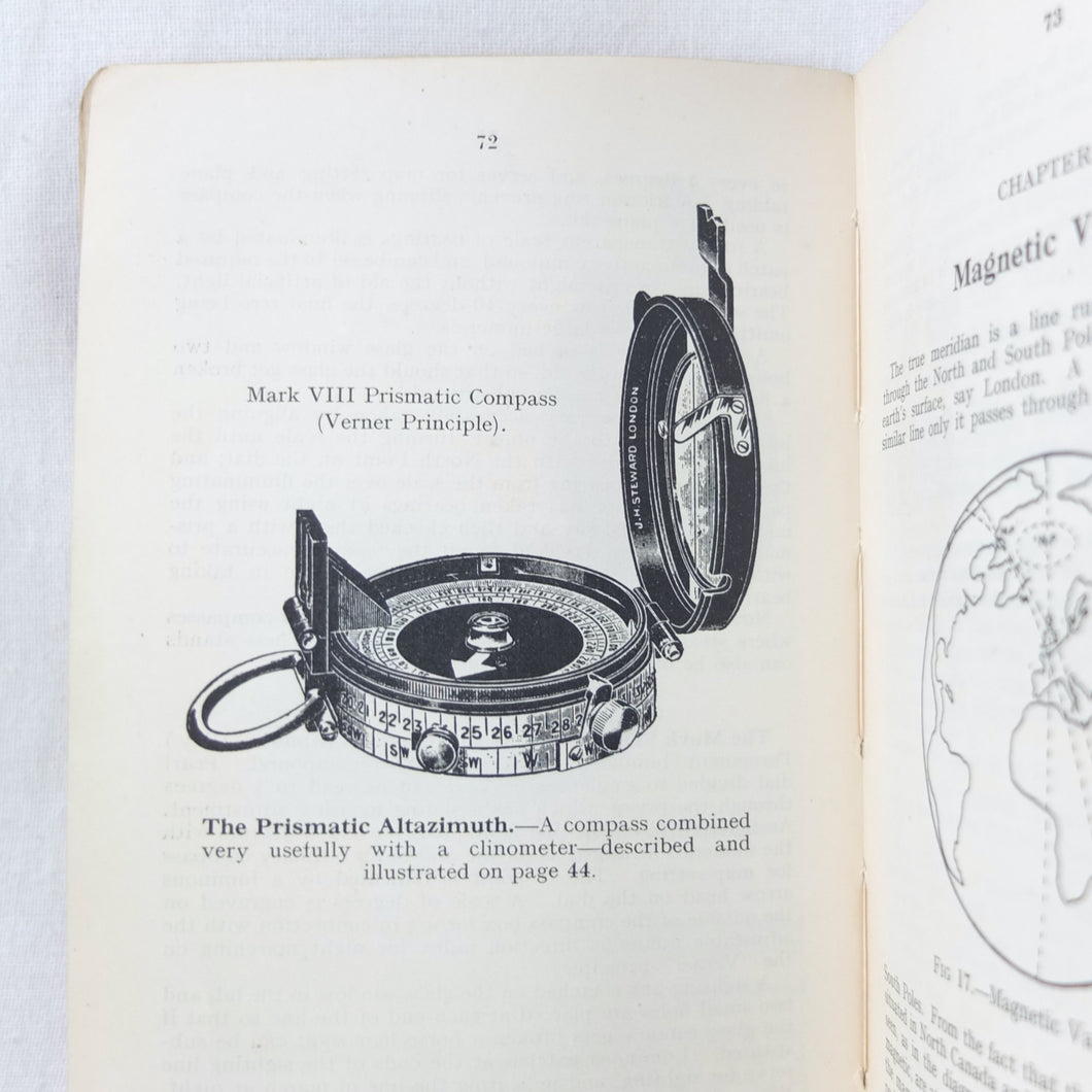 An original WW2 map and Compass manual by the celebrated Everest mountaineer Captain John Noel. Undated, but published c.1940 (there is an advert for one of Noel's other books on the rear endpaper with a quote dated October 1940). The book covers the British Army standard issue compasses and other navigation instruments in use from before WW1 to the 1930s. The Verners Compass, Steward patent Liquid Compass, Mirror Clinometer, and Steward Aero Hypsometer (a wrist altimeter used by the RFC and RAF) are among the instruments described. Their use is discussed and they are illustrated in the book. Compass use and map reading are covered in detail. Fully illustrated with more than 50 drawings and diagrams.
