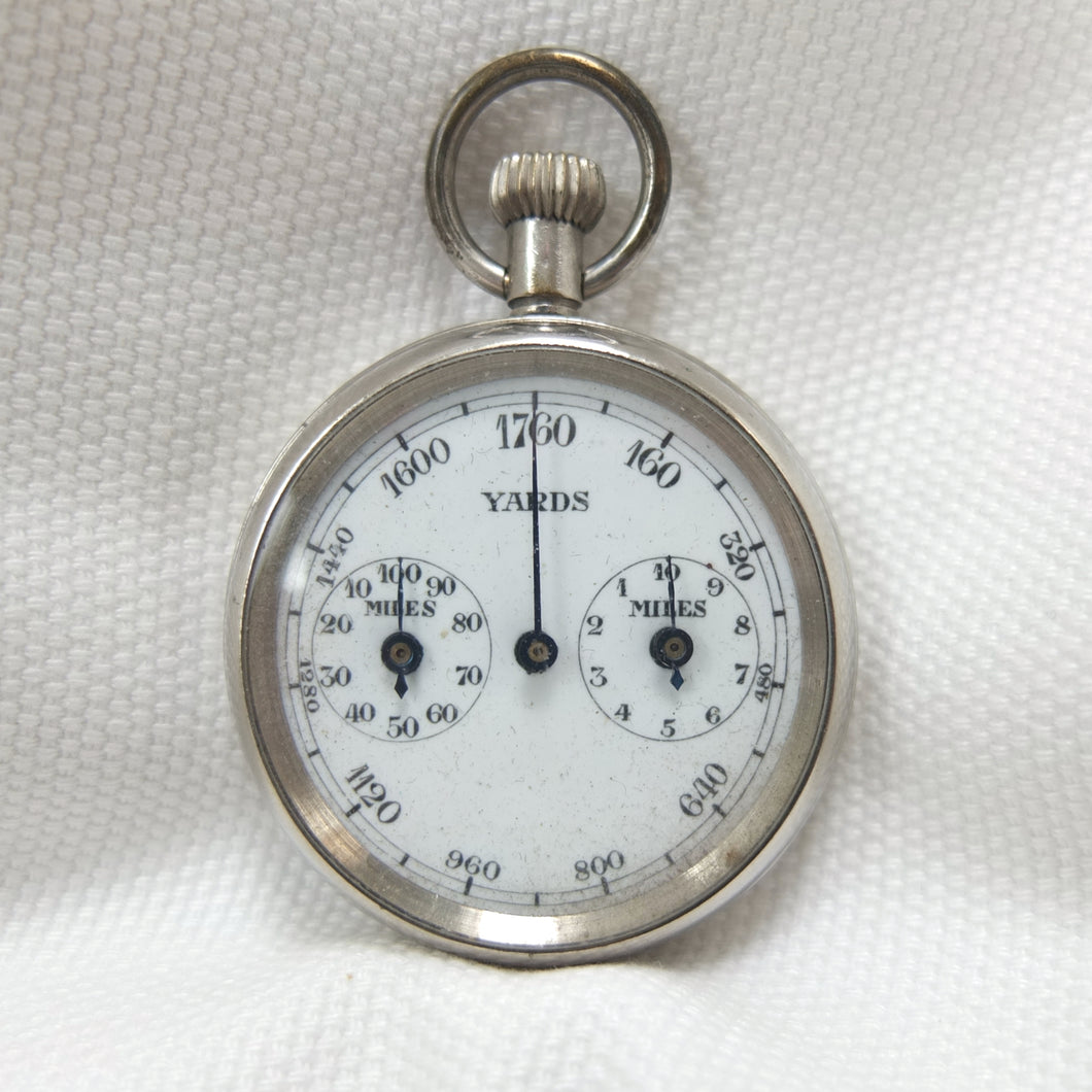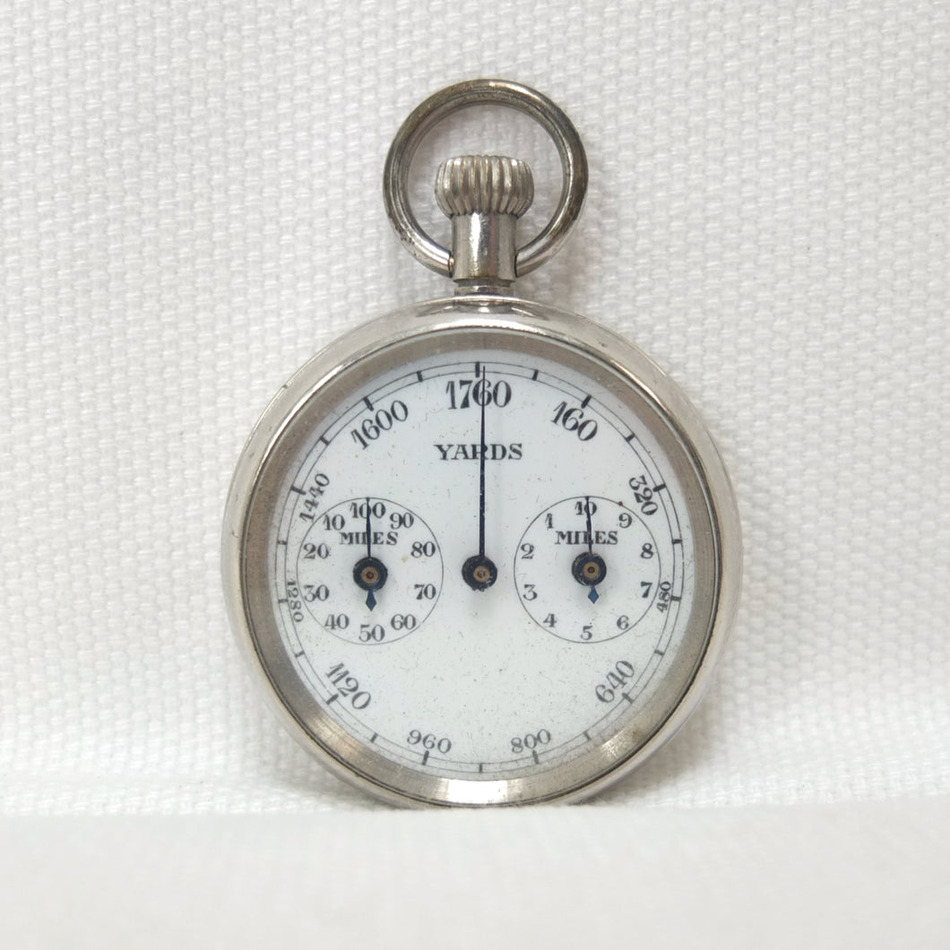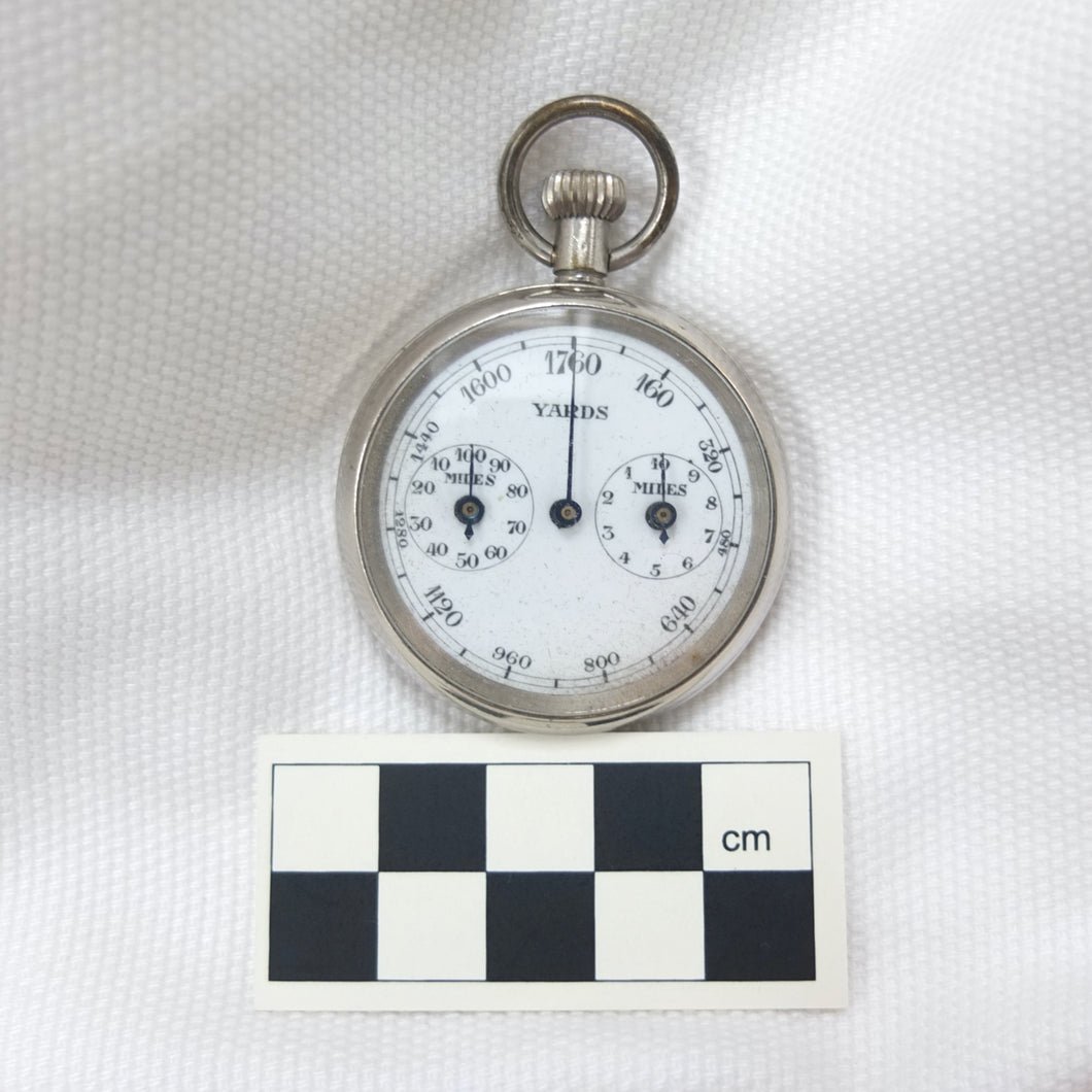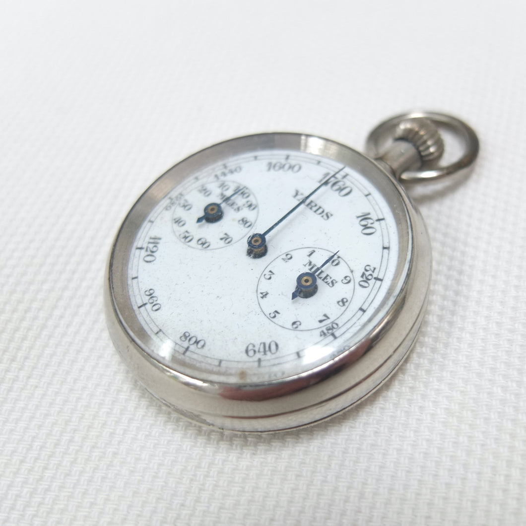 A nickel-plated brass cased pedometer, dating from c.1914. With a white enamel dial, blued pointers, and bevelled glass. The three scales on the dial are 0-1760 yards (1 mile), 1-10 miles, and 10-100 miles. The dials are zeroed by means of a push button at the bow. The detachable belt clip at the bow is marked 'Depose, Paris'. There are no makers marks, but pedometers with exactly this type of dial design were produced by the well-known French maker Henri Chatelain from the late 19th century to the early 20th century.