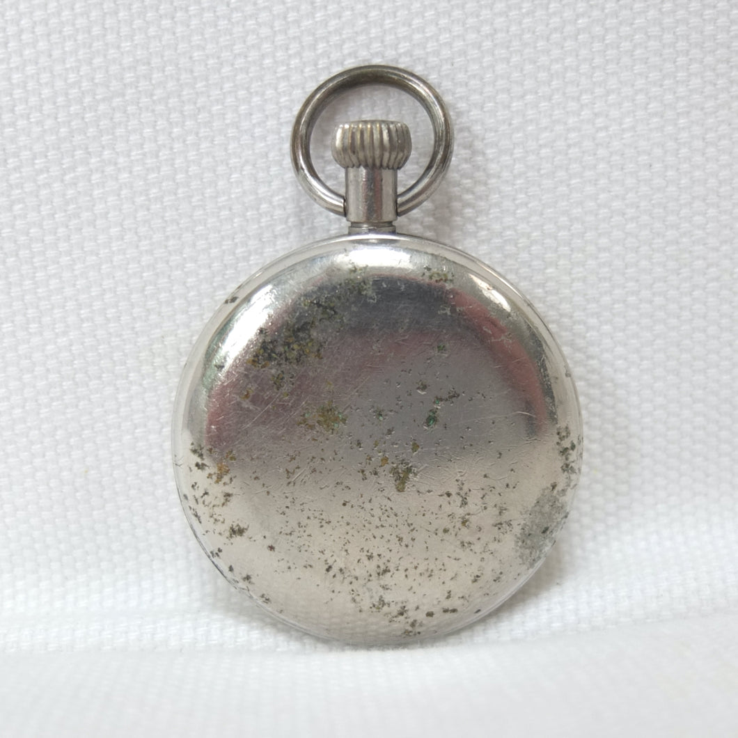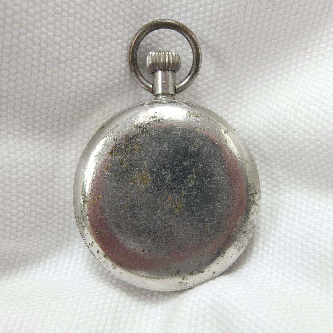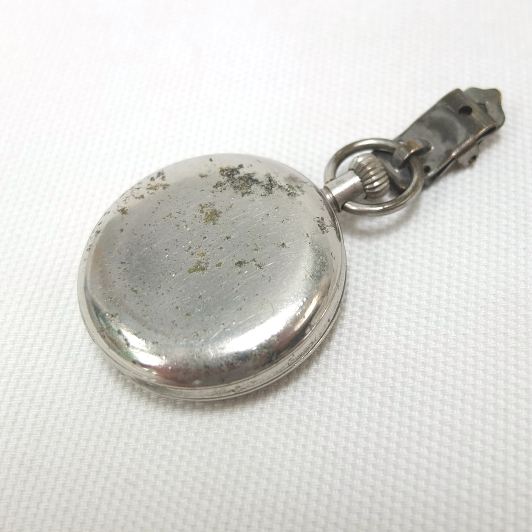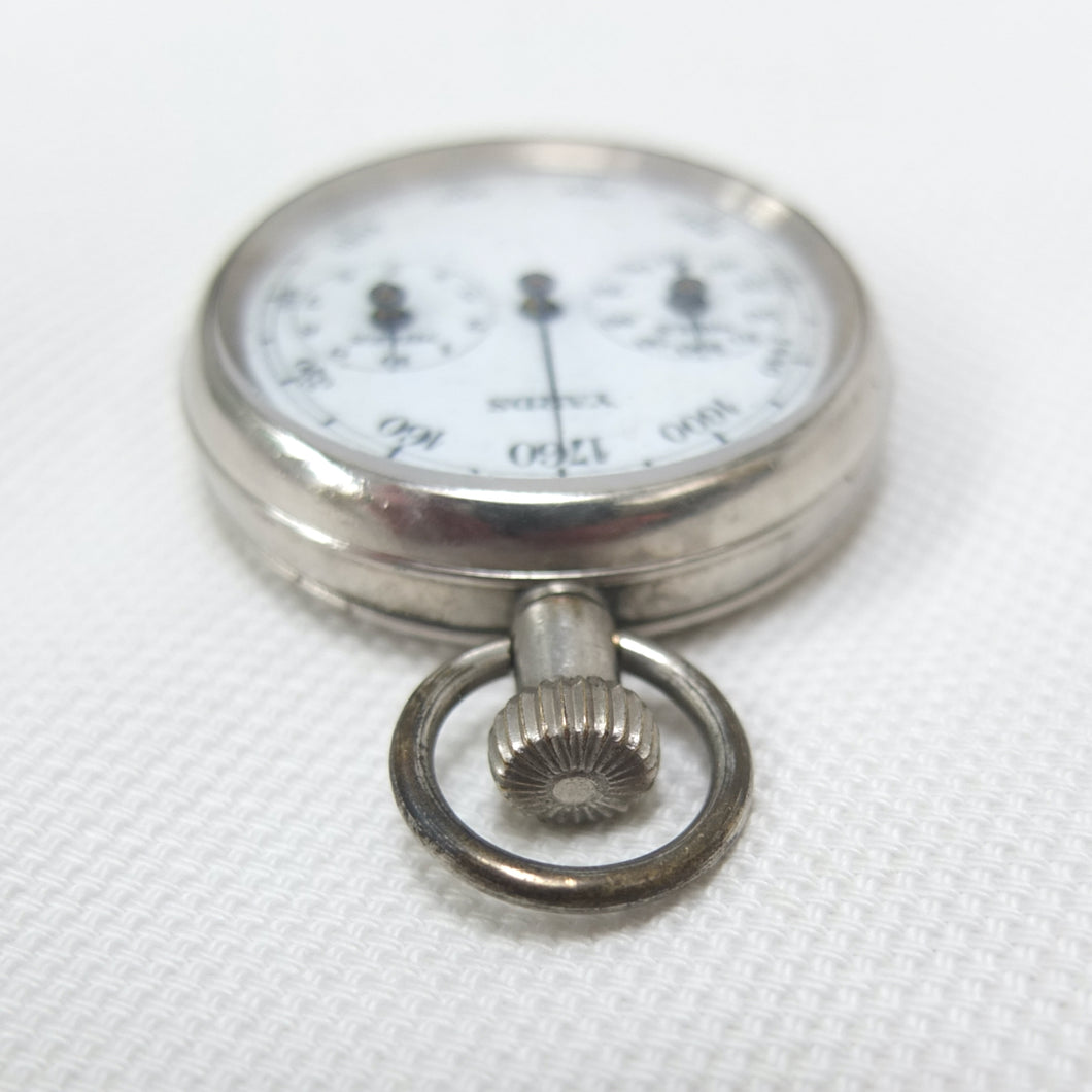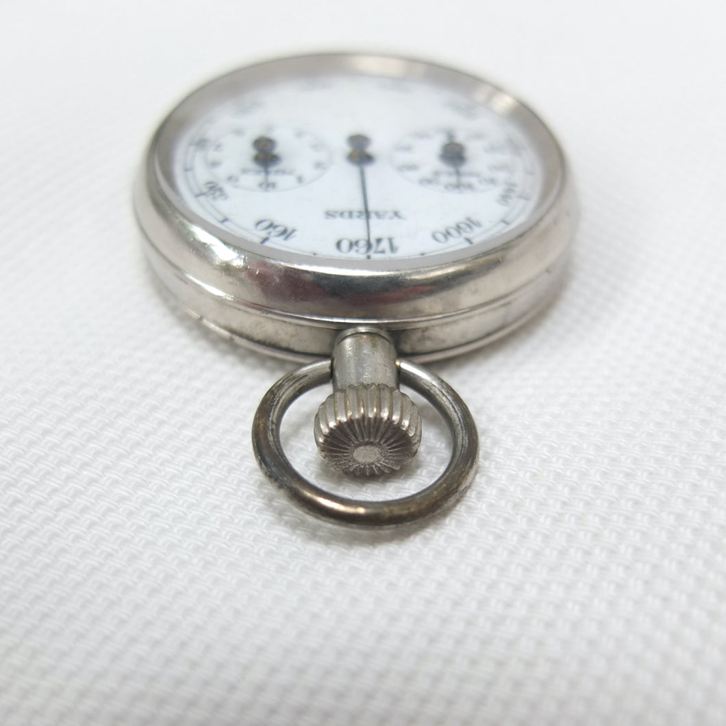 A nickel-plated brass cased pedometer, dating from c.1914. With a white enamel dial, blued pointers, and bevelled glass. The three scales on the dial are 0-1760 yards (1 mile), 1-10 miles, and 10-100 miles. The dials are zeroed by means of a push button at the bow. The detachable belt clip at the bow is marked 'Depose, Paris'. There are no makers marks, but pedometers with exactly this type of dial design were produced by the well-known French maker Henri Chatelain from the late 19th century to the early 20th century.