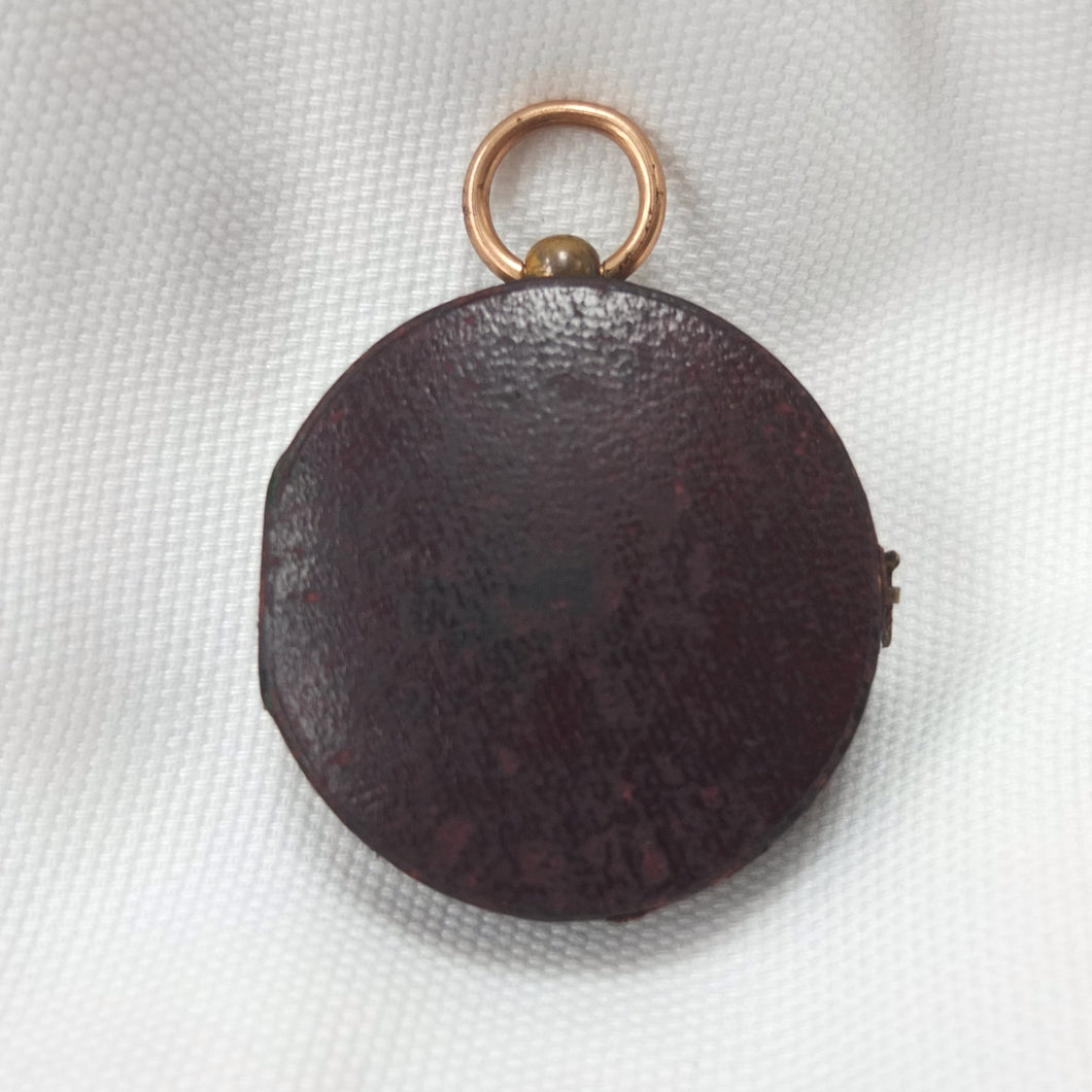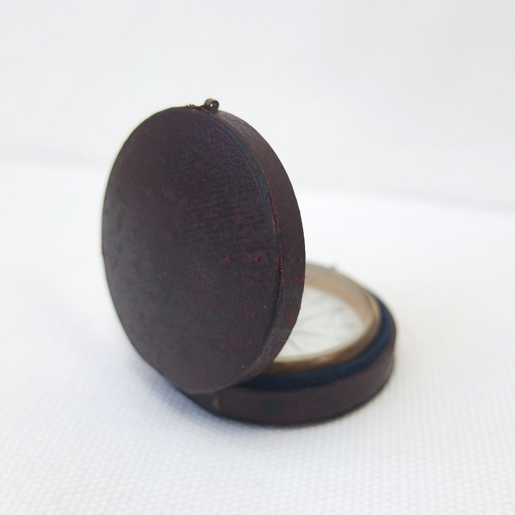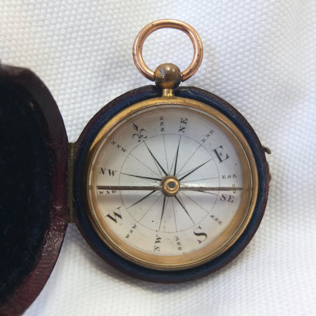 A Georgian Gilt brass pocket compass, made in England, dating from c.1825. With a hand-painted enamel compass card in the classic Georgian style. Although unsigned, this is a high quality compass, from one of the finest English makers. It has a Gilt brass case, bar needle and jewelled pivot. There is a fully functional transit lock operated by a tiny lever behind the bow. This type of transit lock is only seen in late 18th century and early 19th century compasses. The compass comes complete with its original velvet lined morocco leather case.